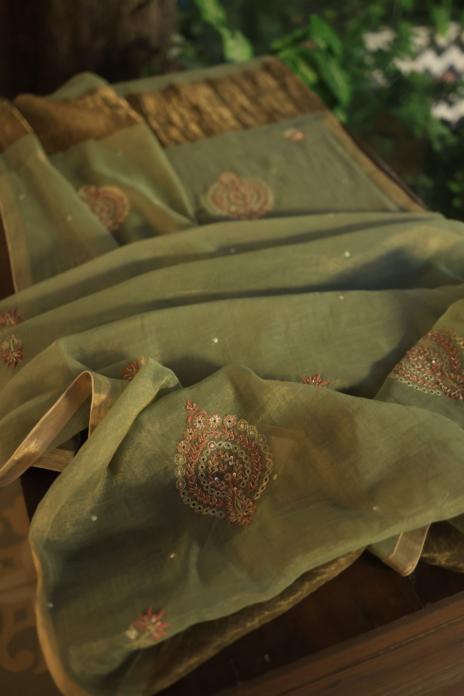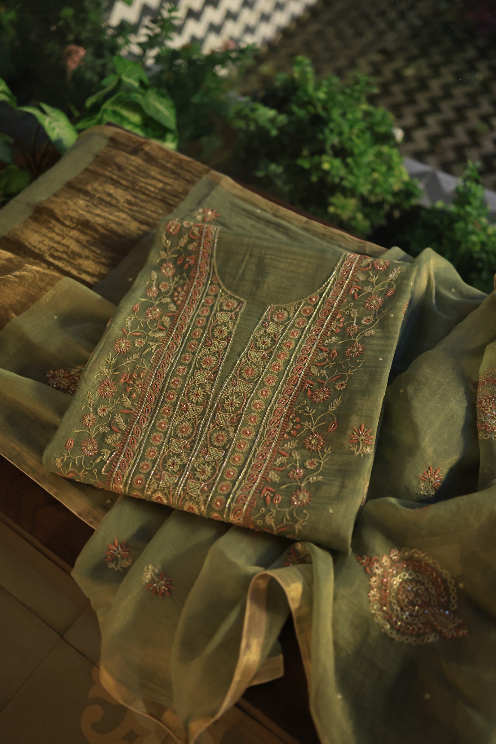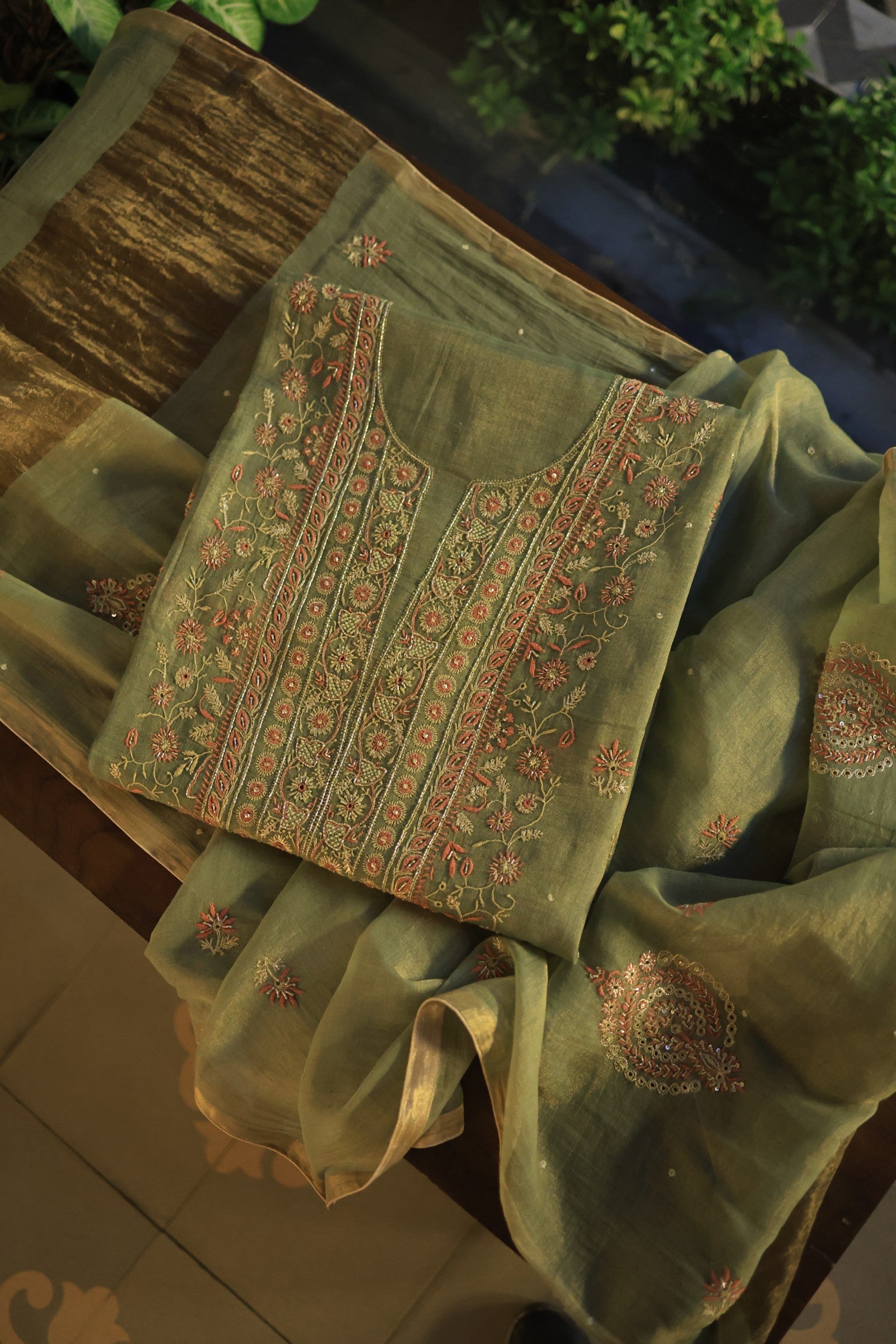 Fern Green Tissue Silk Chikankari Unstitched Fabric