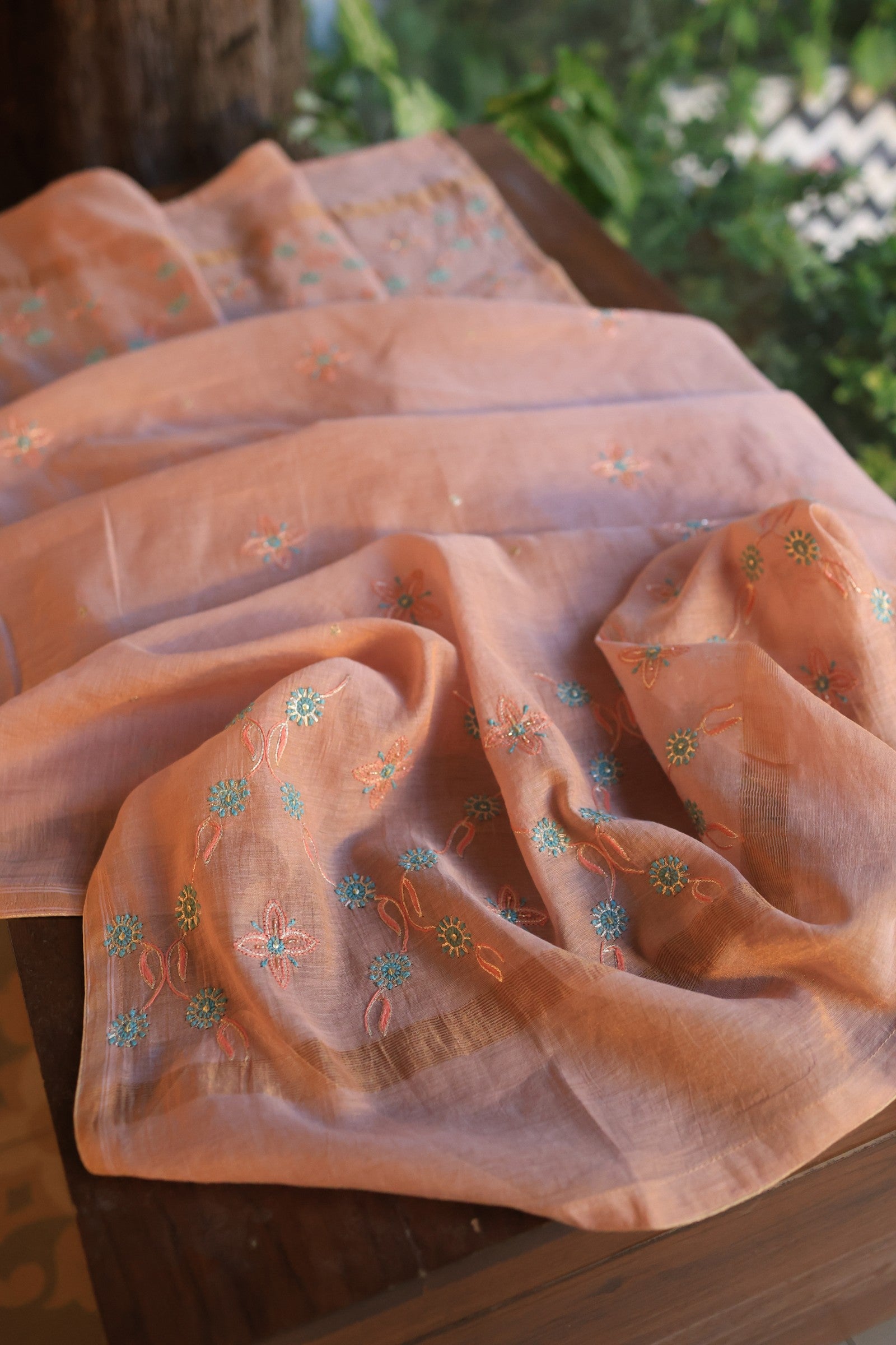 Intricate Chikankari done on darker shades of tissue fabric with dainty sequins/beads work giving it a dash of bling clubbed tissue silk dupatta.