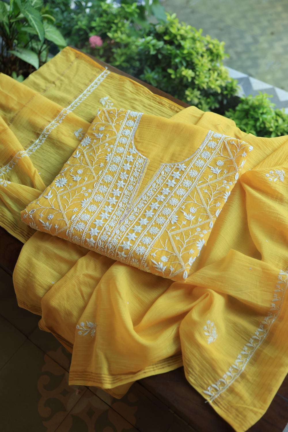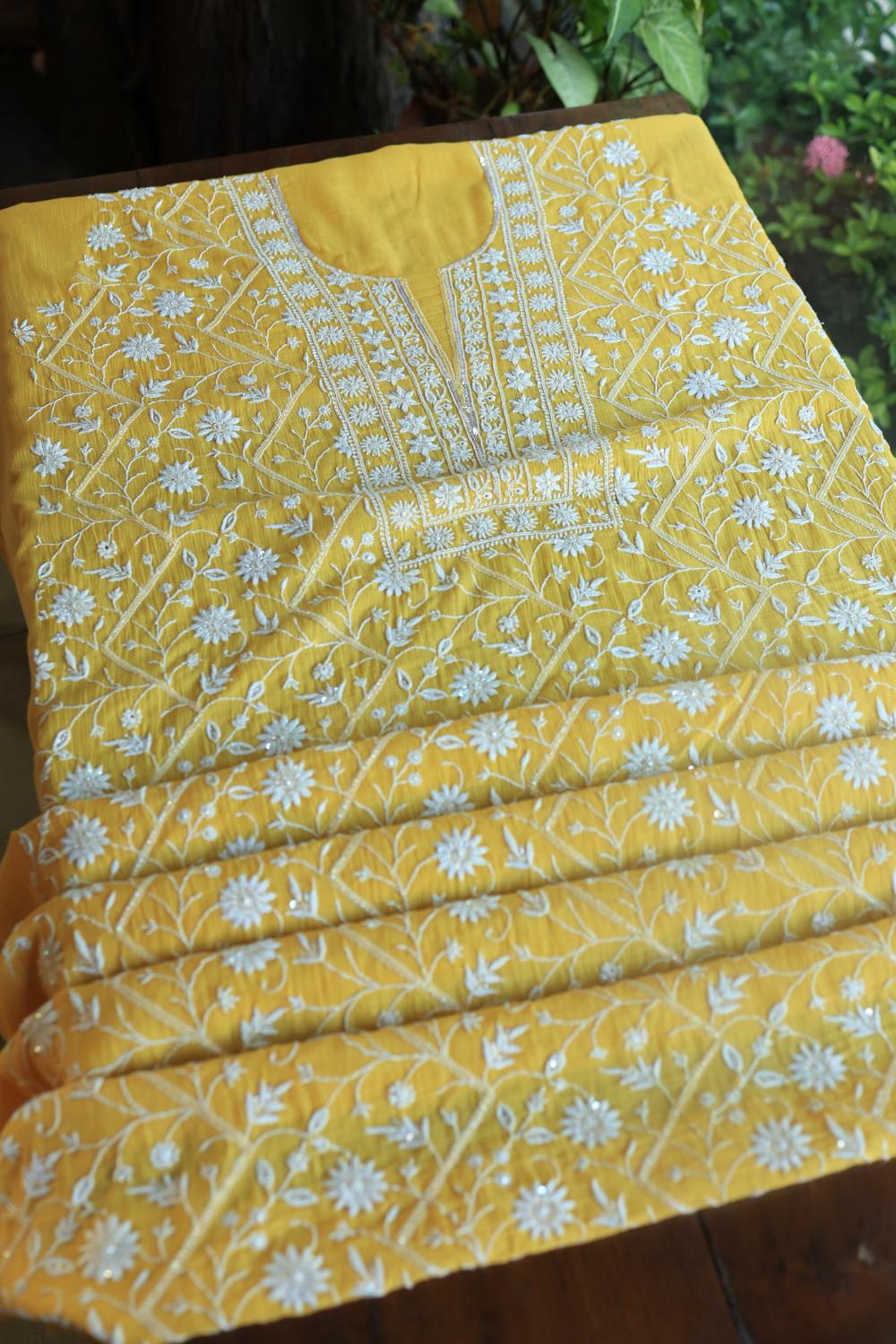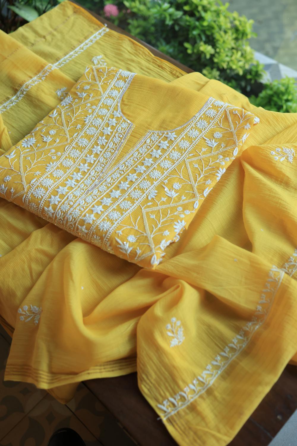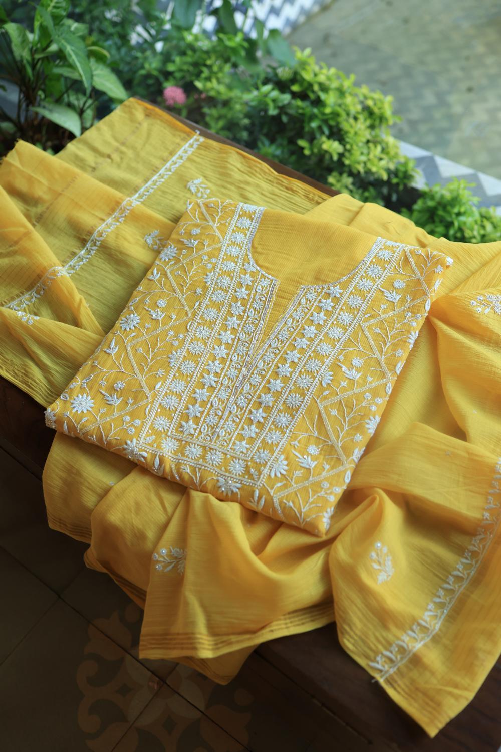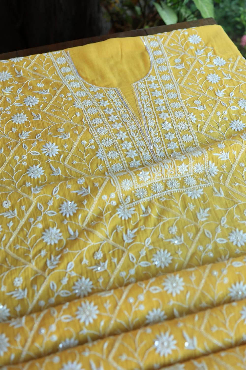Dull Yellow Mal Chanderi Silk Chikankari With Sequins Unstitched Kurta Dupatta Set
