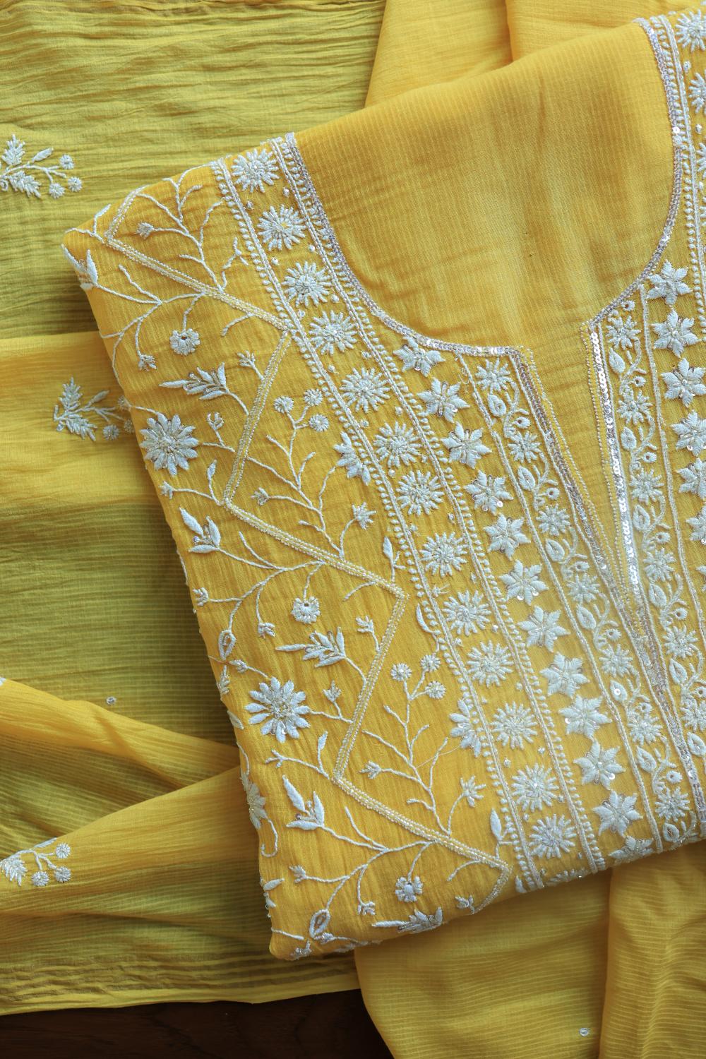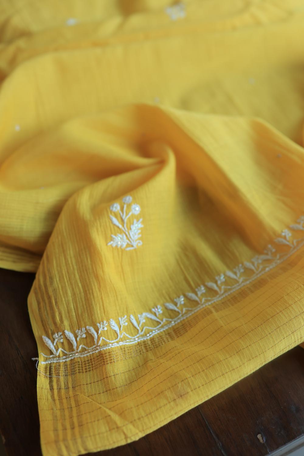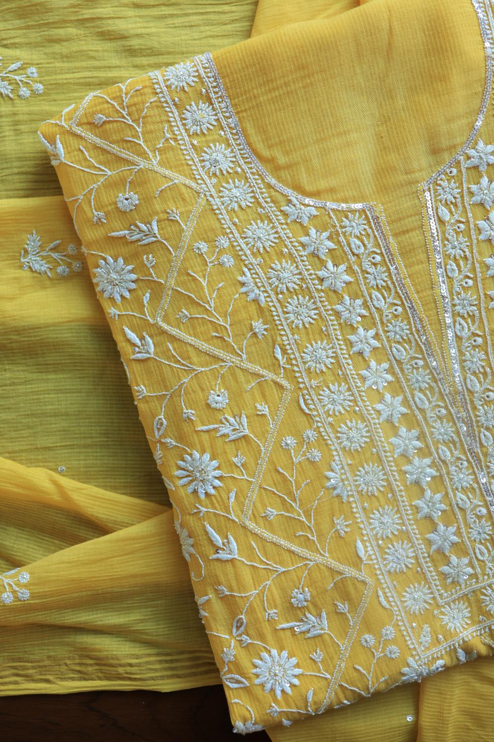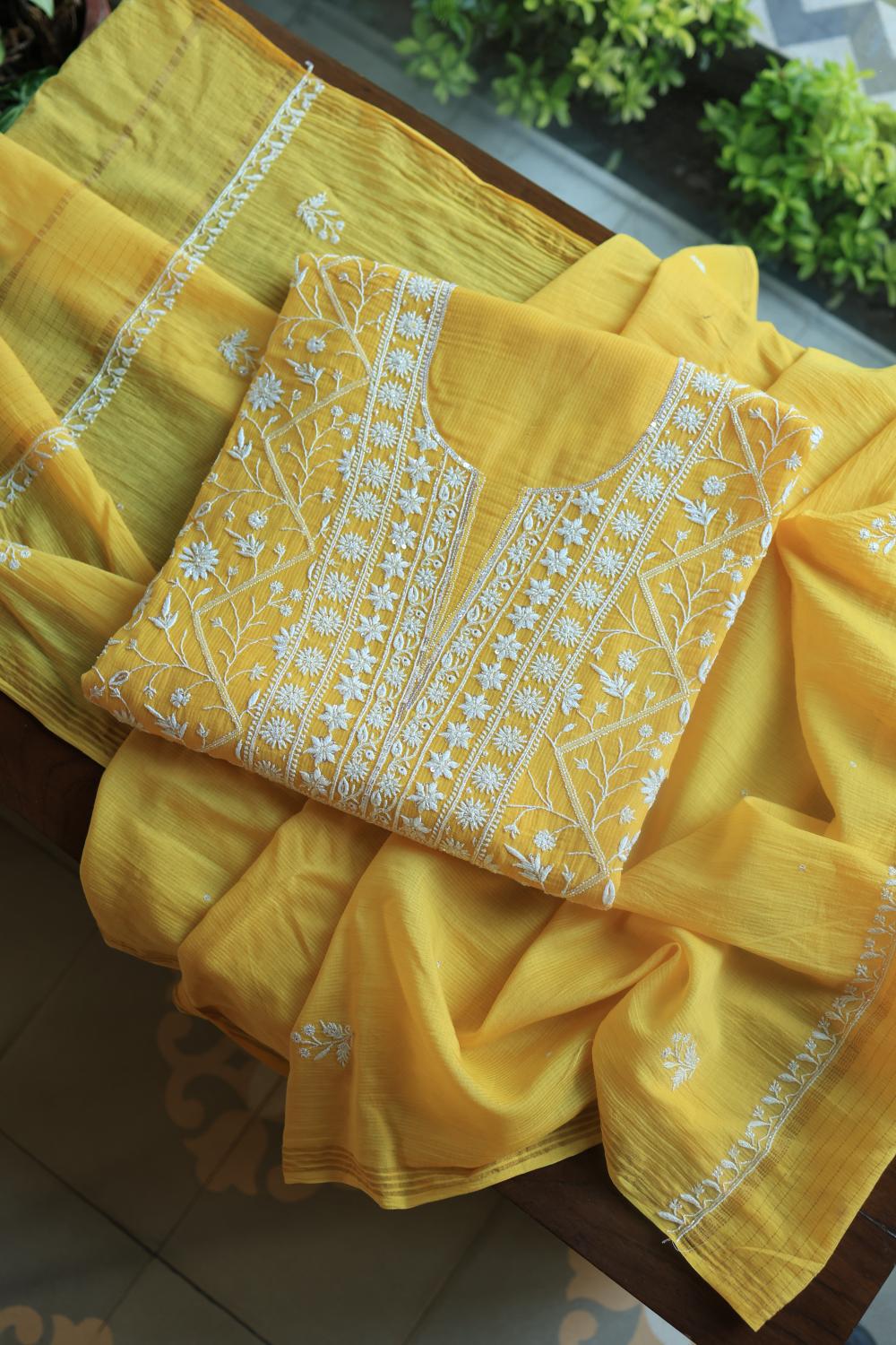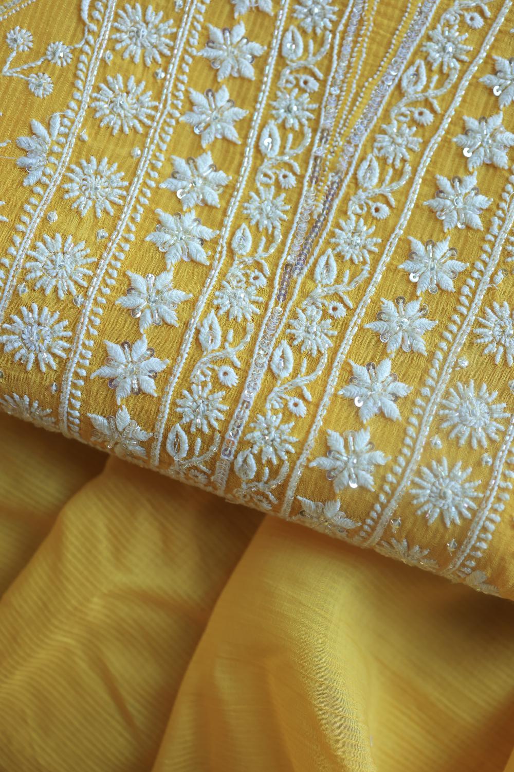 Dull Yellow Mal Chanderi Silk Chikankari With Sequins Unstitched Kurta Dupatta Set