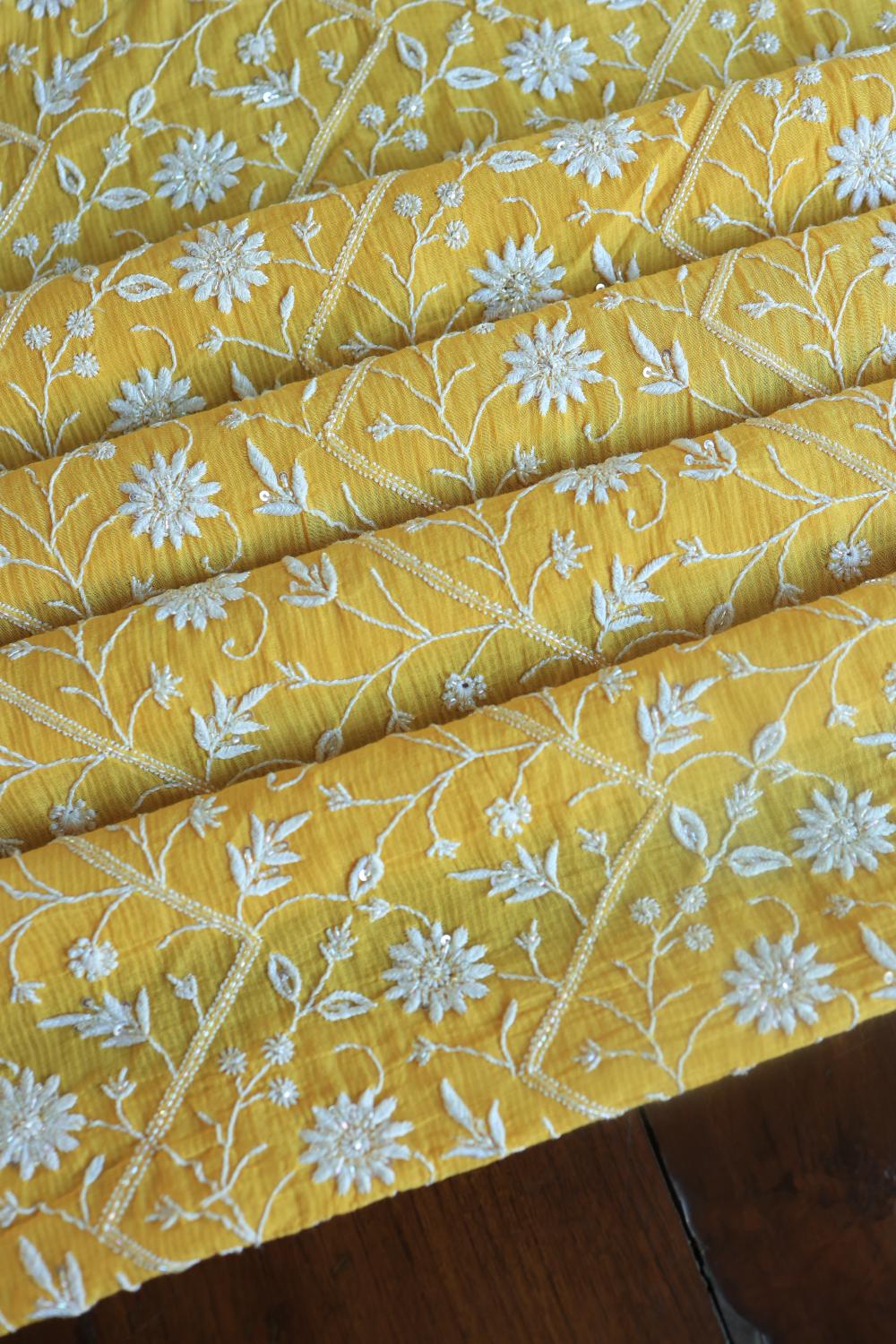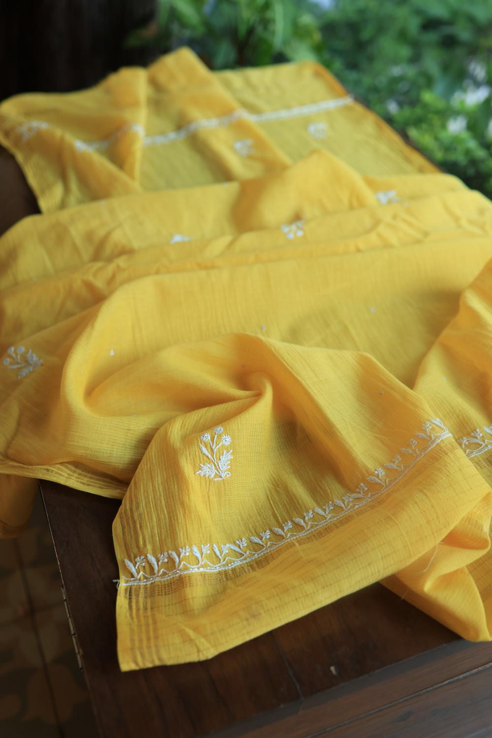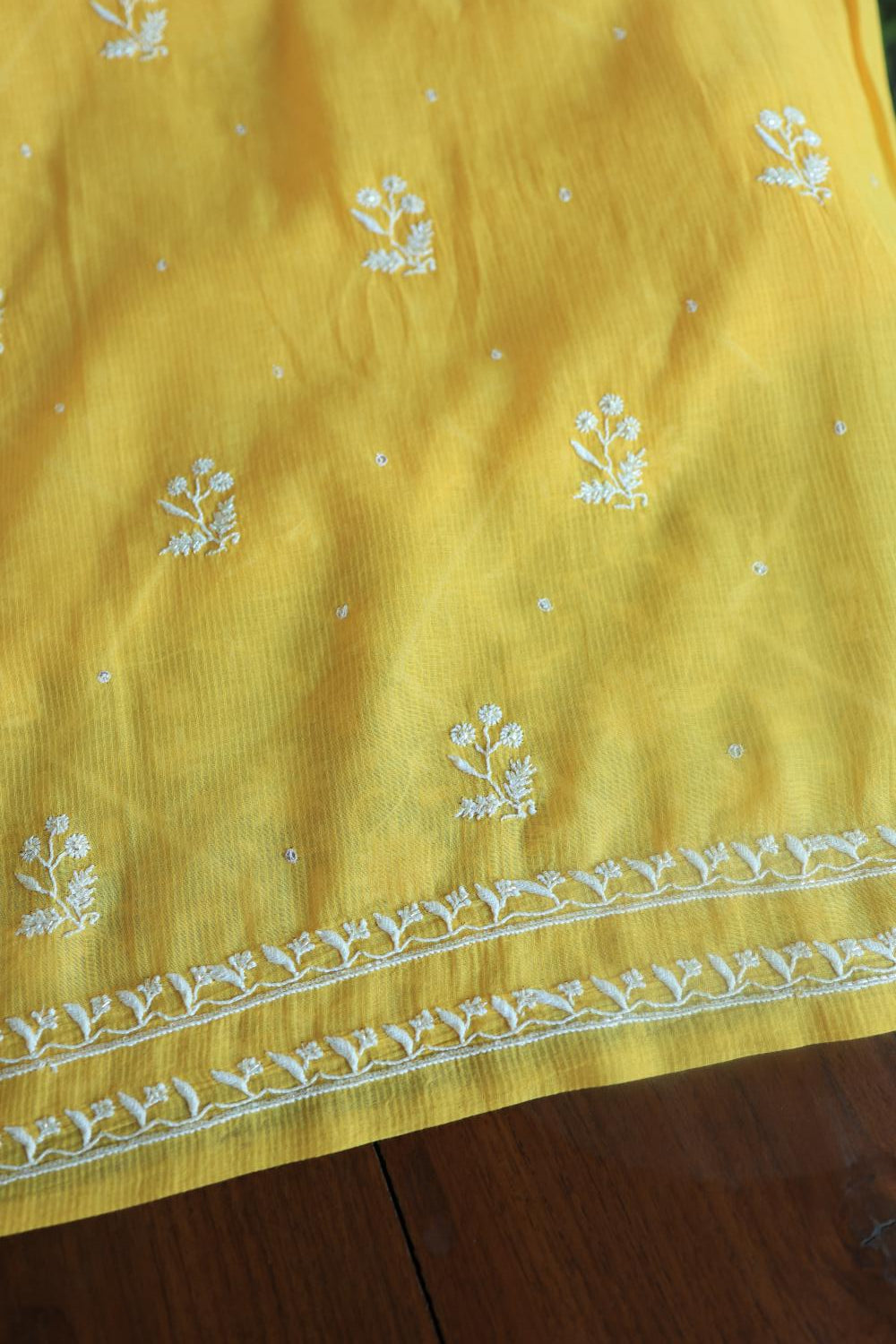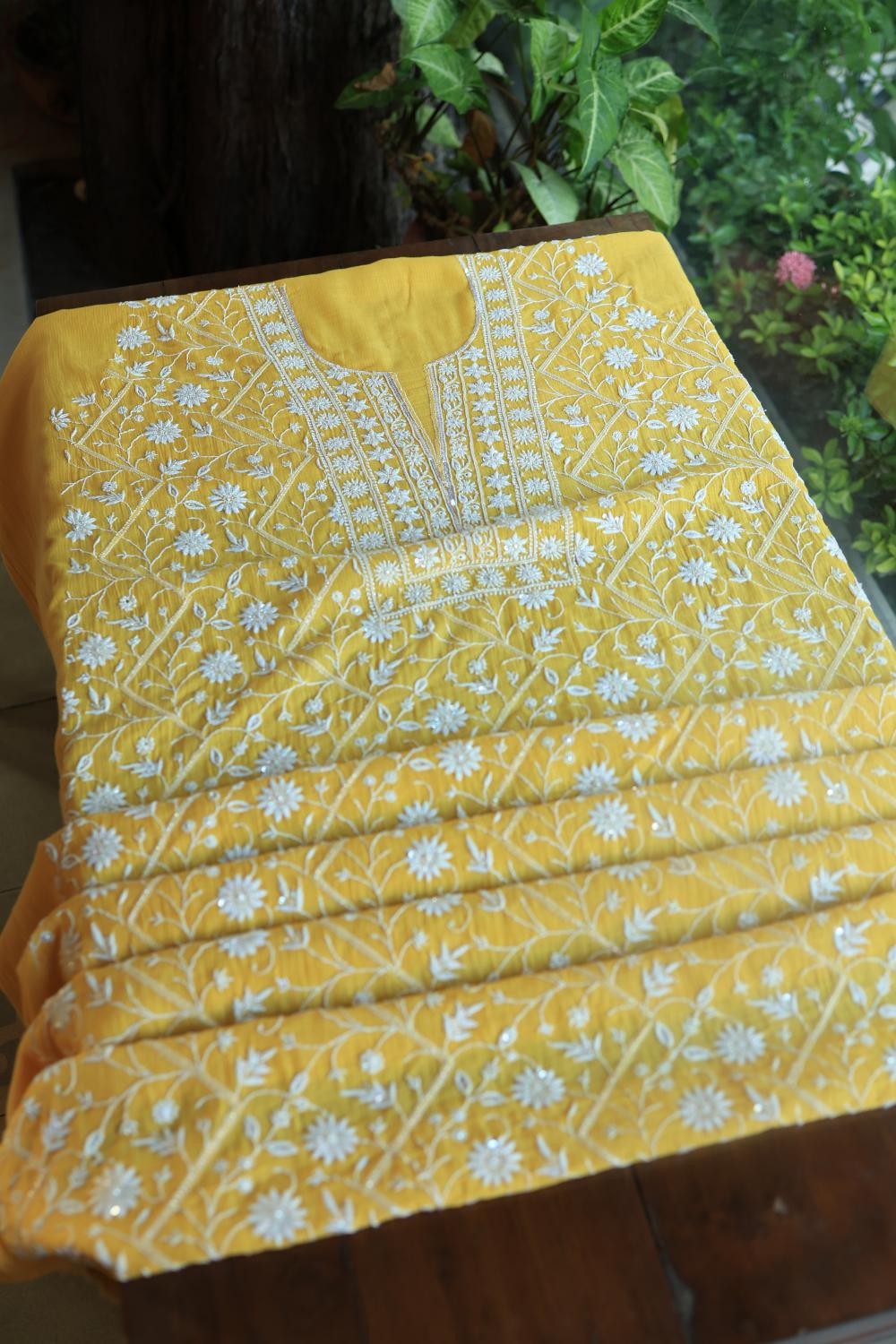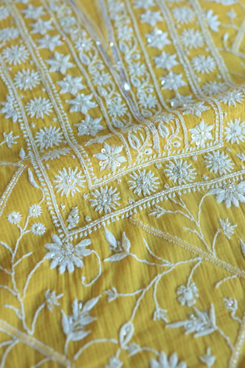 Dull Yellow Mal Chanderi Silk Chikankari With Sequins Unstitched Kurta Dupatta Set