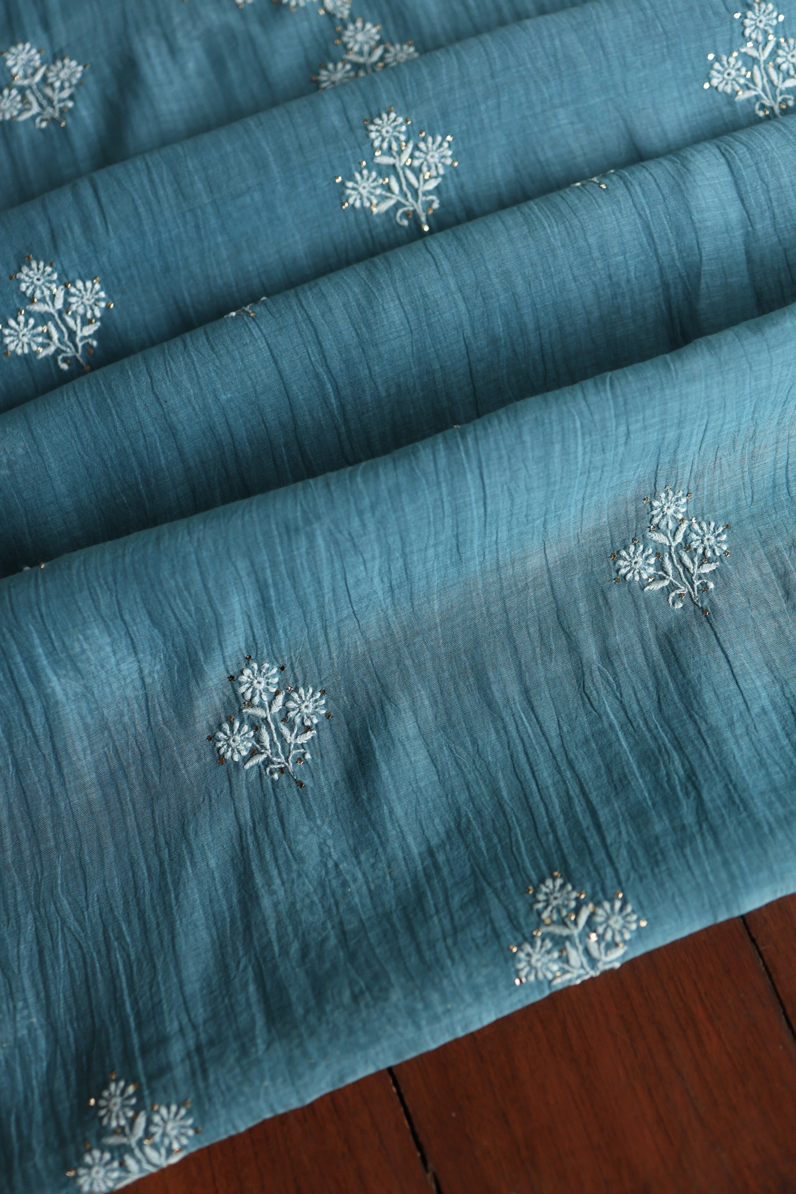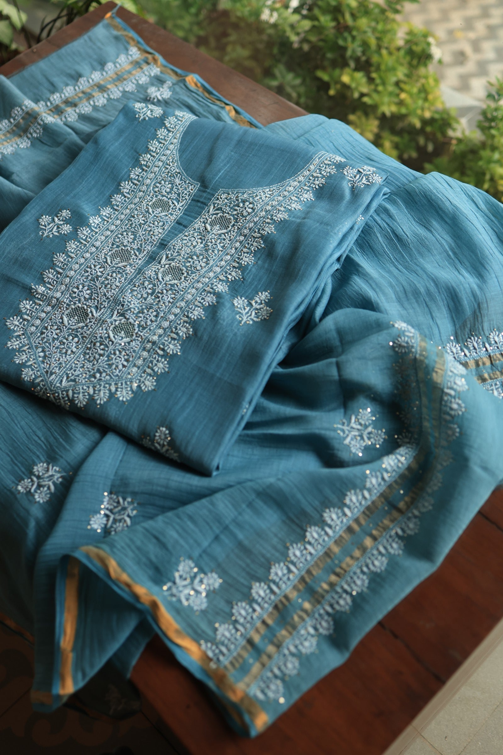 Dusky Blue Shade Mal Cotton Chikankari Unstitched Fabrics With Kamdani