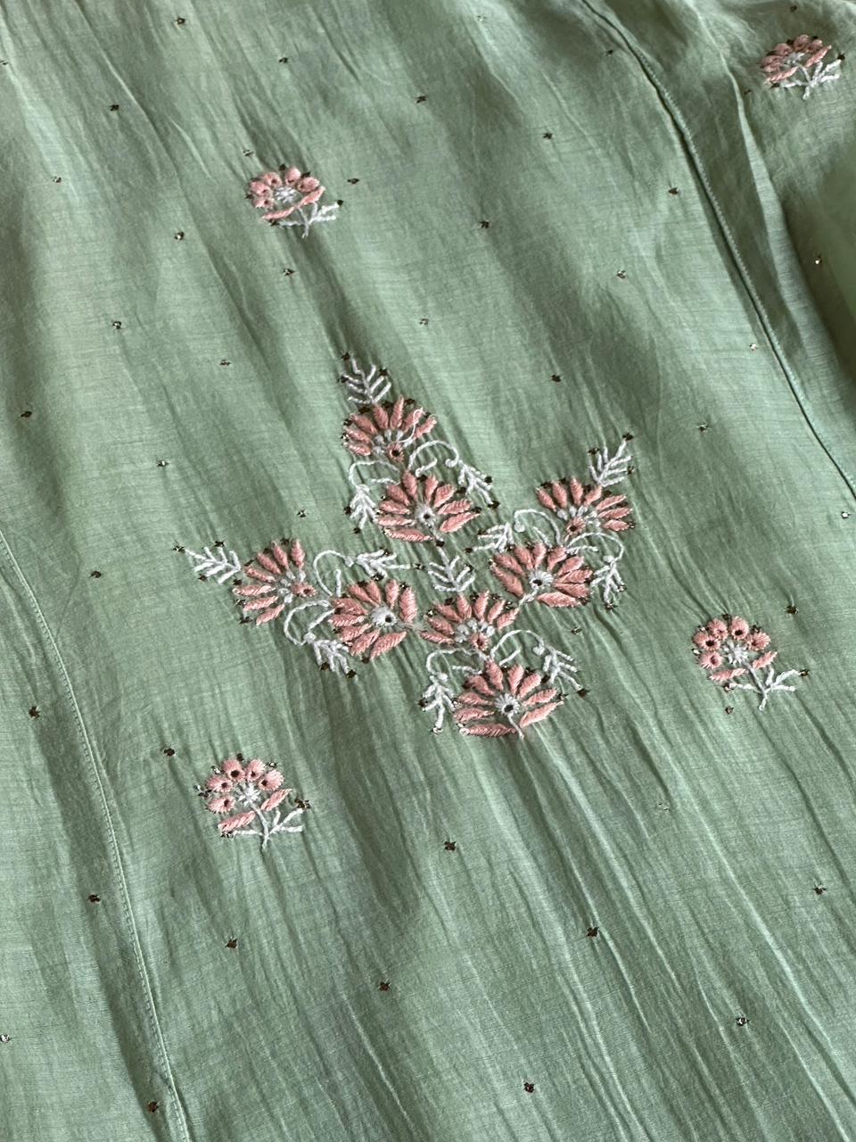 Pastel Olive Shade Malmal Mukaish Kamdani Chikankari Stitched Kurta Dupatta Set