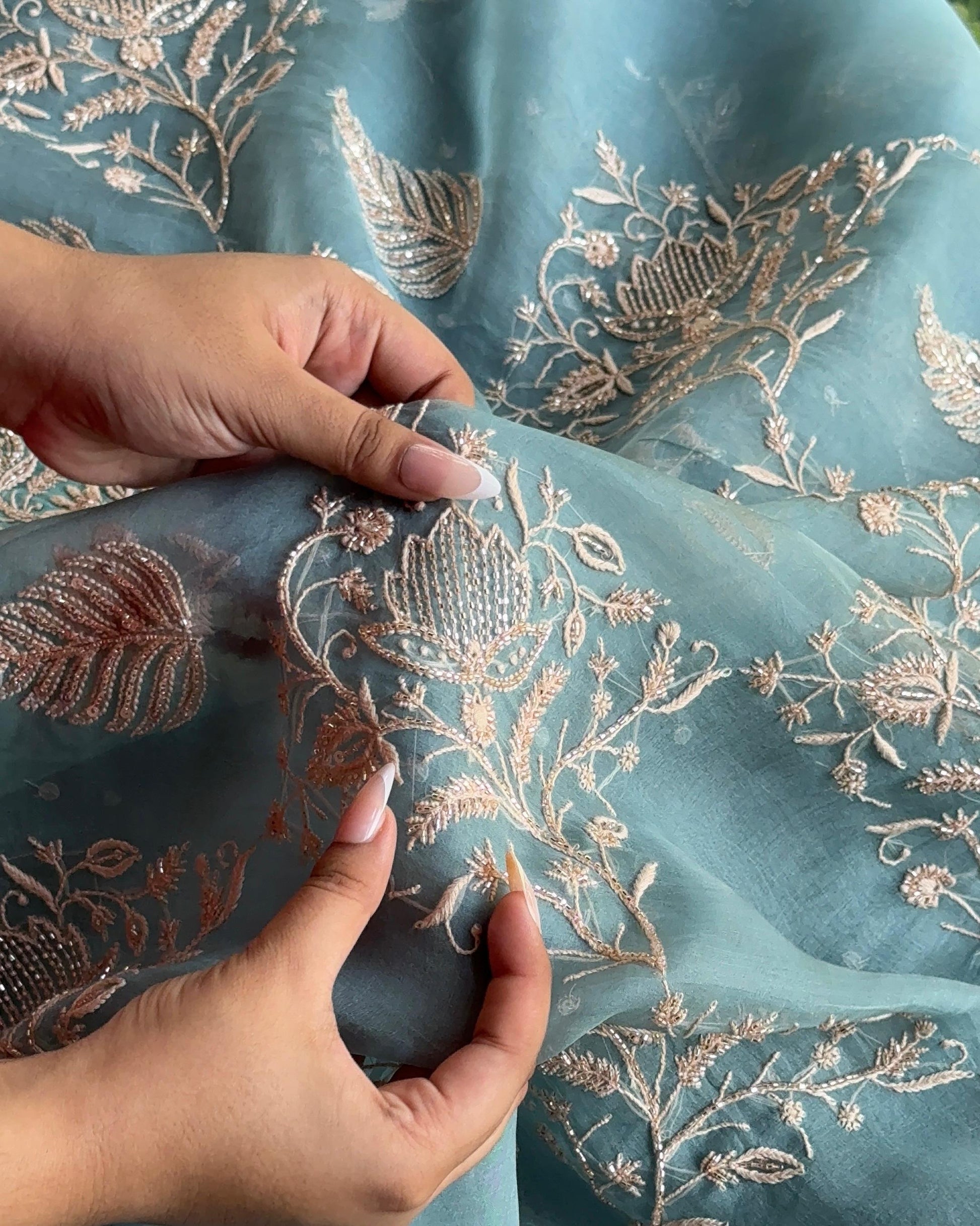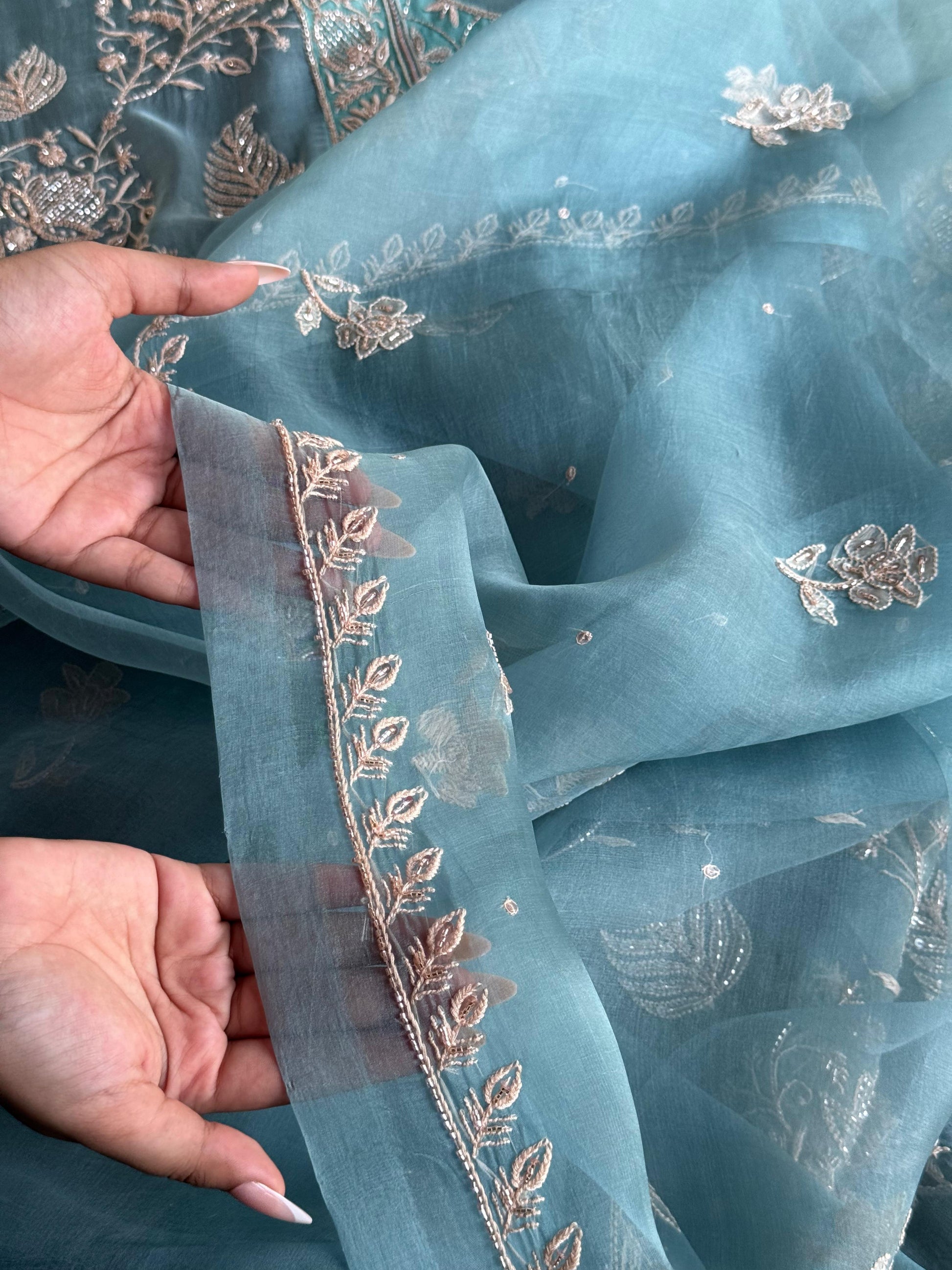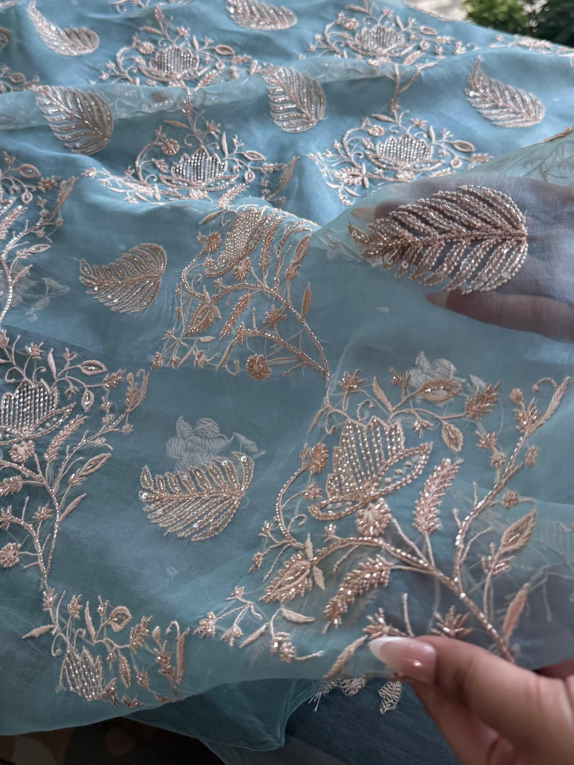 Boxed pattern jaal done on 𝓞𝓻𝓰𝓪𝓷𝔃𝓪 fabric on pastel shade done with contrasting powder peach chikankari embroidery and our signature ari & beads work.
