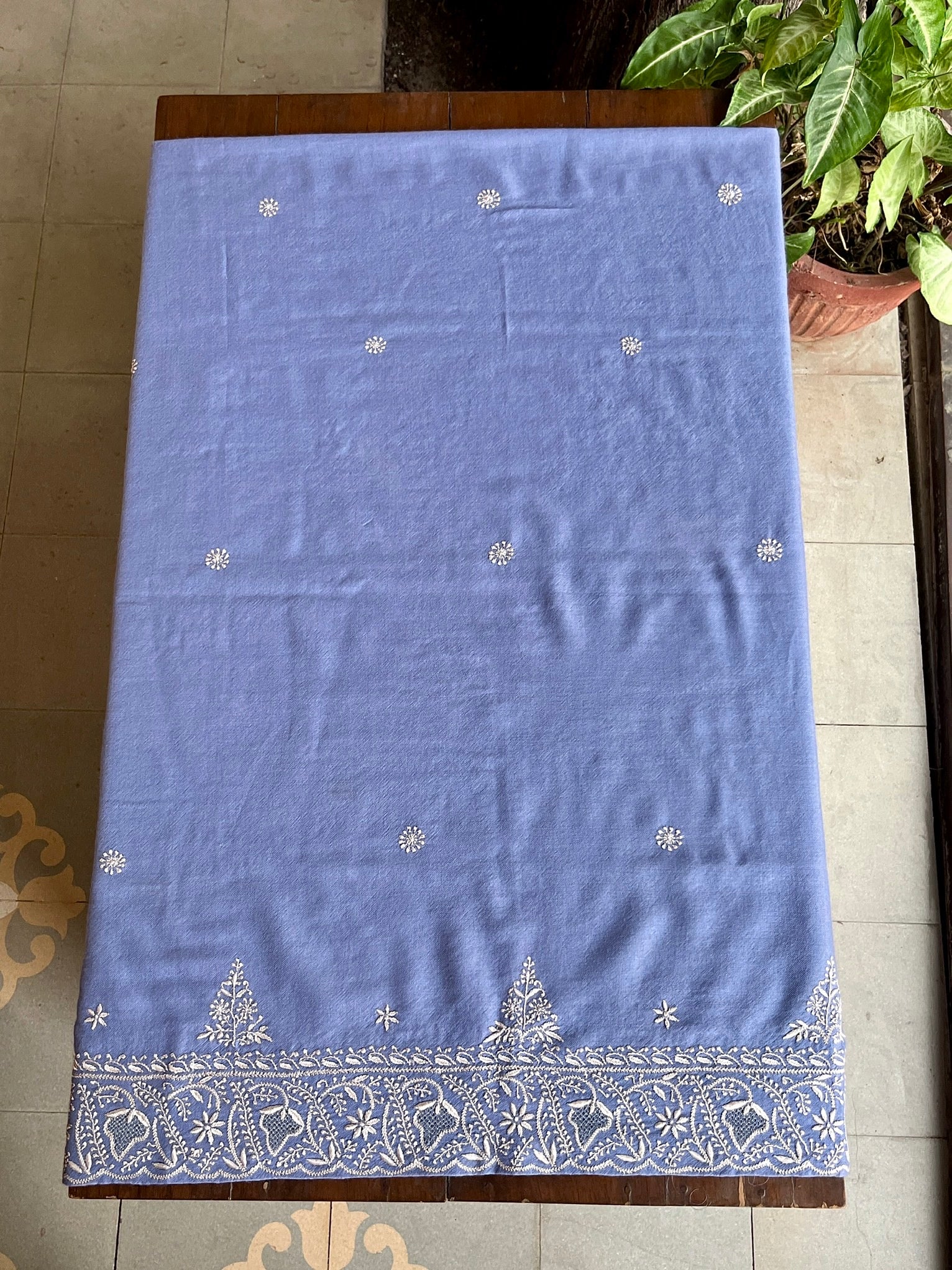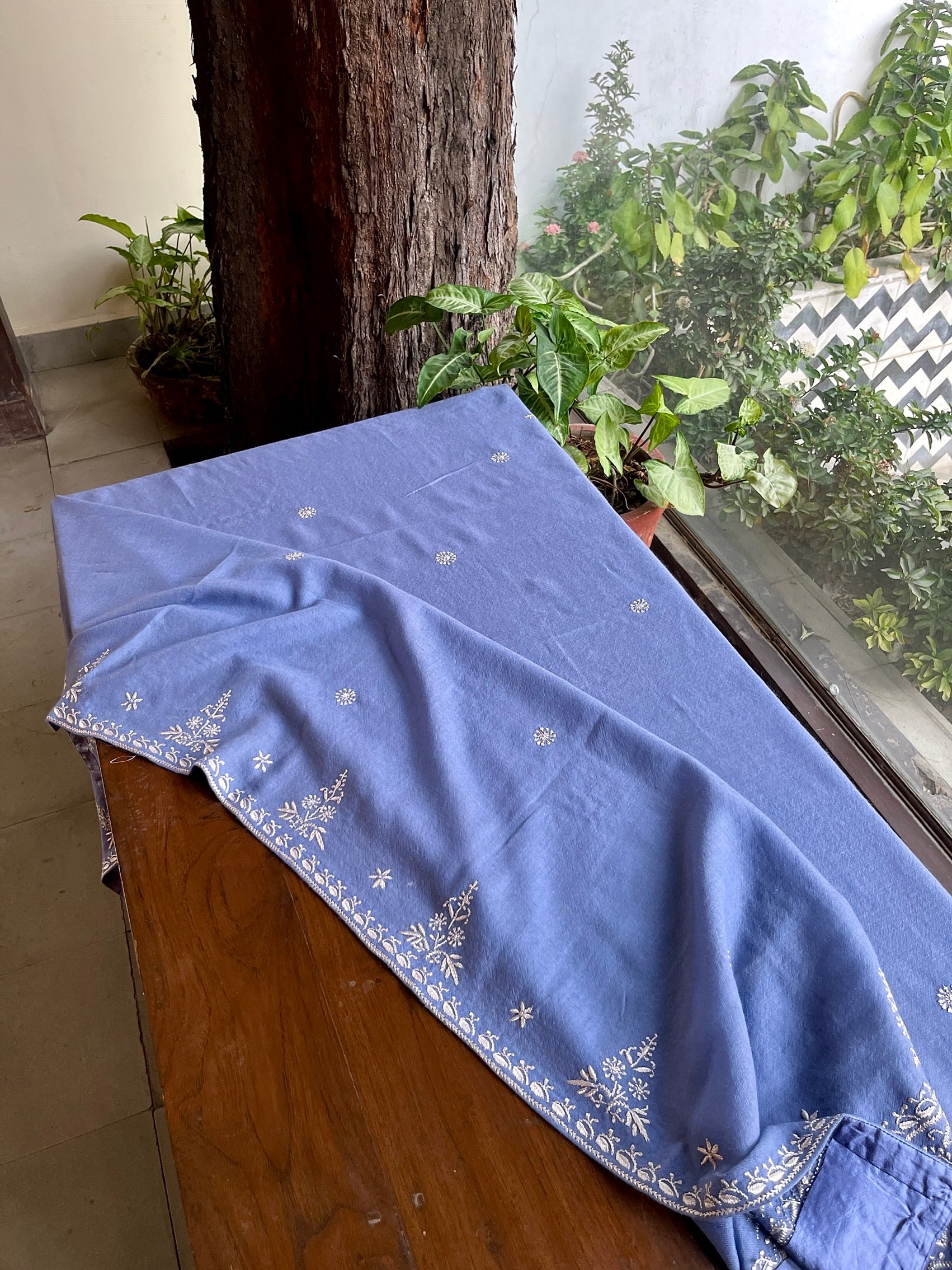 Soft shades of valley on Pashmina weaved stole/shawl done with our signature resham Chikankari and finished with satin on all four sides.