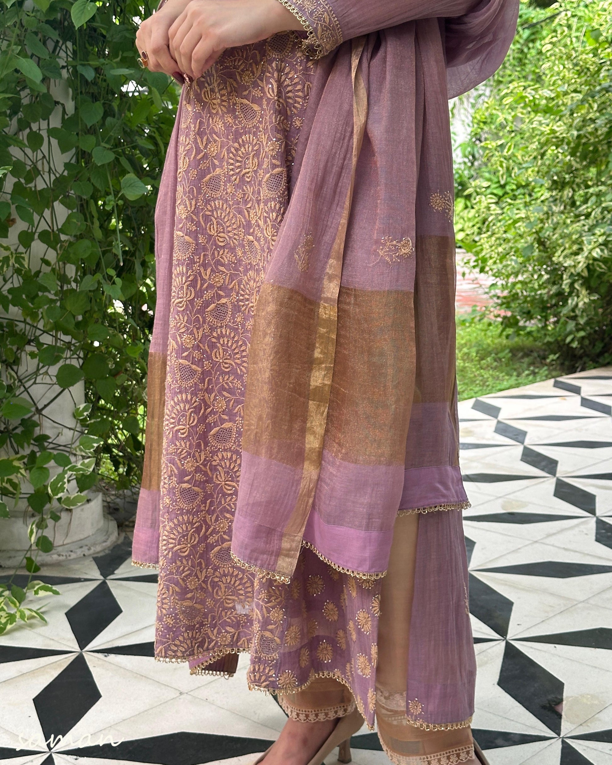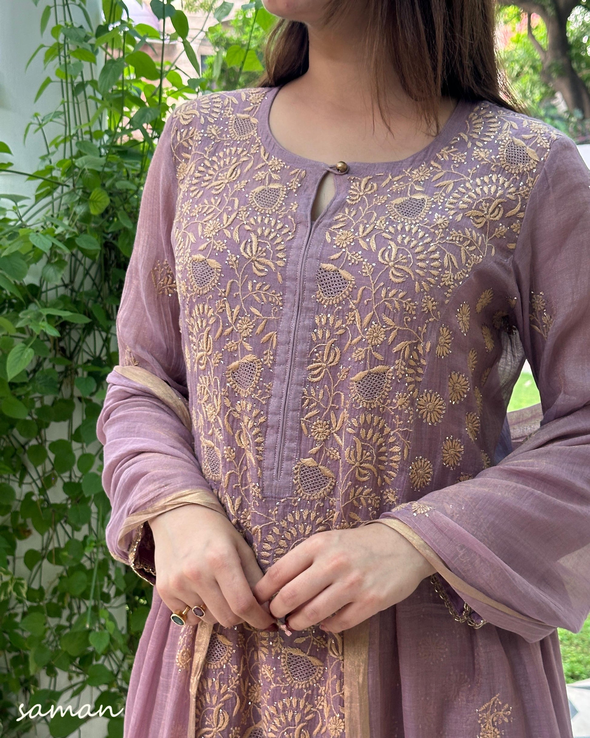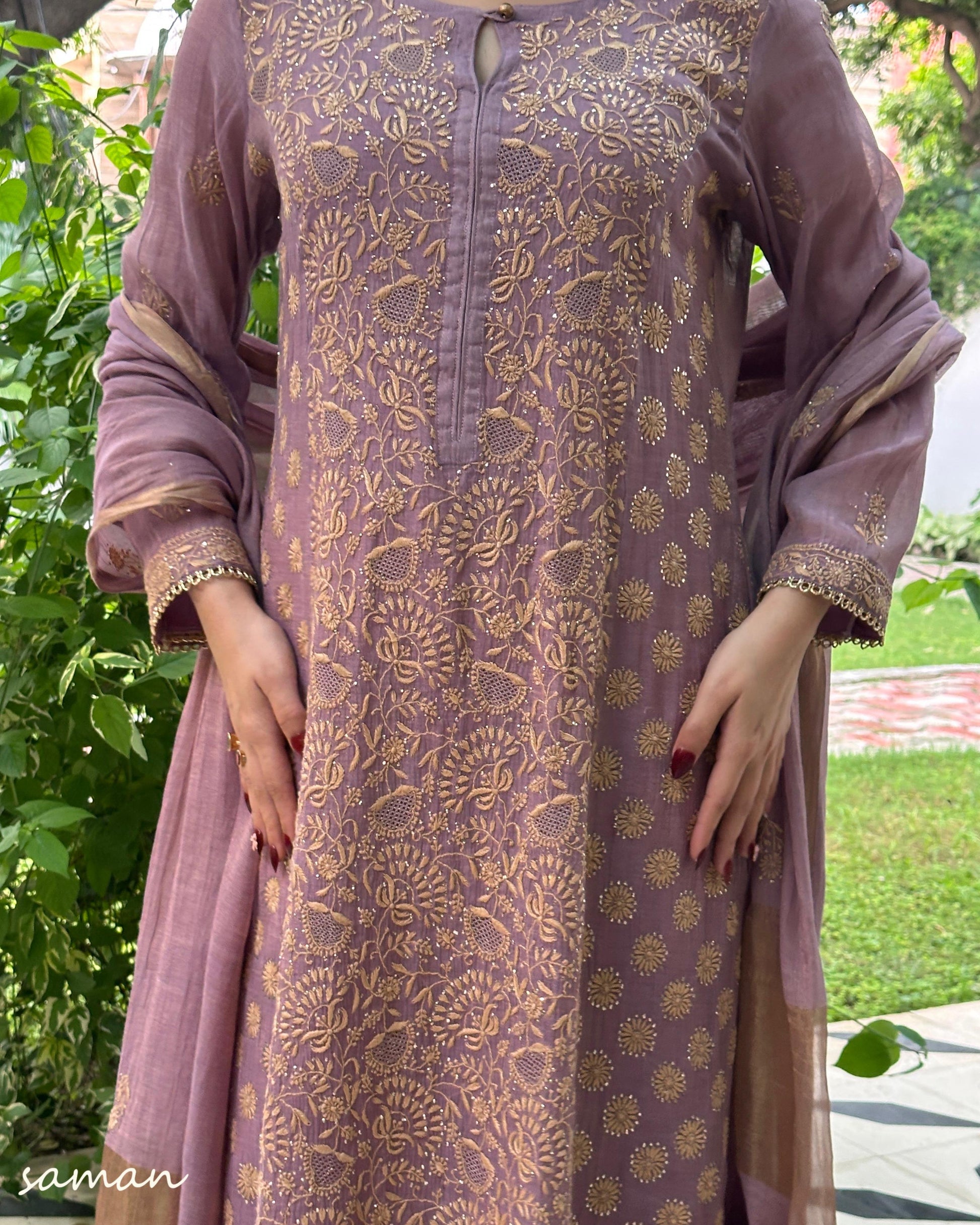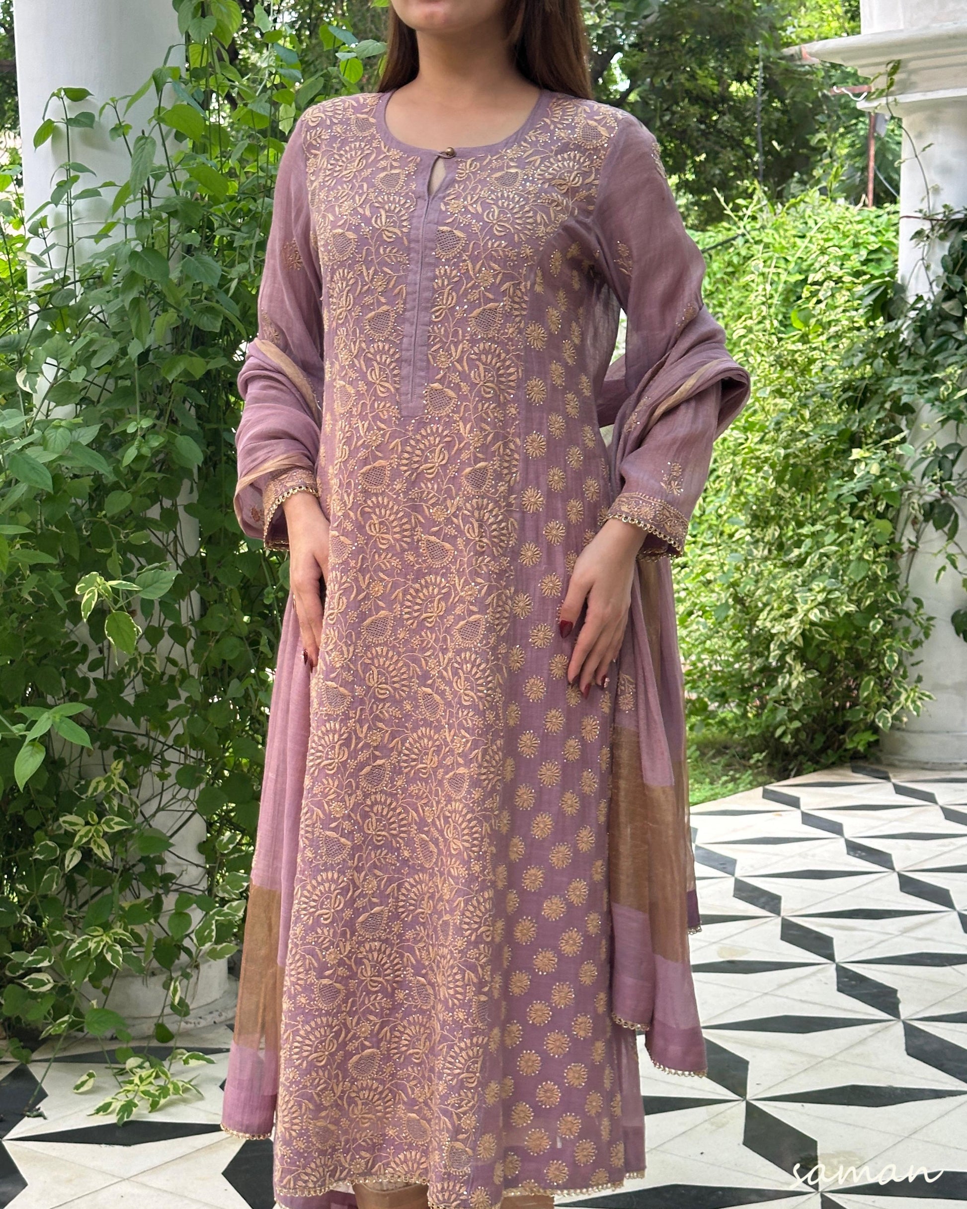 Dusty Lilac Tissue Silk Chikankari Kurta Set