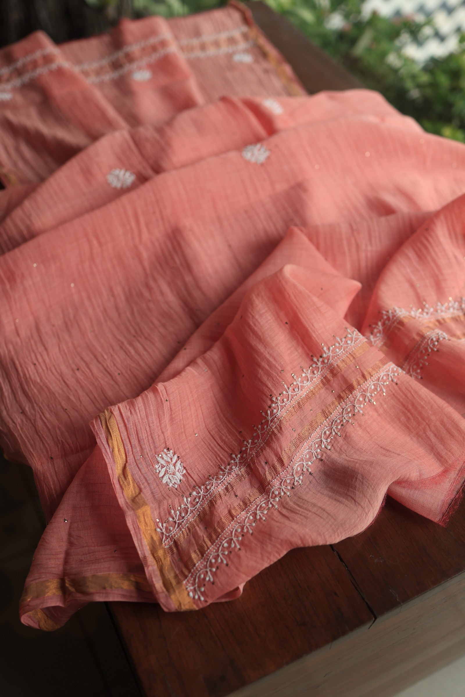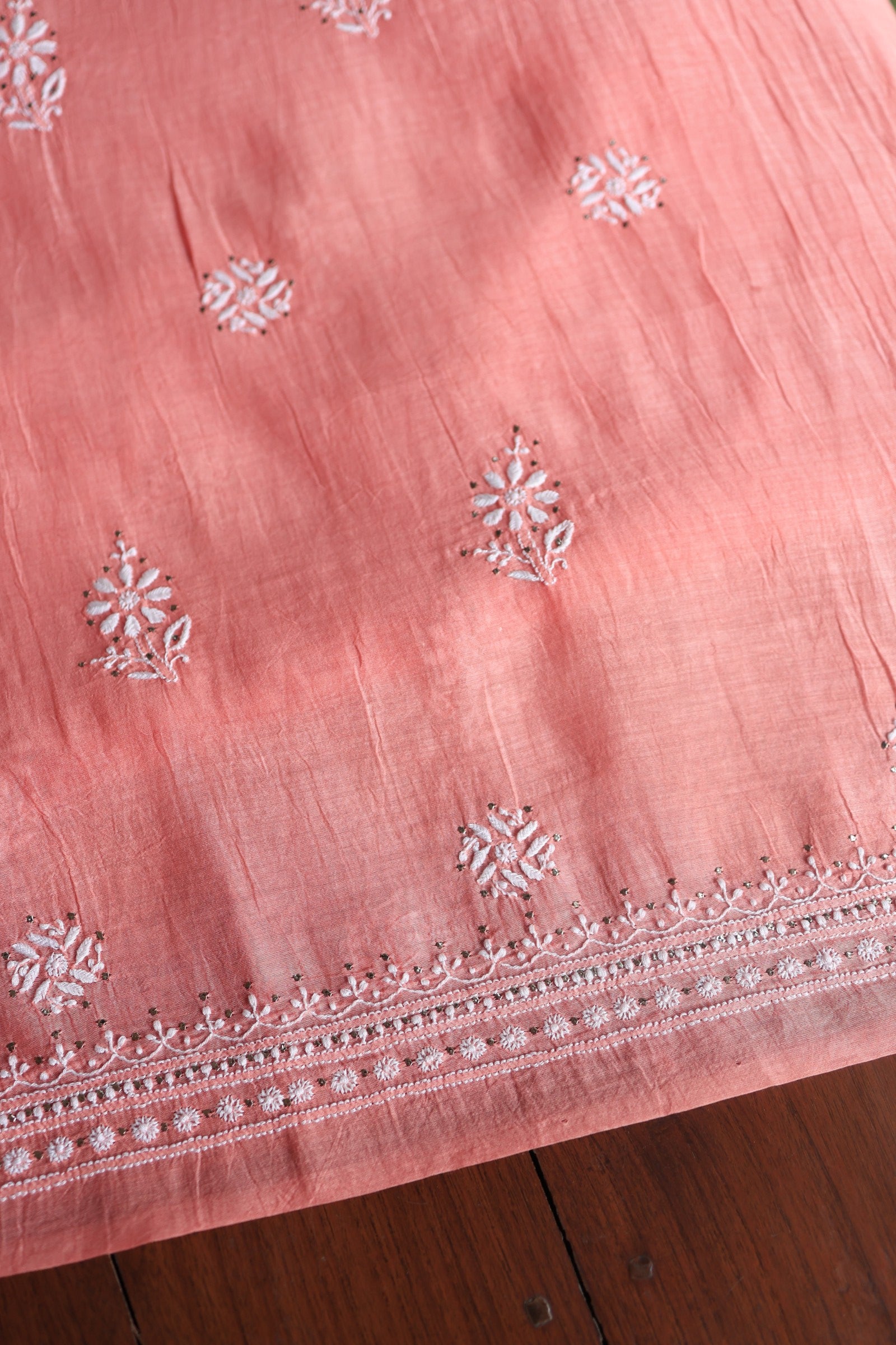Dusty Peach Mal Cotton Chikankari Unstitched Kurta Dupatta Fabrics With Kamdani