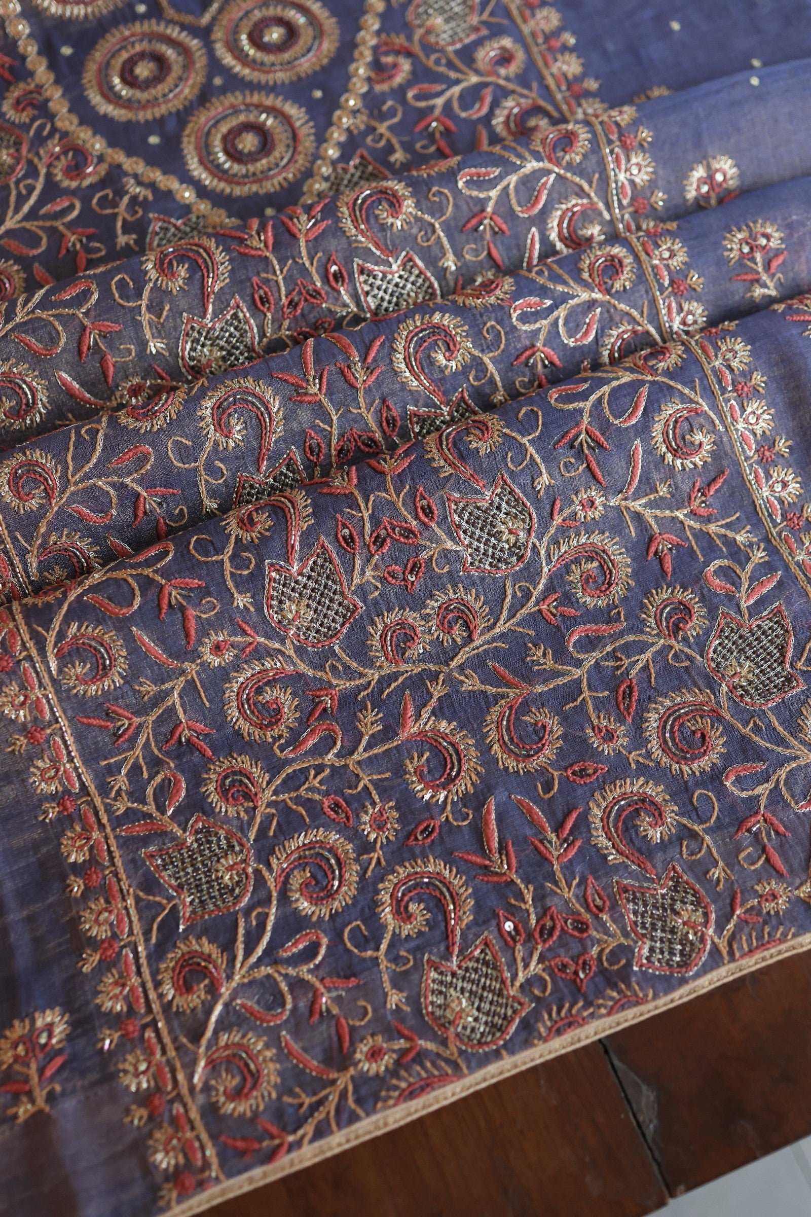 Intricate Chikankari done on darker shades of tissue fabric with dainty sequins/beads work giving it a dash of bling clubbed tissue silk dupatta.
