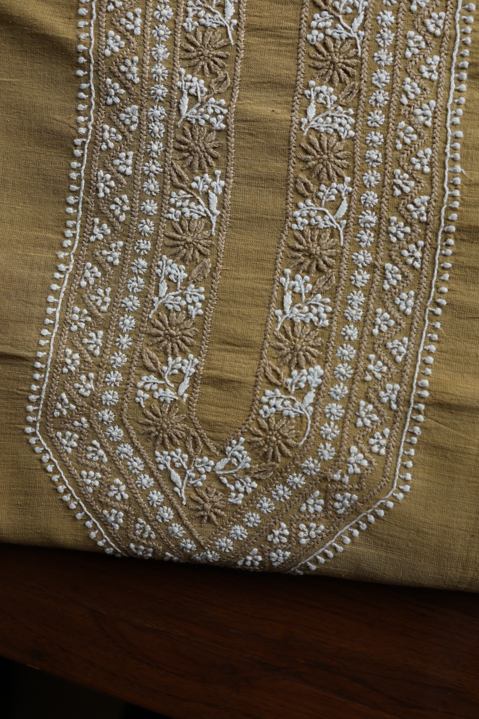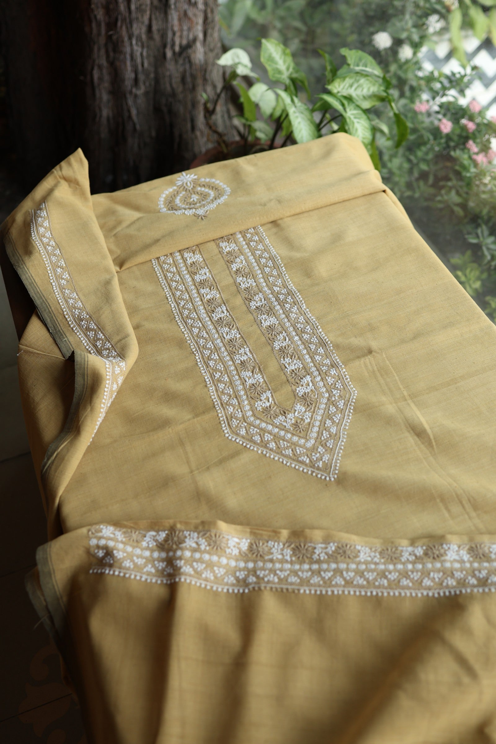 Our Men’s Chikankari Kurta, crafted from hand-spun khadi cotton. With a 3.5-meter fabric length, it features delicate pastel embroidery, perfect for all-year-round comfort and elegance.