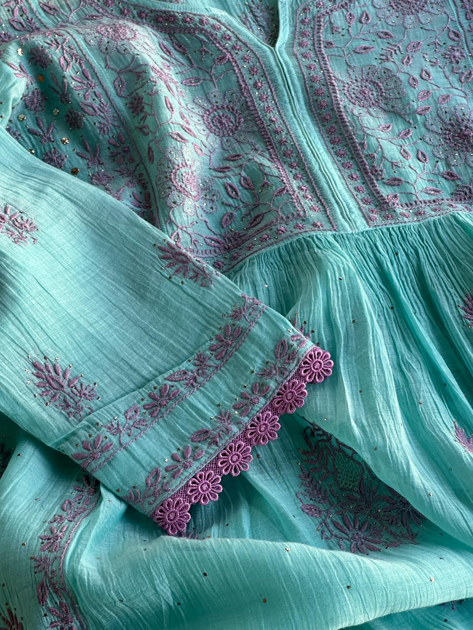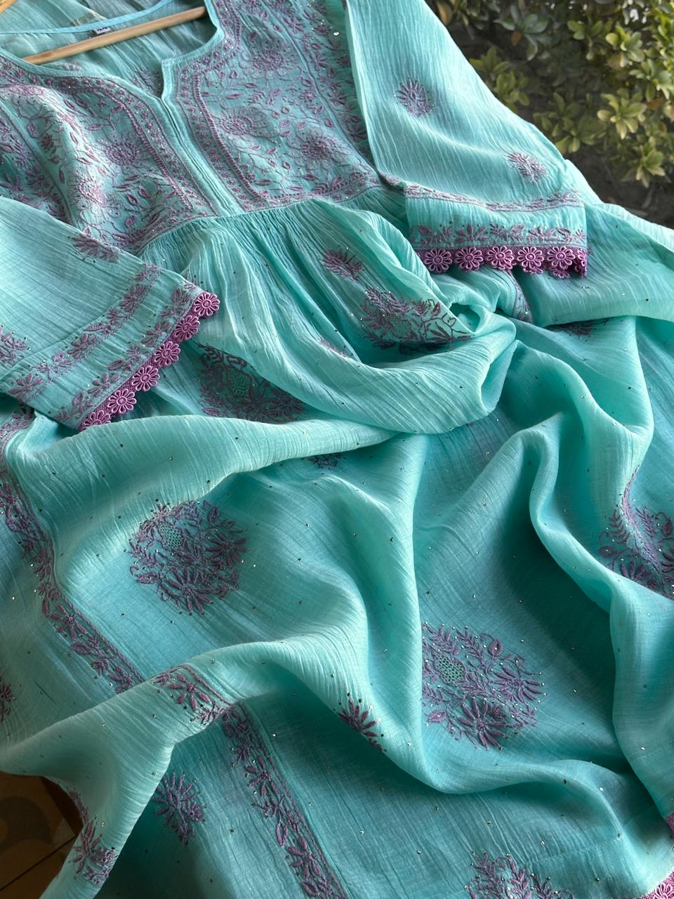Fountain Blue Malmal Mukaish Kamdani Chikankari Stitched Kurta Dupatta Set