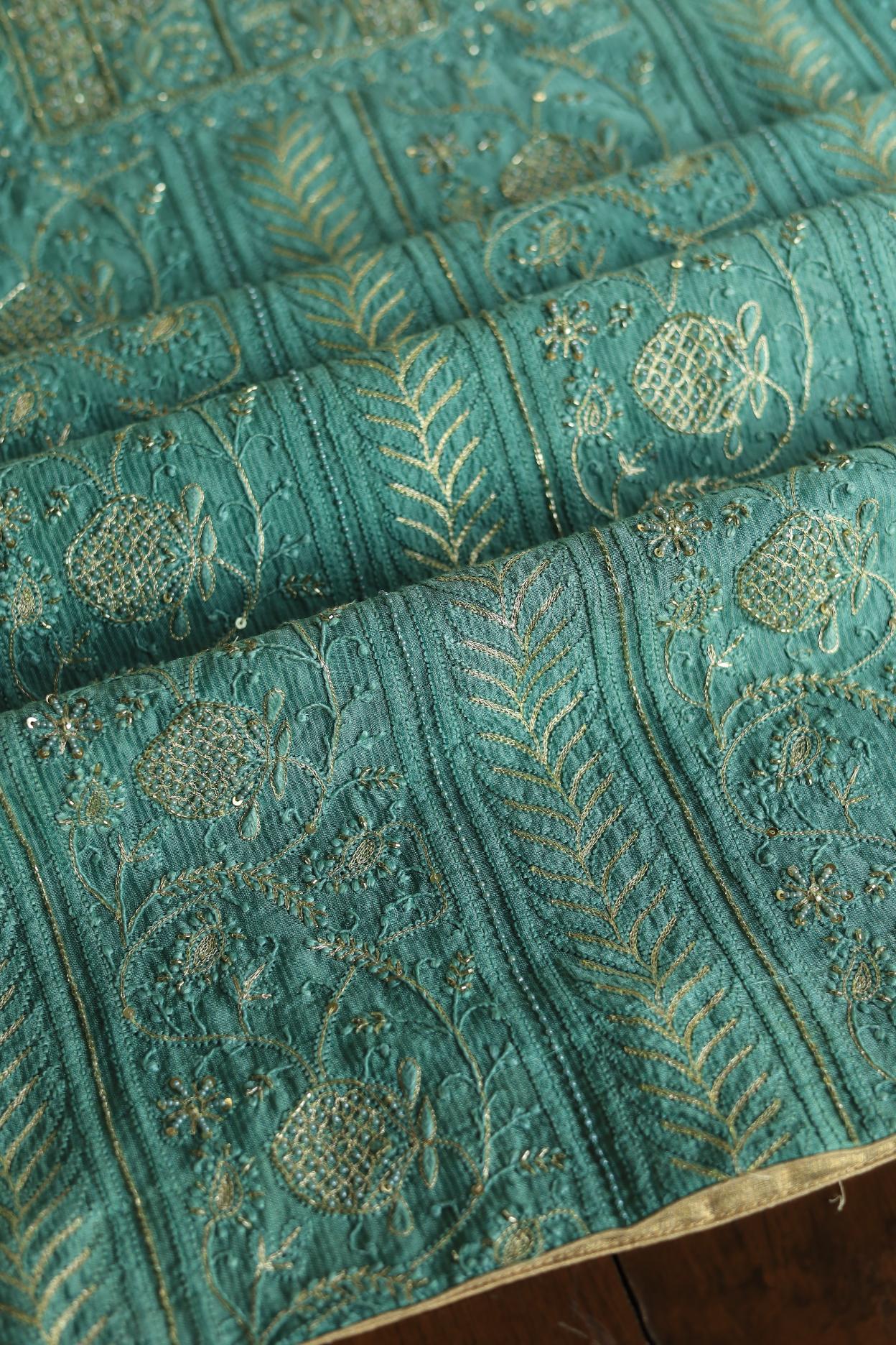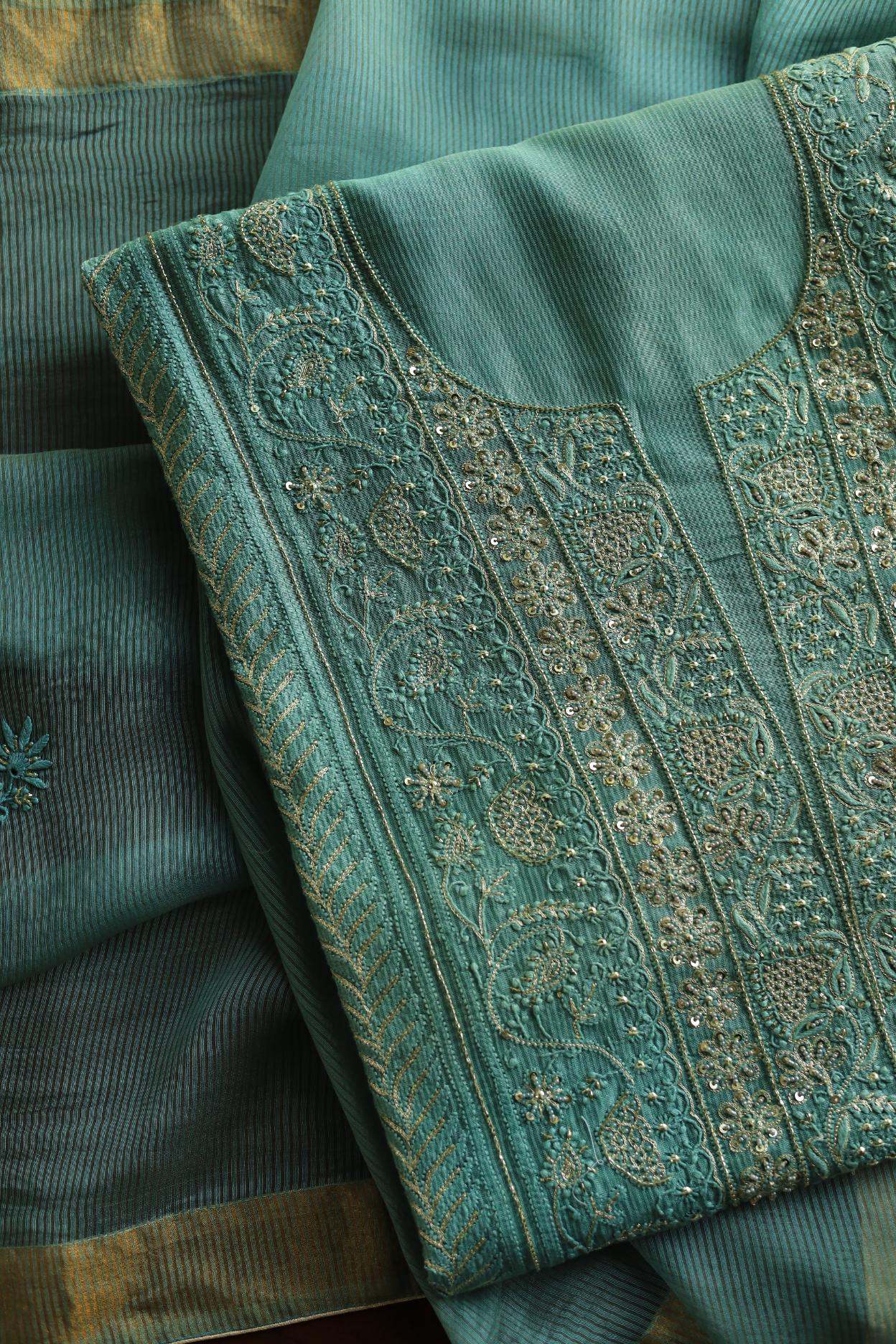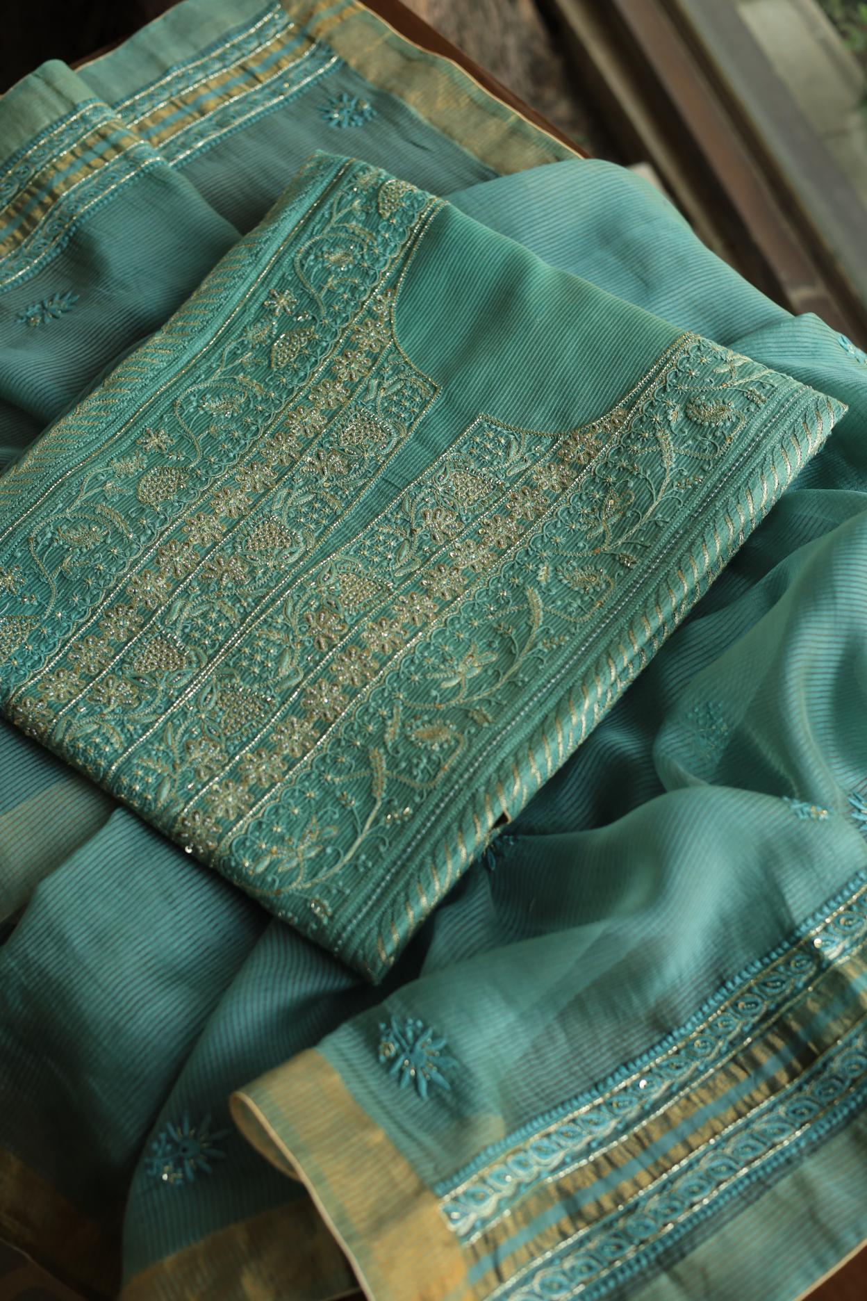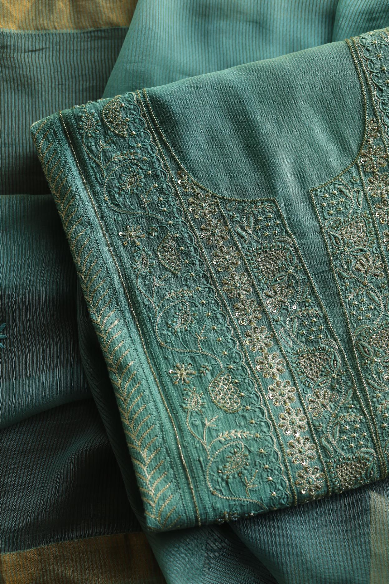 Green Maheshwari Chikankari With Ari Work Unstitched Kurta Dupatta Set