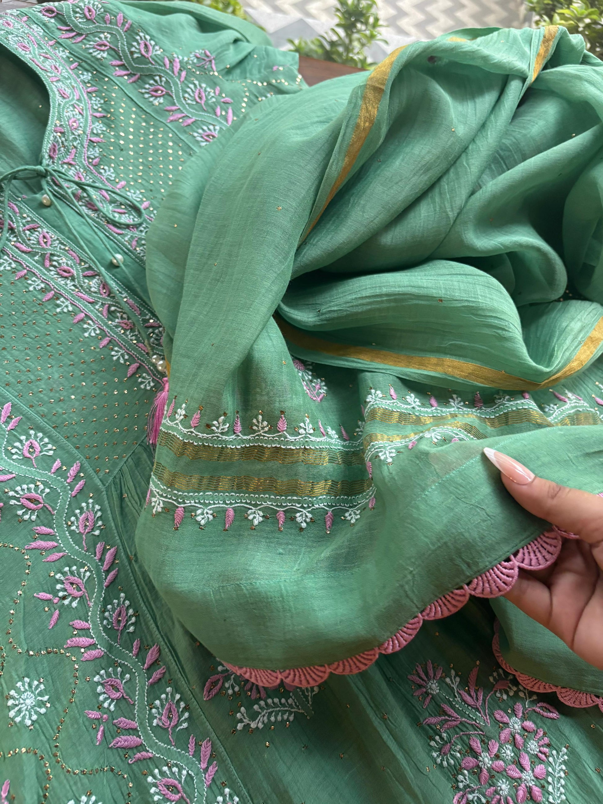 Green & Soft Pink Shade | Malmal Mukaish Kamdani Chikankari Stitched Kurta Dupatta Set