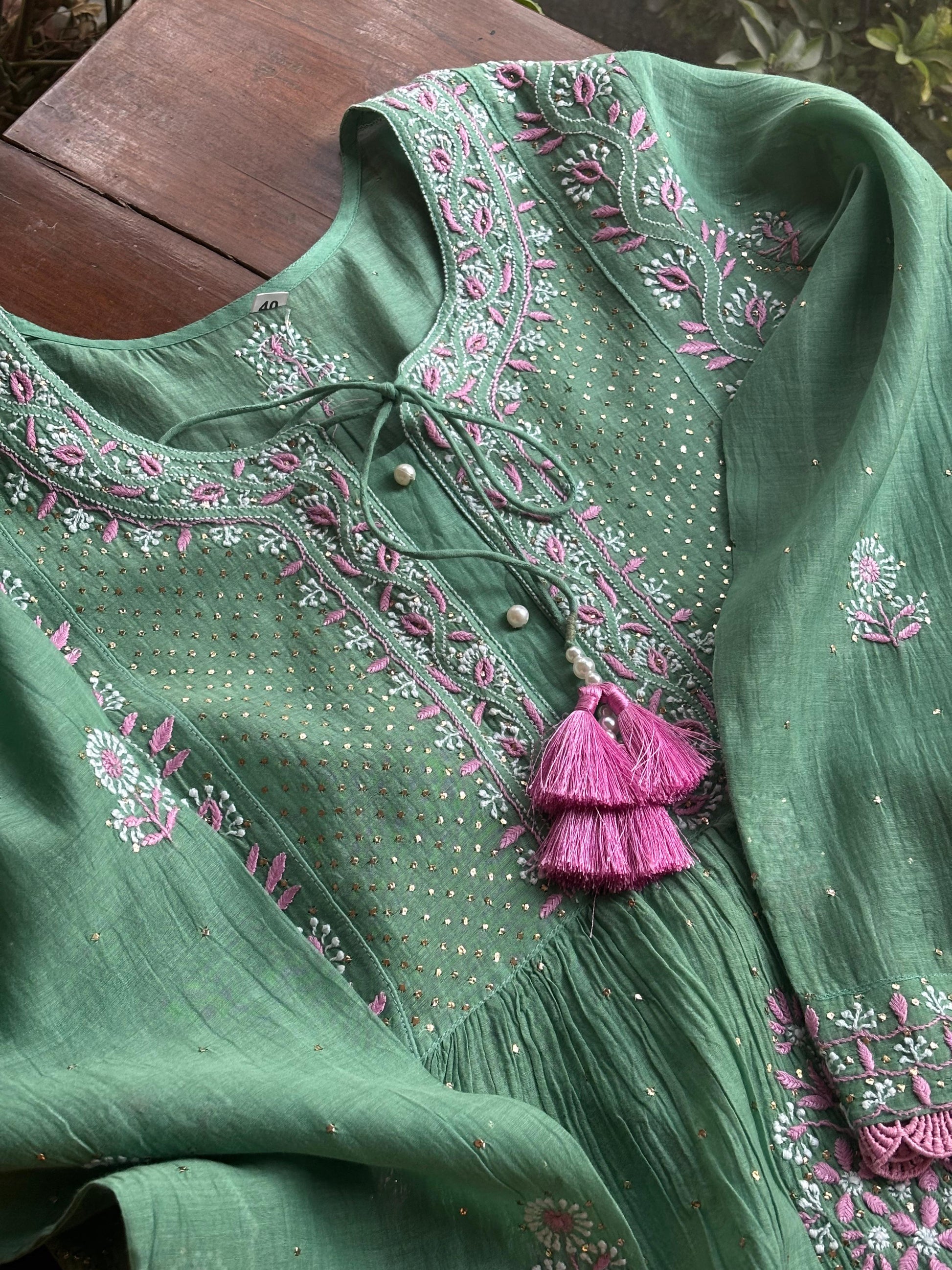 Done with dual tone Fine Chikankari of modern motifs and stitched with cotton laces & sprinkle of dash of kamdani.
