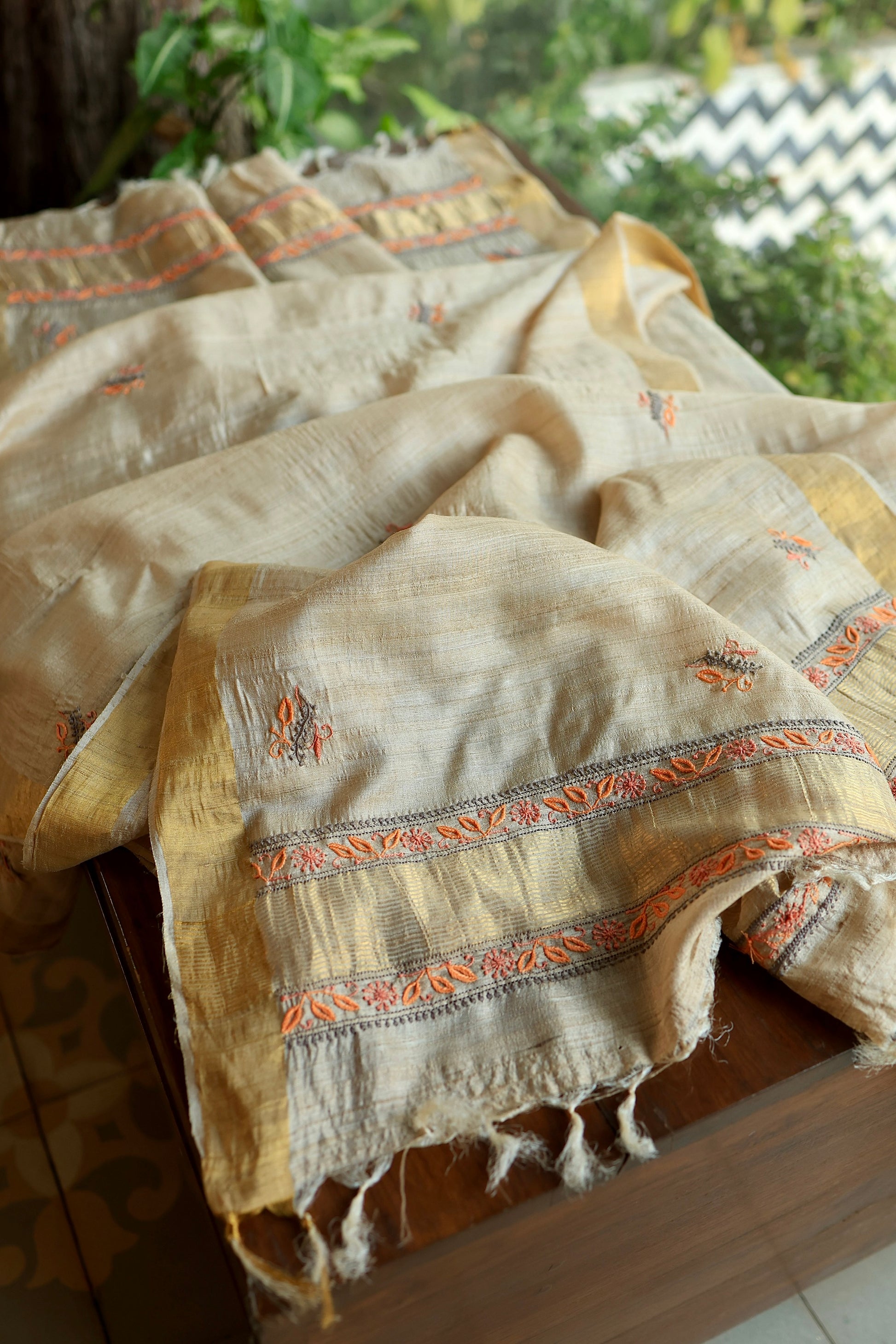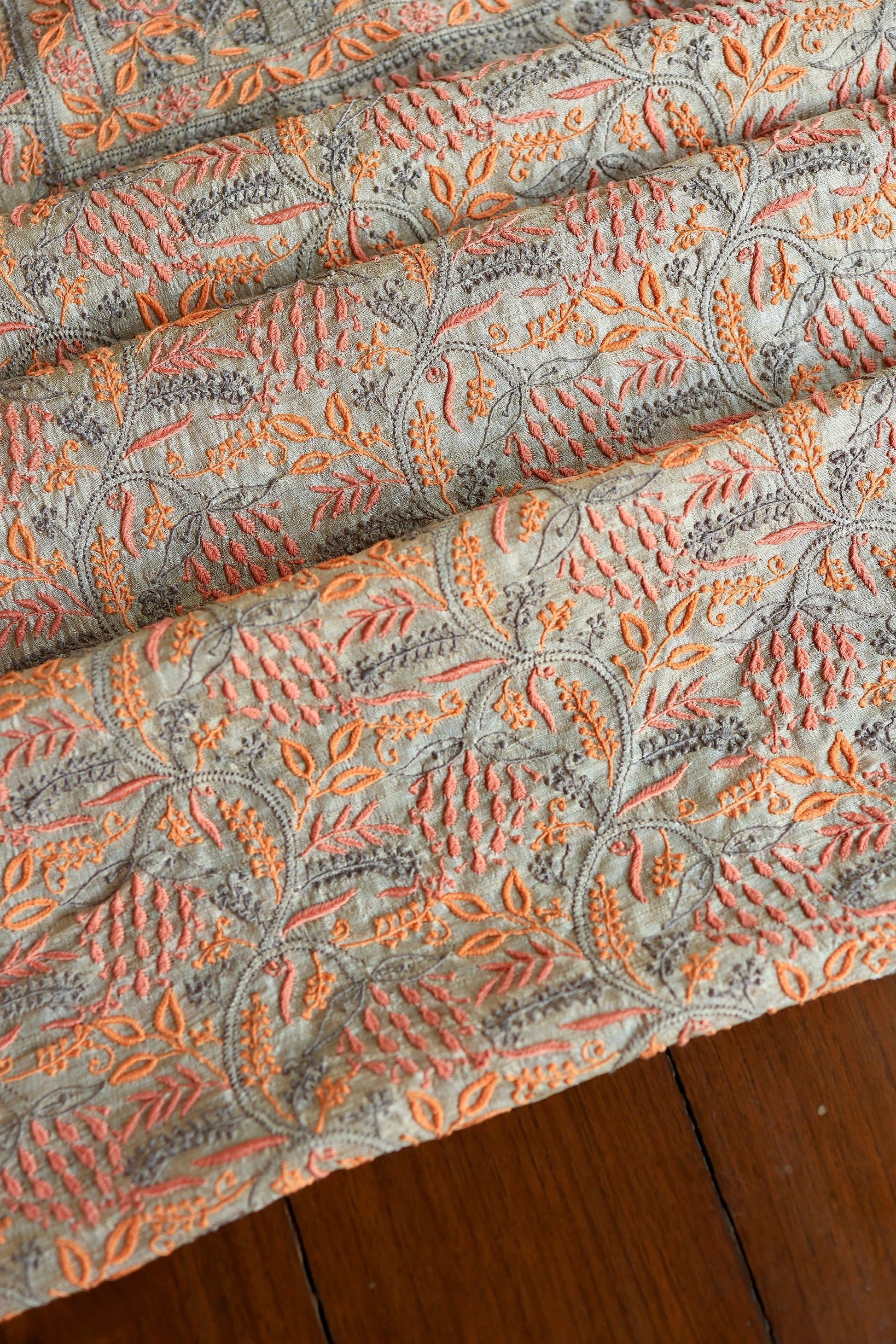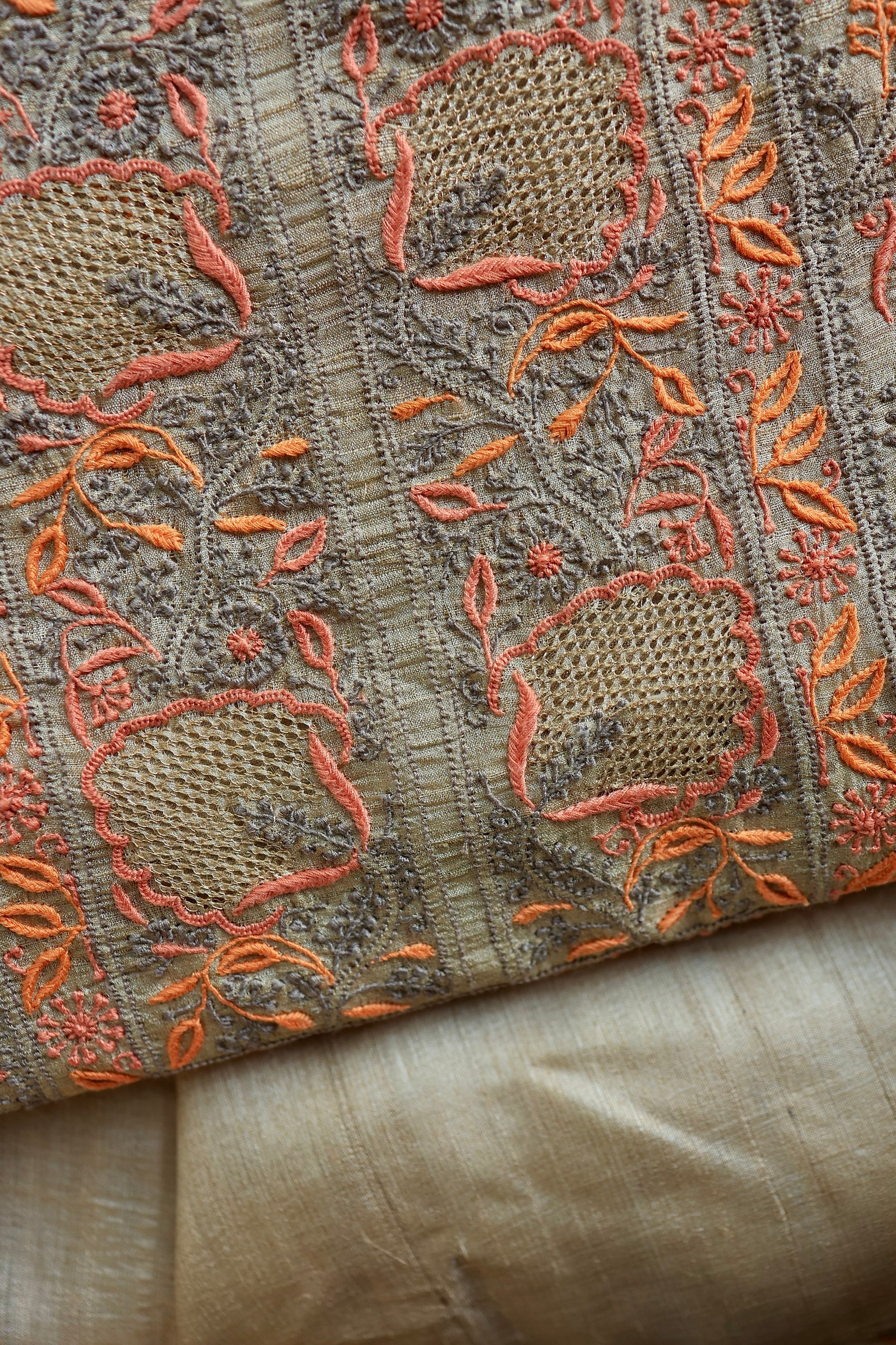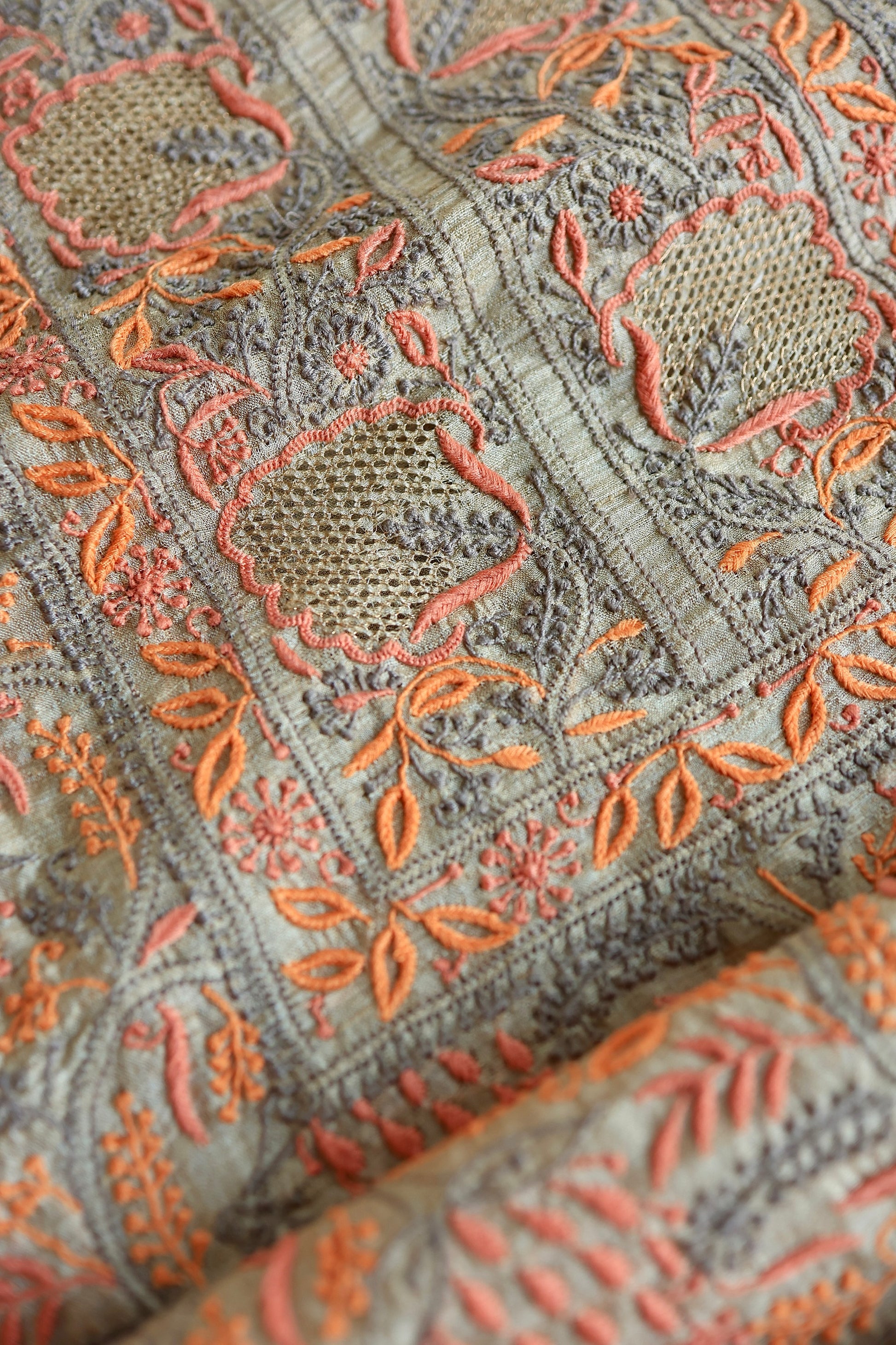 Grey & Orange Natural Shade Tussar Silk Chikankari Fabrics