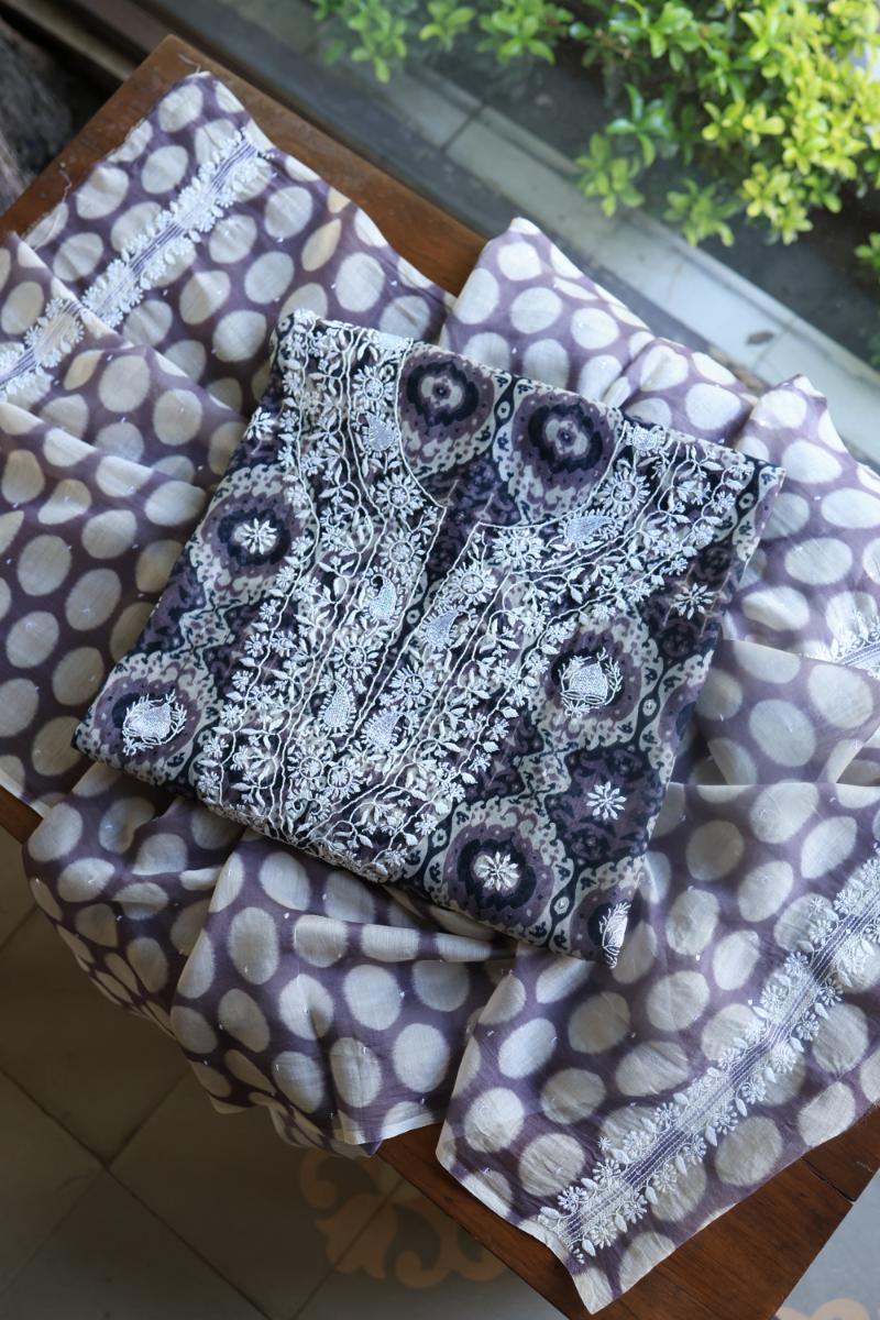 Grey & White Soft Cotton Printed Unstitched Kurta Dupatta Set with Chikankari & Sequin Work