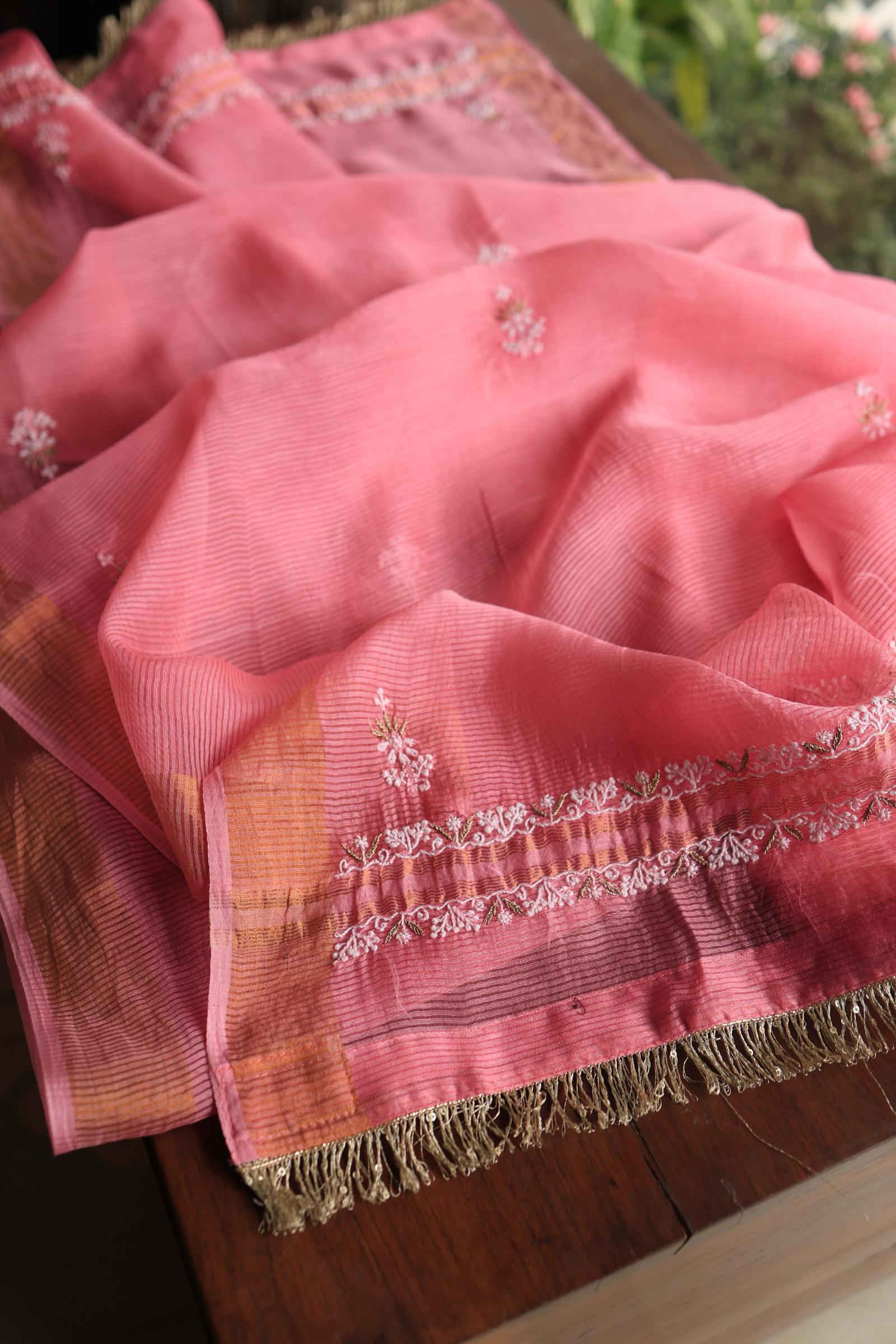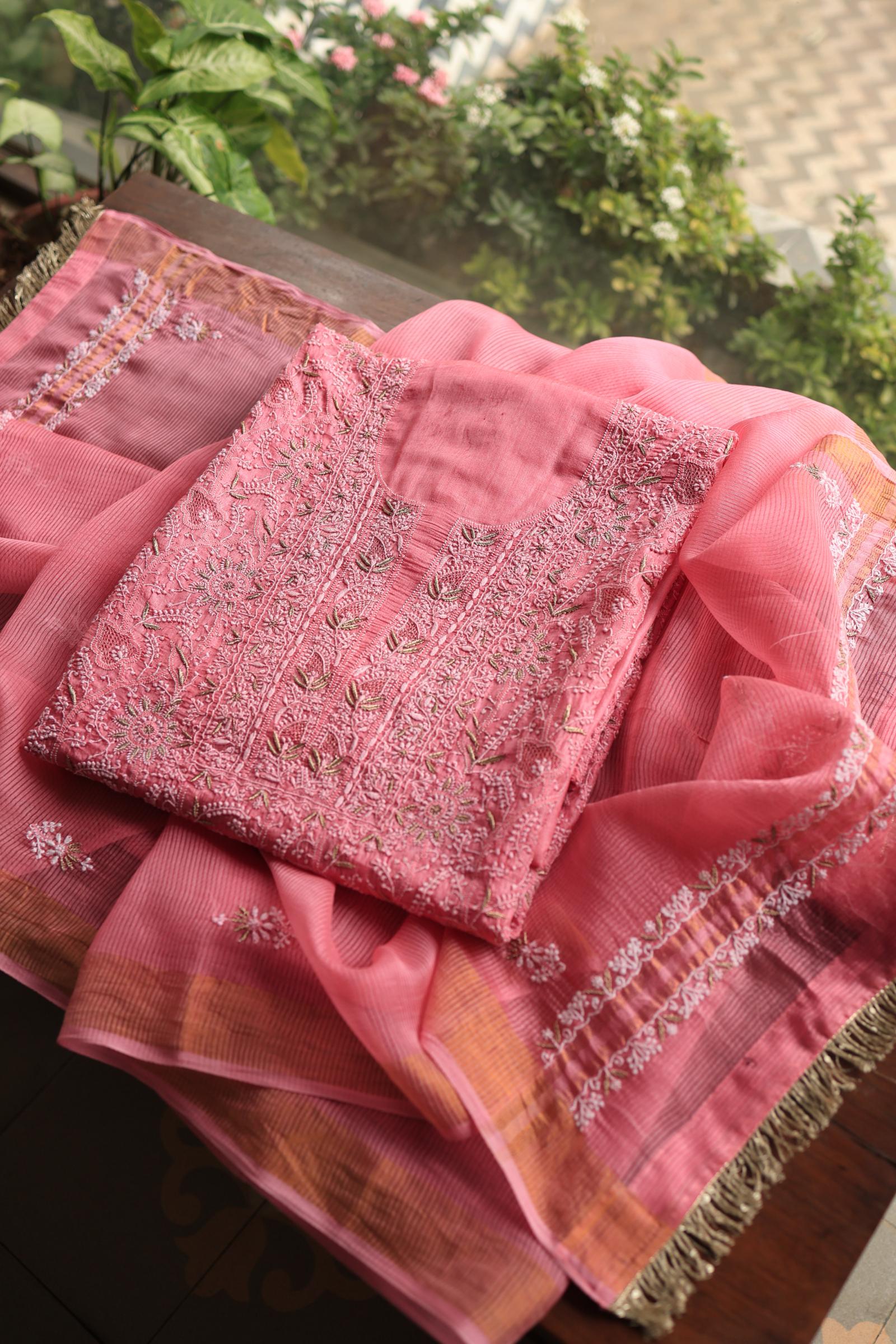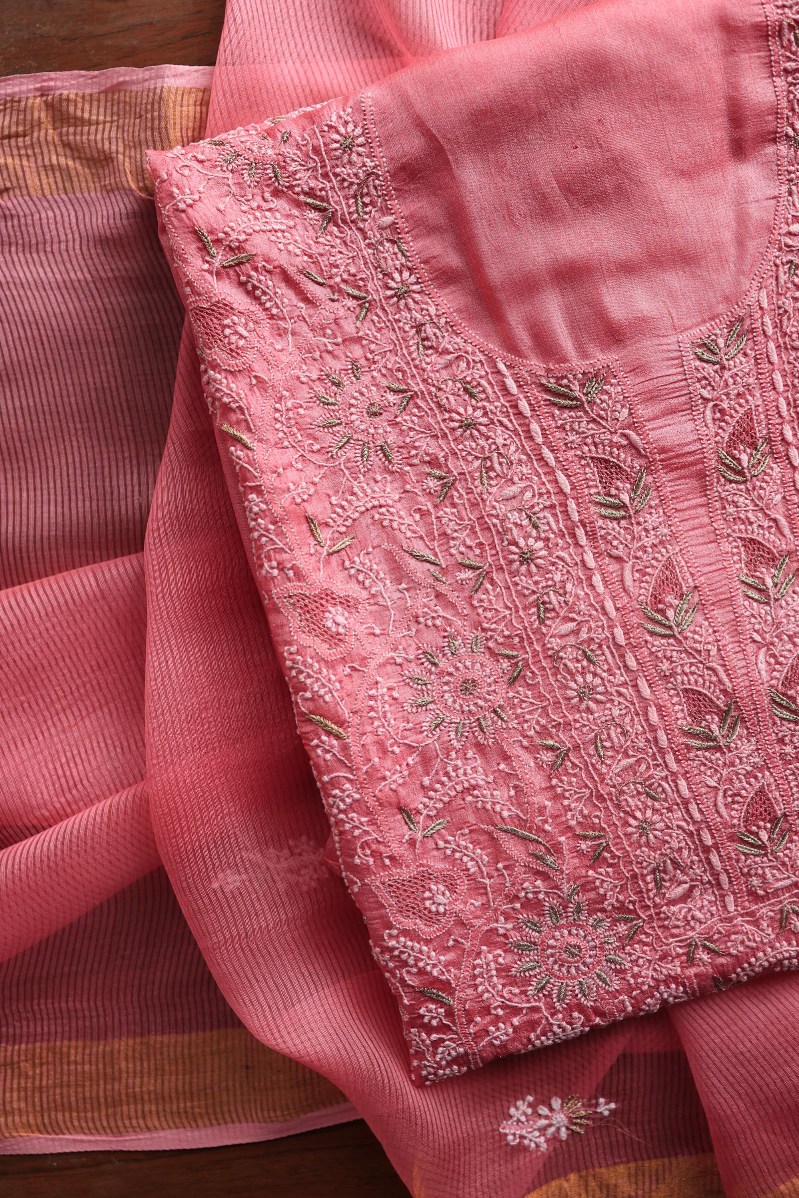 Rose Pink Shade Paper Tussar Resham Chikankari Unstitched Kurta Dupatta Set