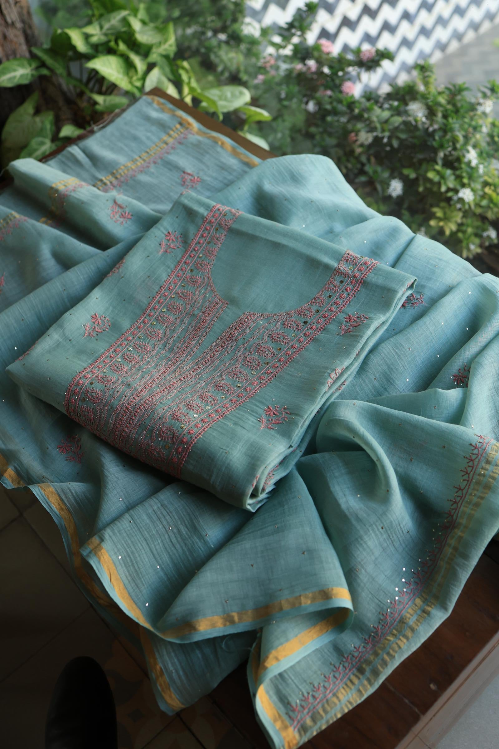 Green Turquoise Mal Cotton Fine Chikankari With Kamdani Work Unstitched Fabric