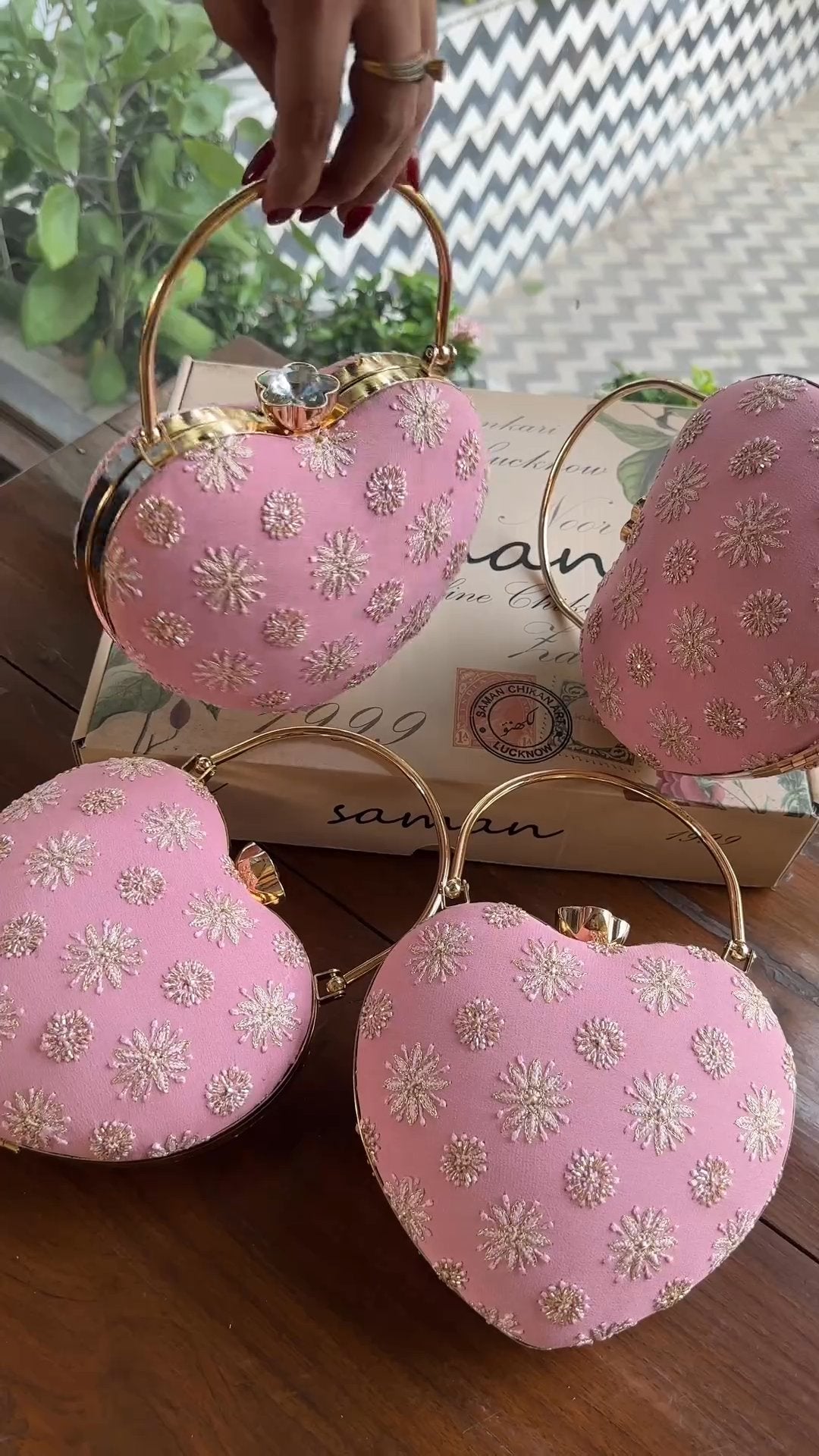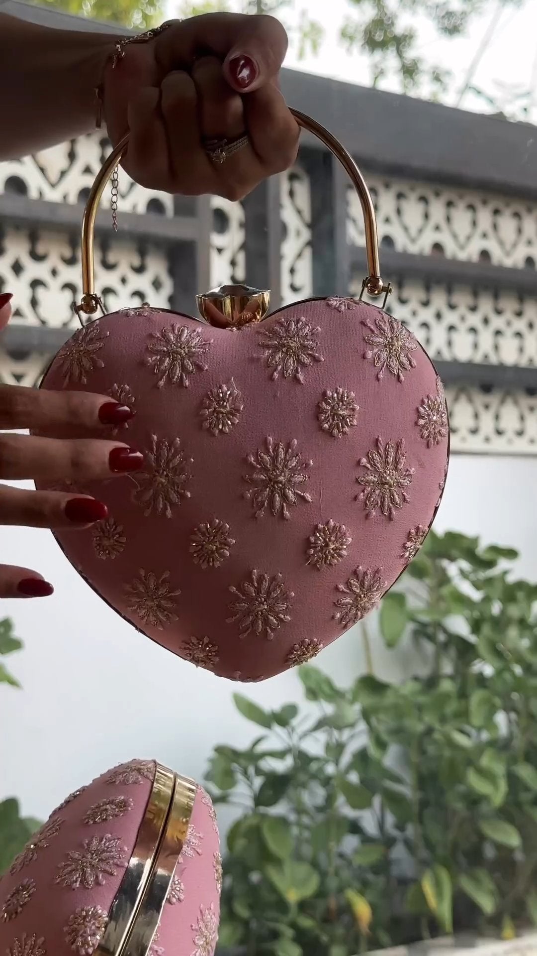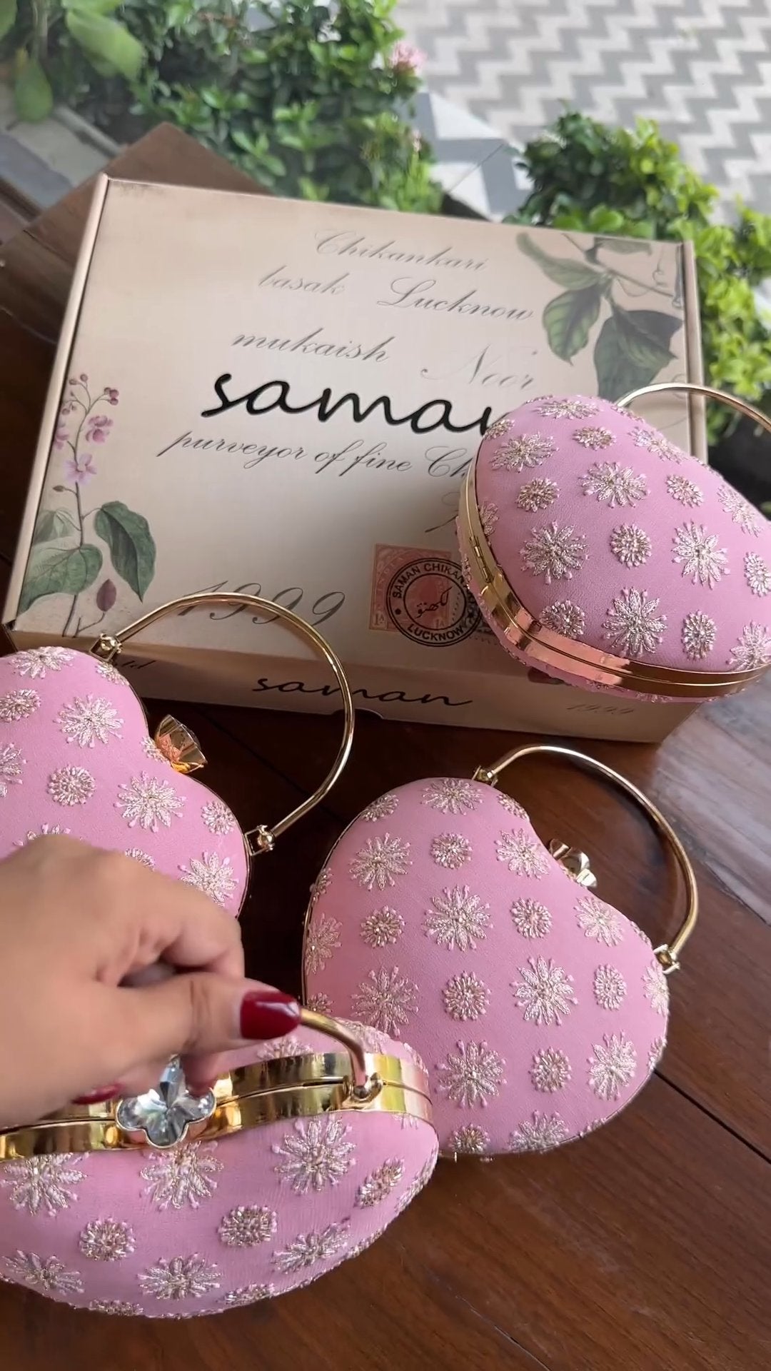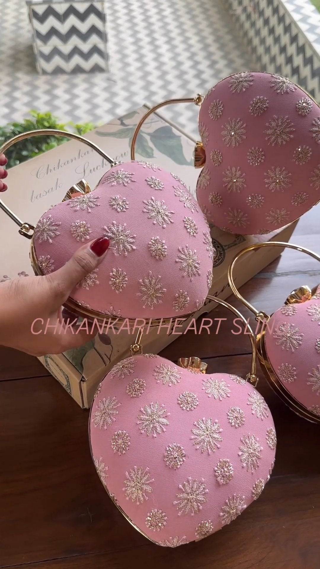 Heart shaped Chikankari contemporary sling back comes with metal chain and handle for the perfect chic looks in traditional awadhi embroidery. Perfect for chic look exuding a personal statement.
