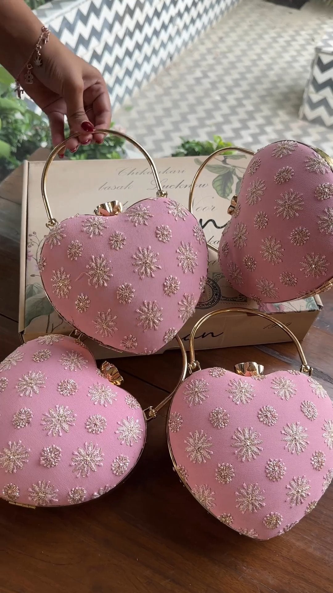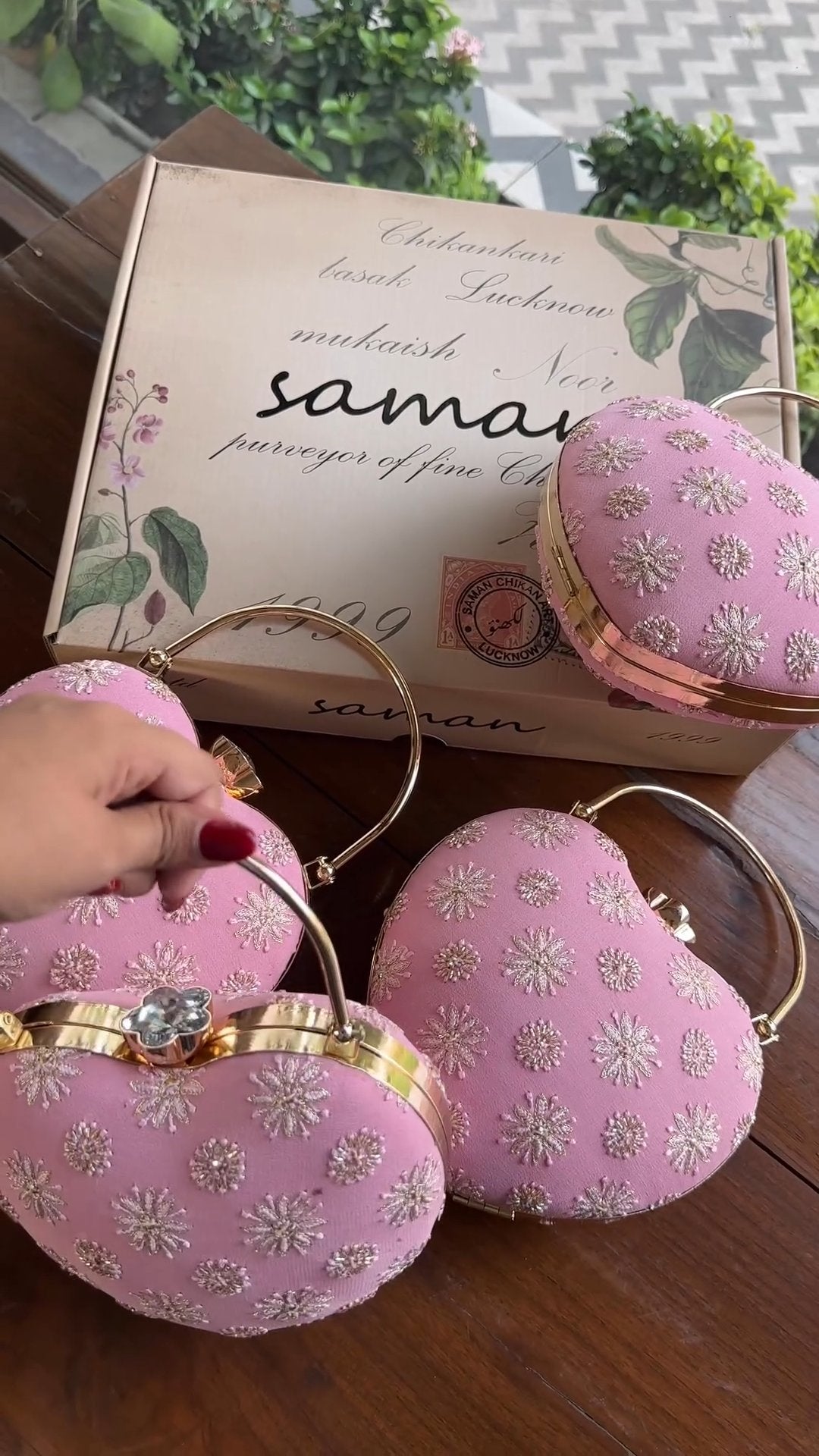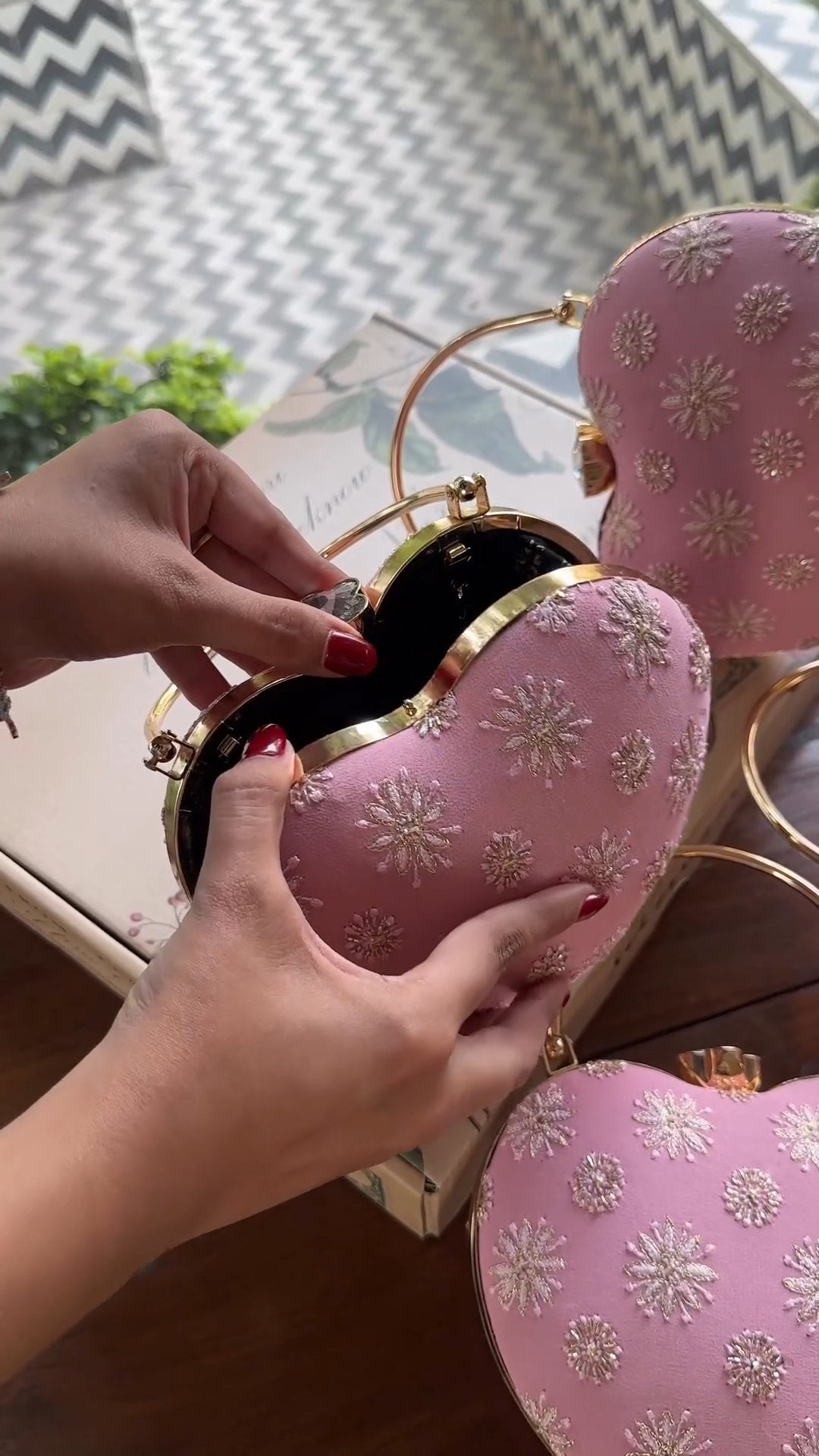 Heart shaped Chikankari contemporary sling back comes with metal chain and handle for the perfect chic looks in traditional awadhi embroidery. Perfect for chic look exuding a personal statement.