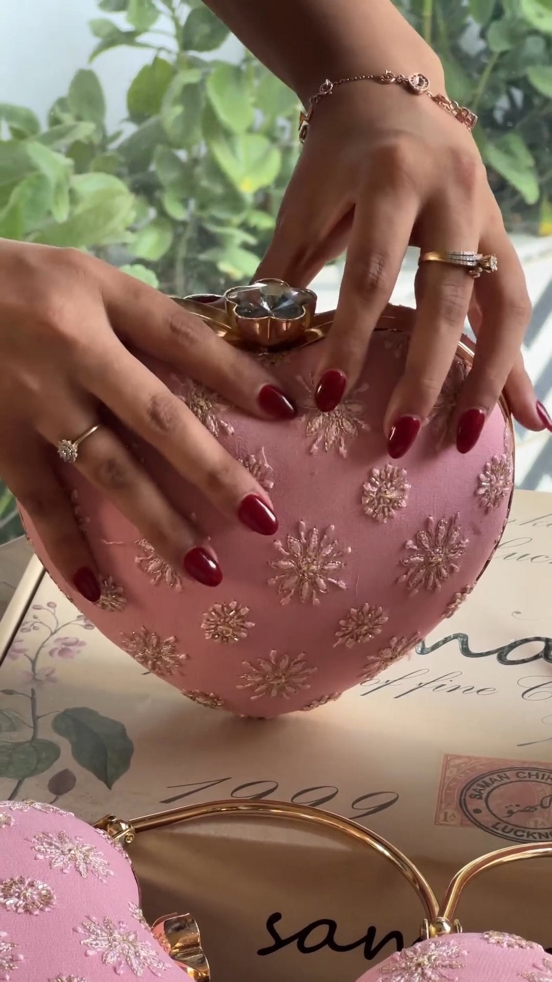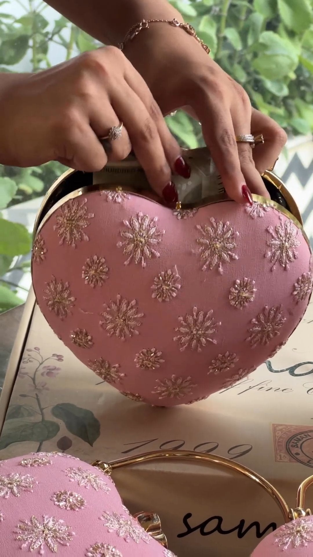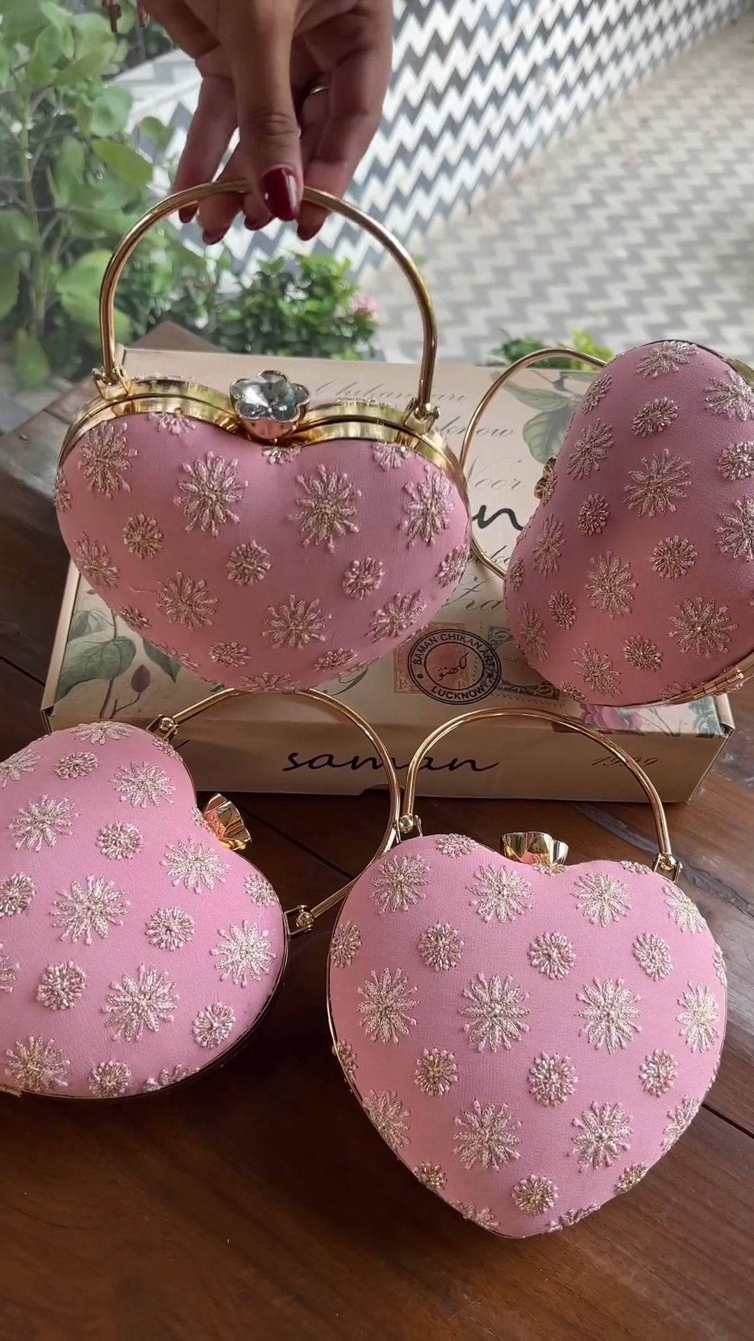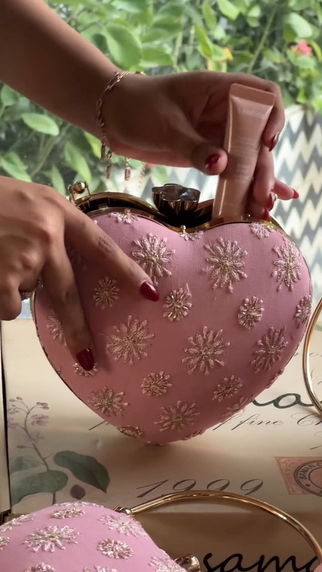 Heart shaped Chikankari contemporary sling back comes with metal chain and handle for the perfect chic looks in traditional awadhi embroidery. Perfect for chic look exuding a personal statement.