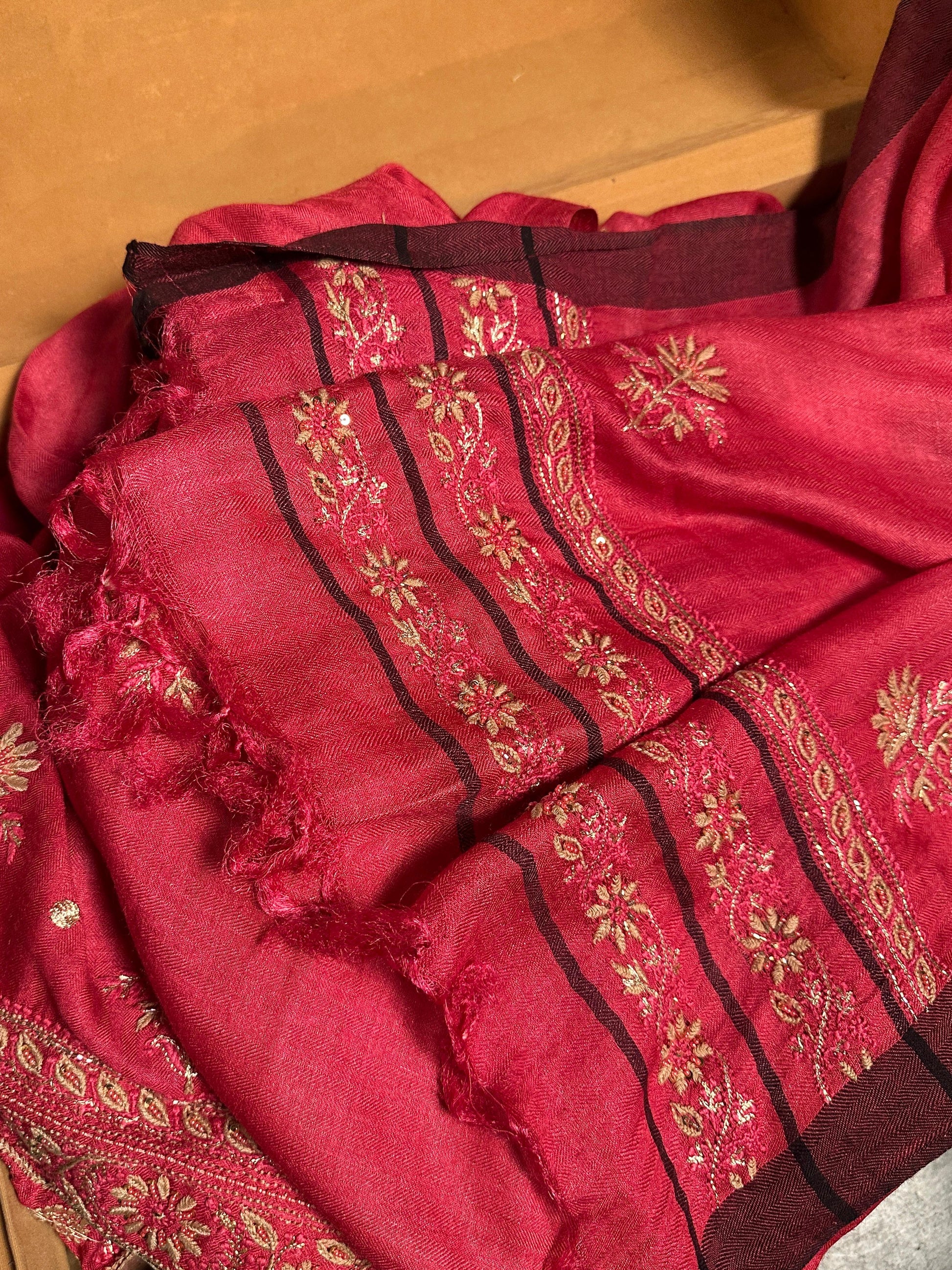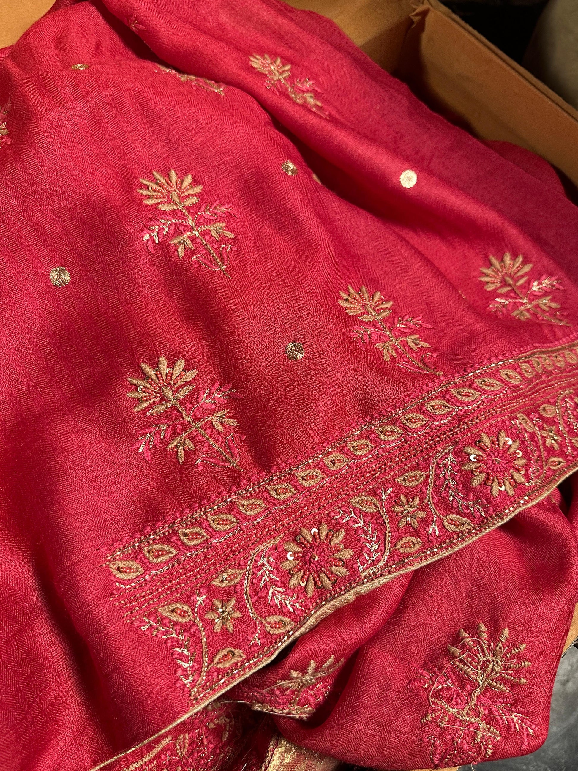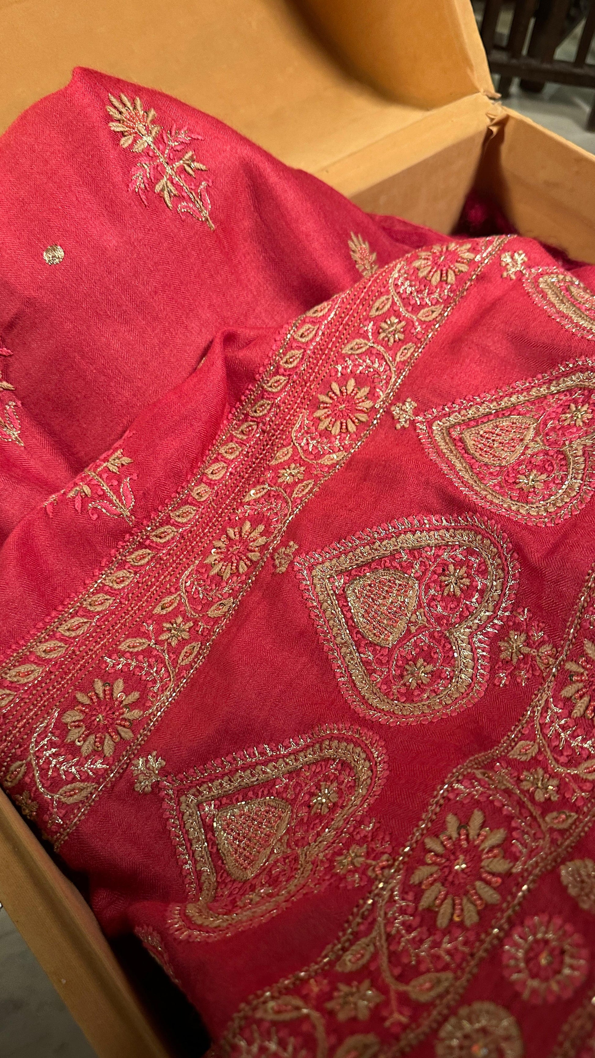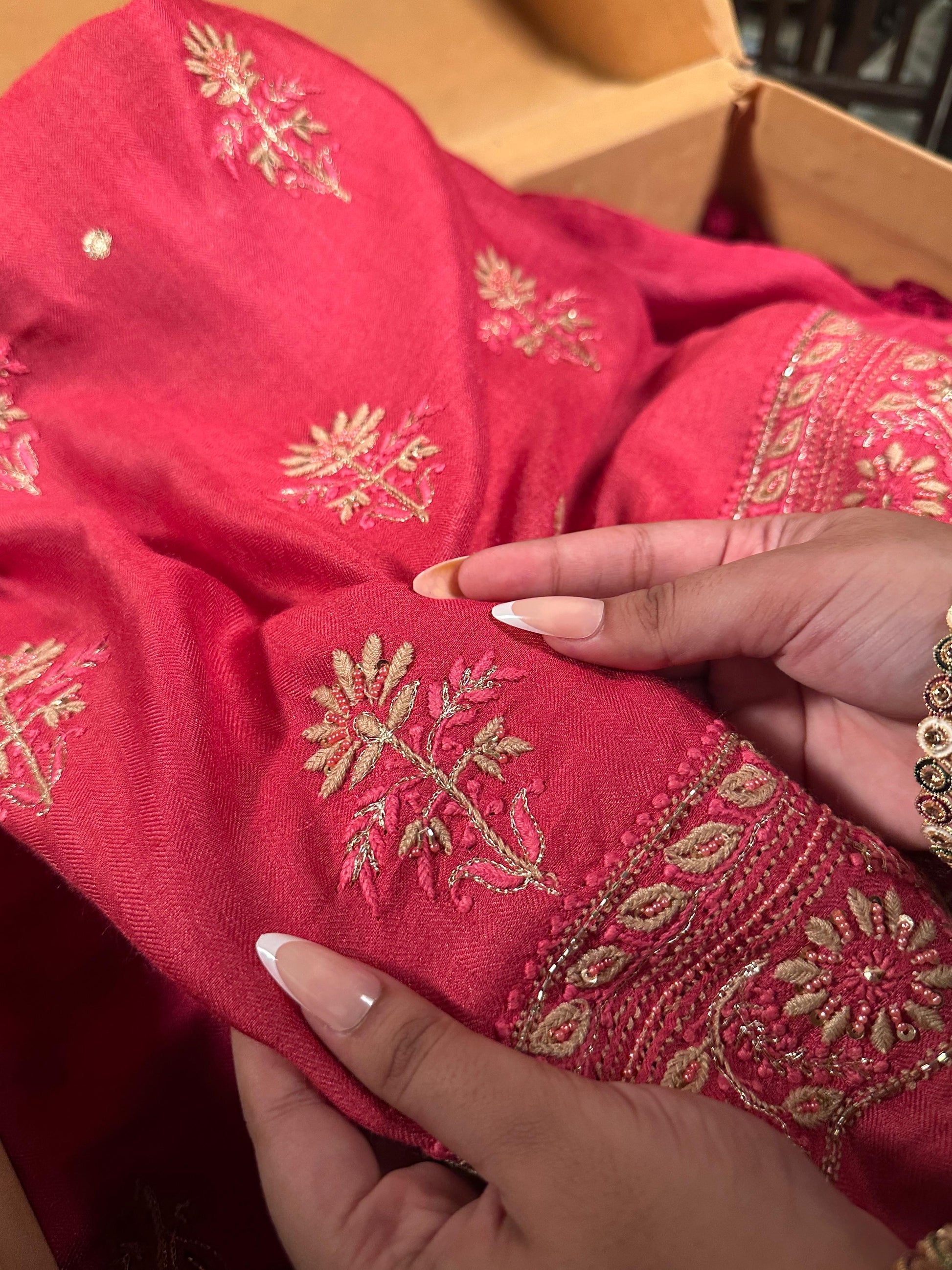 Bringing the warmth of the valleys. Pashmina fabric usually seen as a fabric famous for its natural warmth and finesse. At Saman we done the Chikankari along with our signature Ari/sequins and beads work creating a unique fusion which is classic and creating an amalgamation of two crafts.