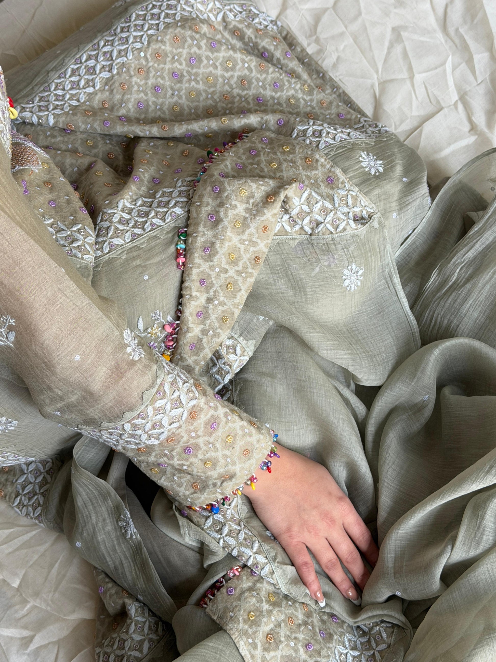 Chikankari on soft chanderi Jacquard fabric with our signature ari pearl and sequins on festive shades comes with kurta and dupatta, perfect for upcoming festive and intimate wedding season ahead.