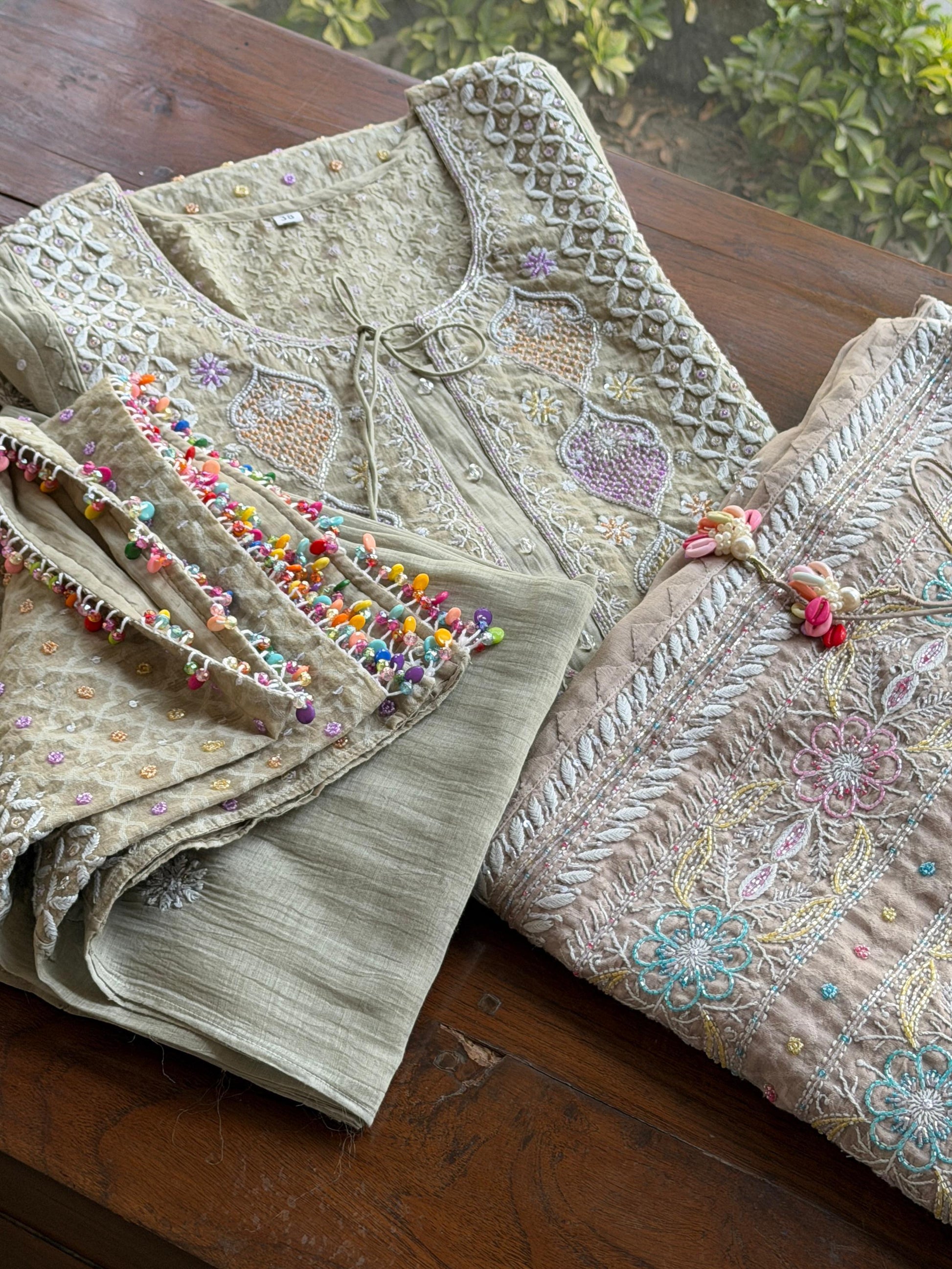 Each piece is crafted with intricate hand-embroidered Chikankari, featuring different traditional embellishments: