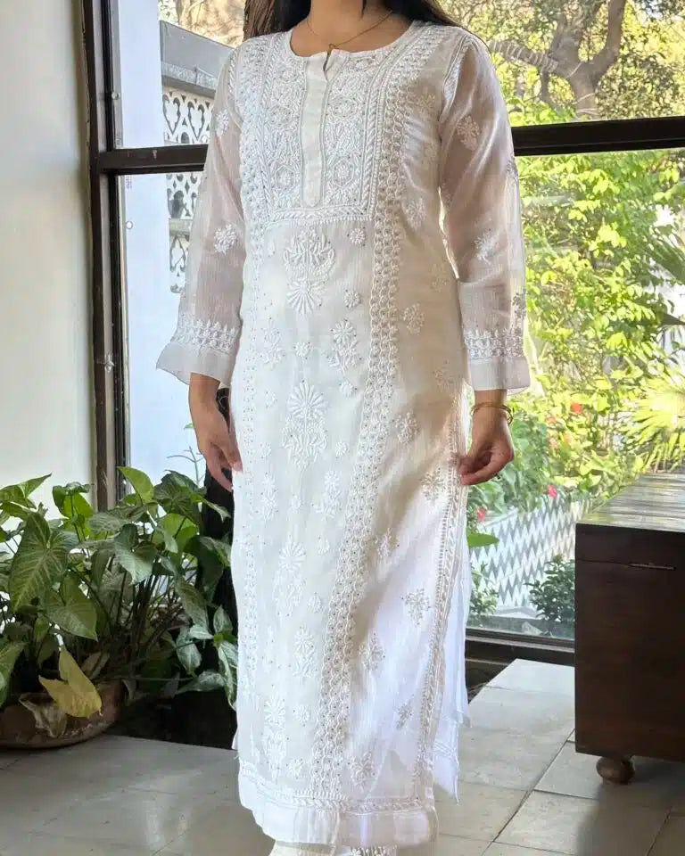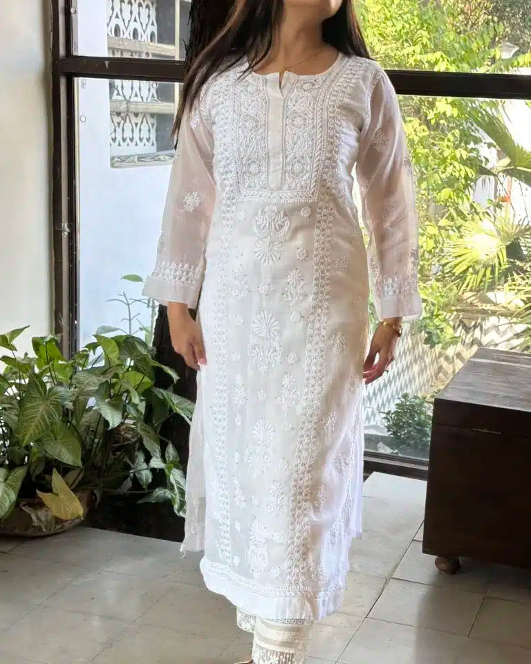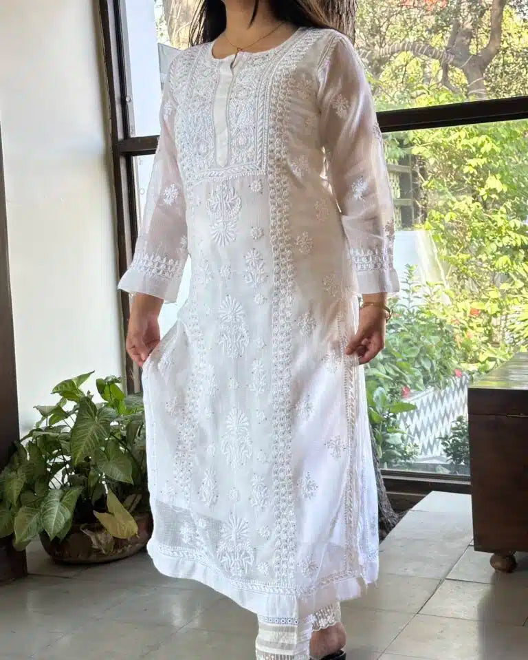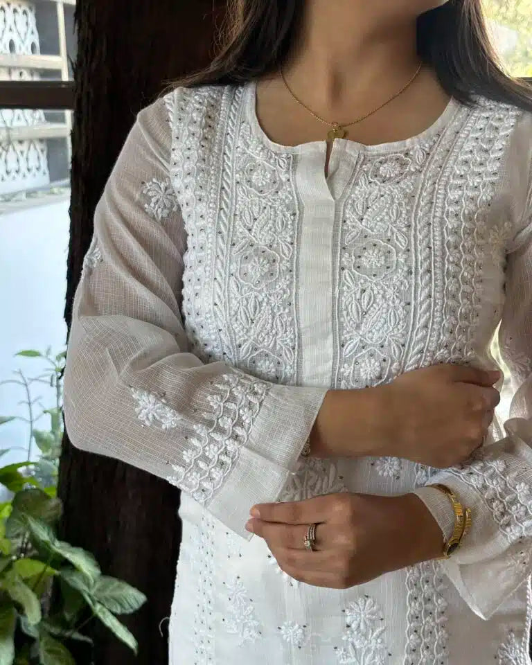 Each piece is crafted with intricate hand-embroidered Chikankari, featuring different traditional embellishments: