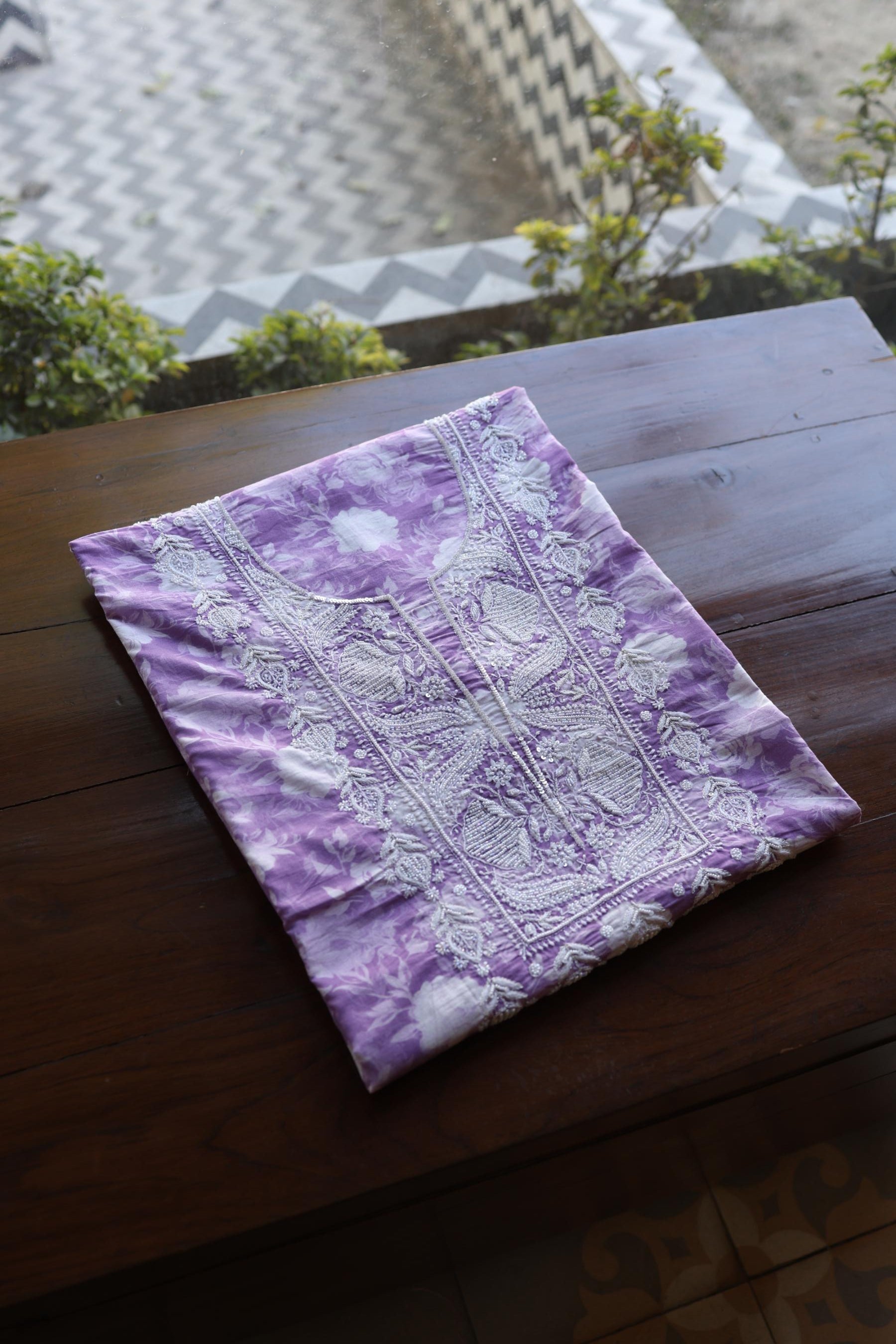Lavender Floral Cotton Kurta Fabric with Chikankari & Sequin Work