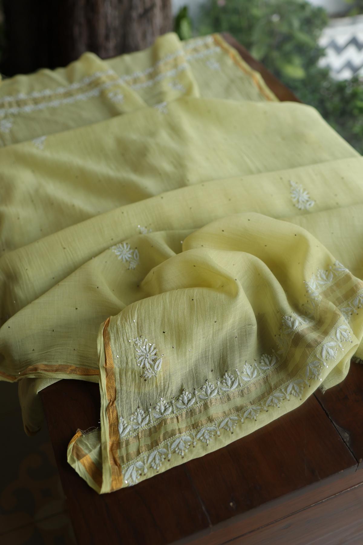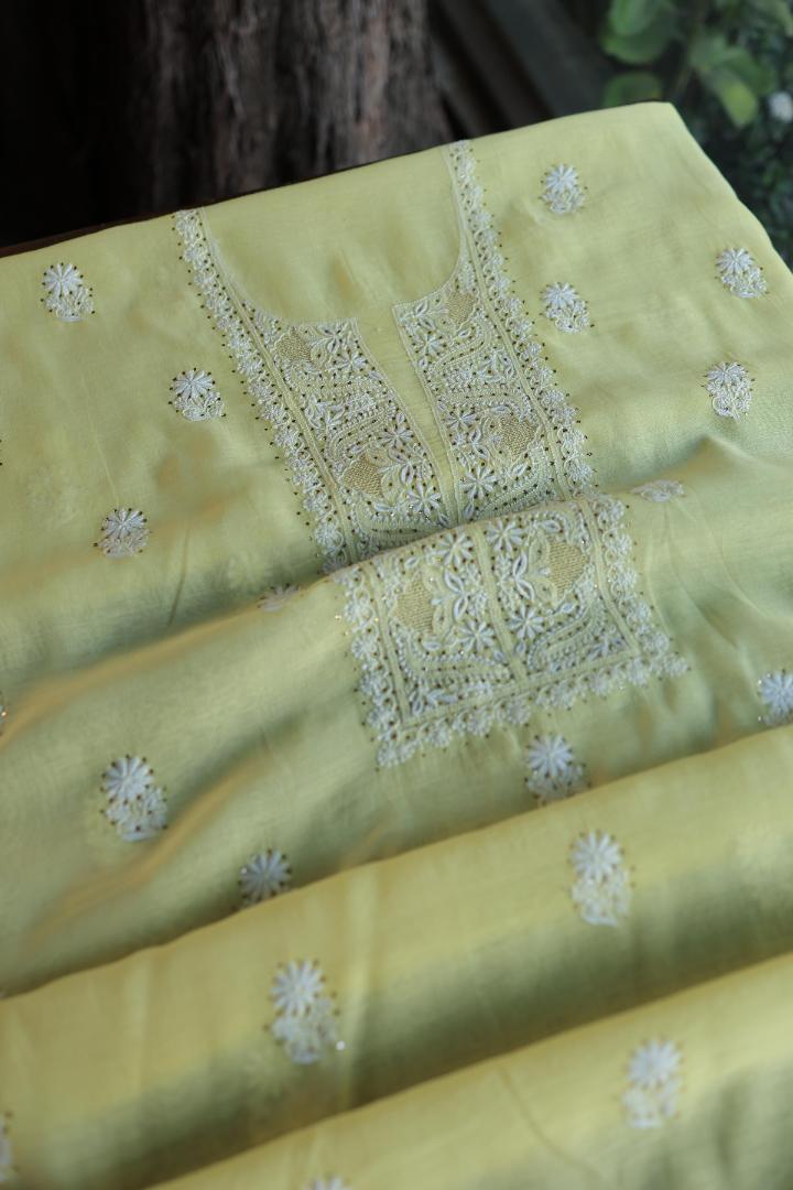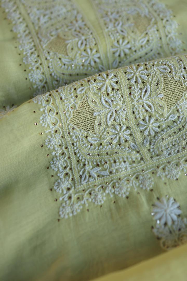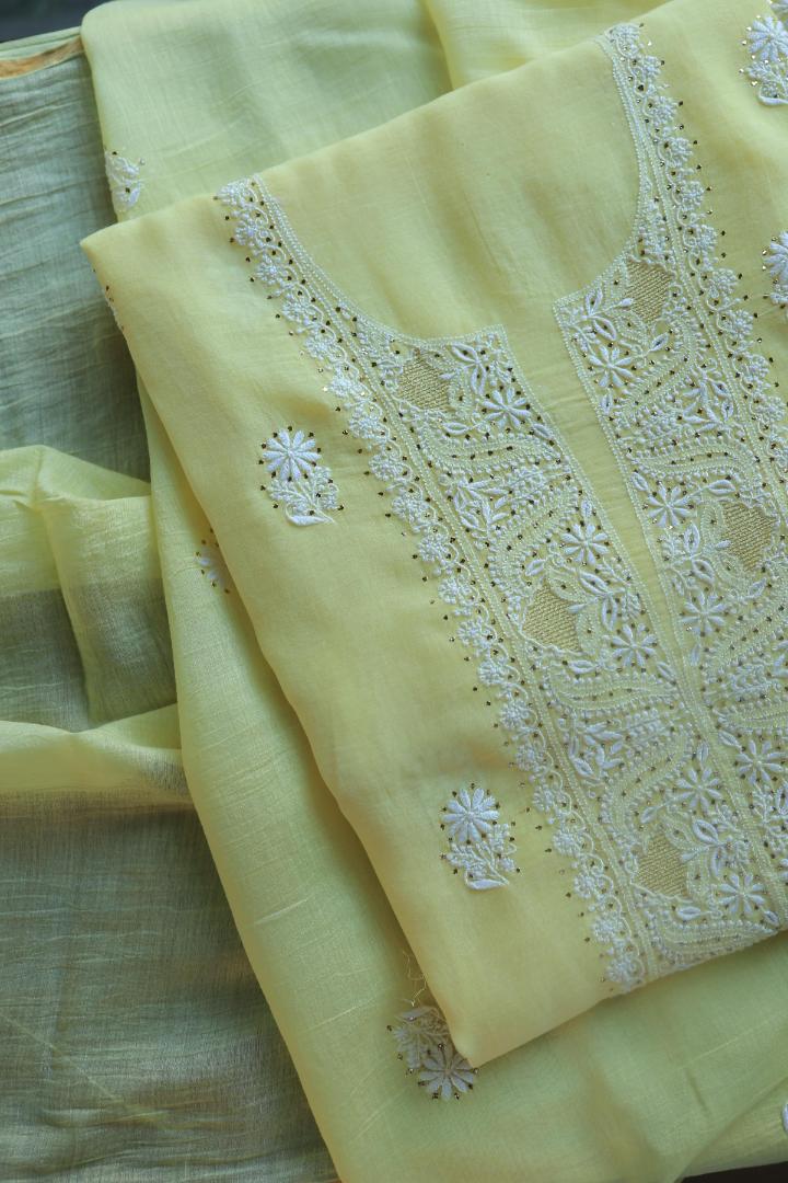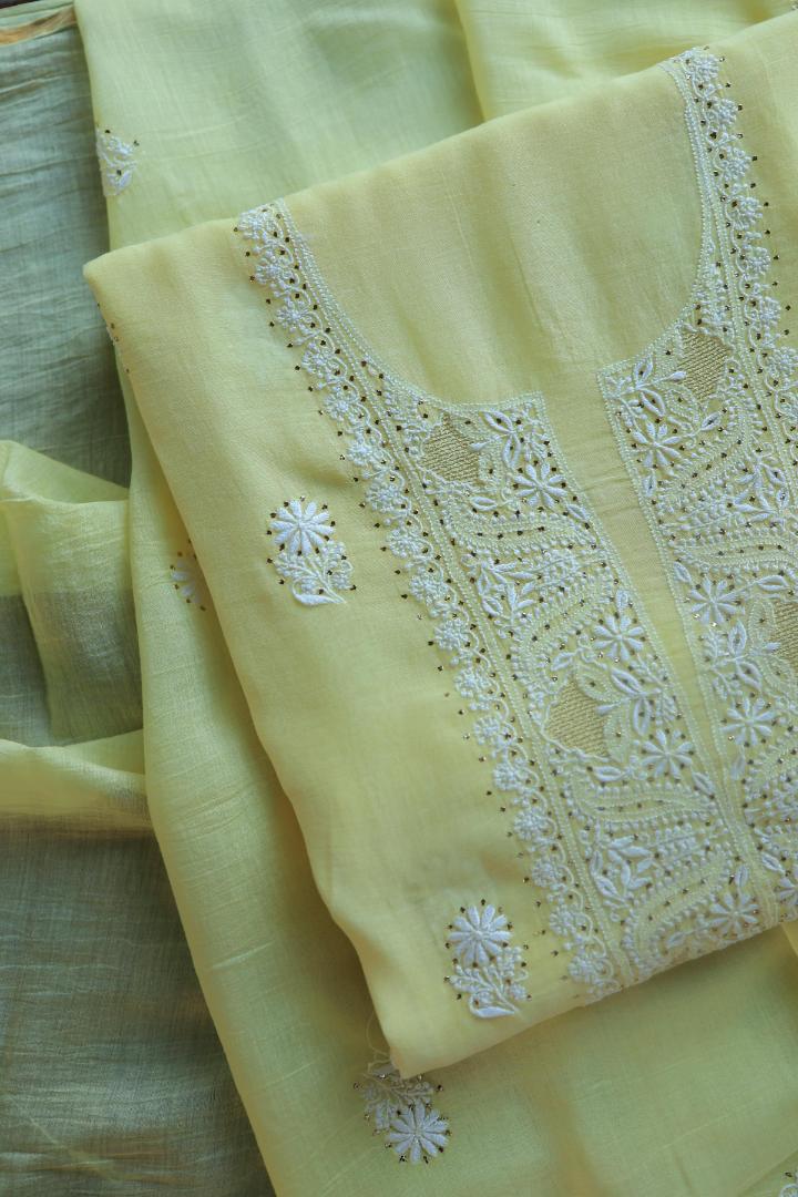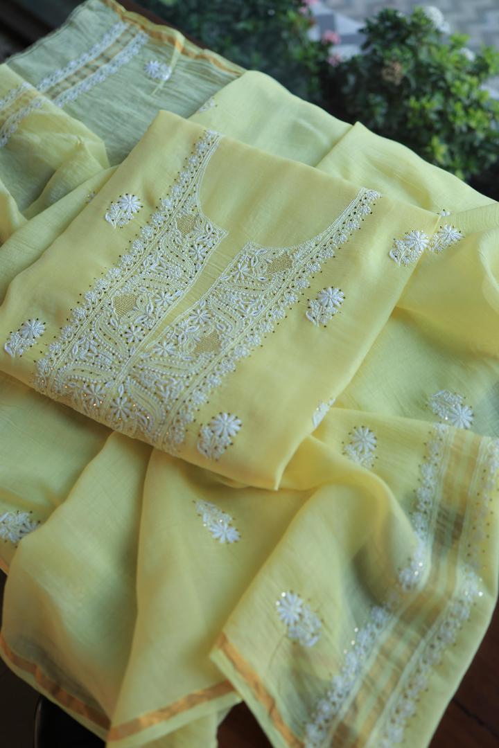 Lemon Yellow Mal Cotton Chikankari Unstitched Kurta Dupatta Fabrics With Kamdani