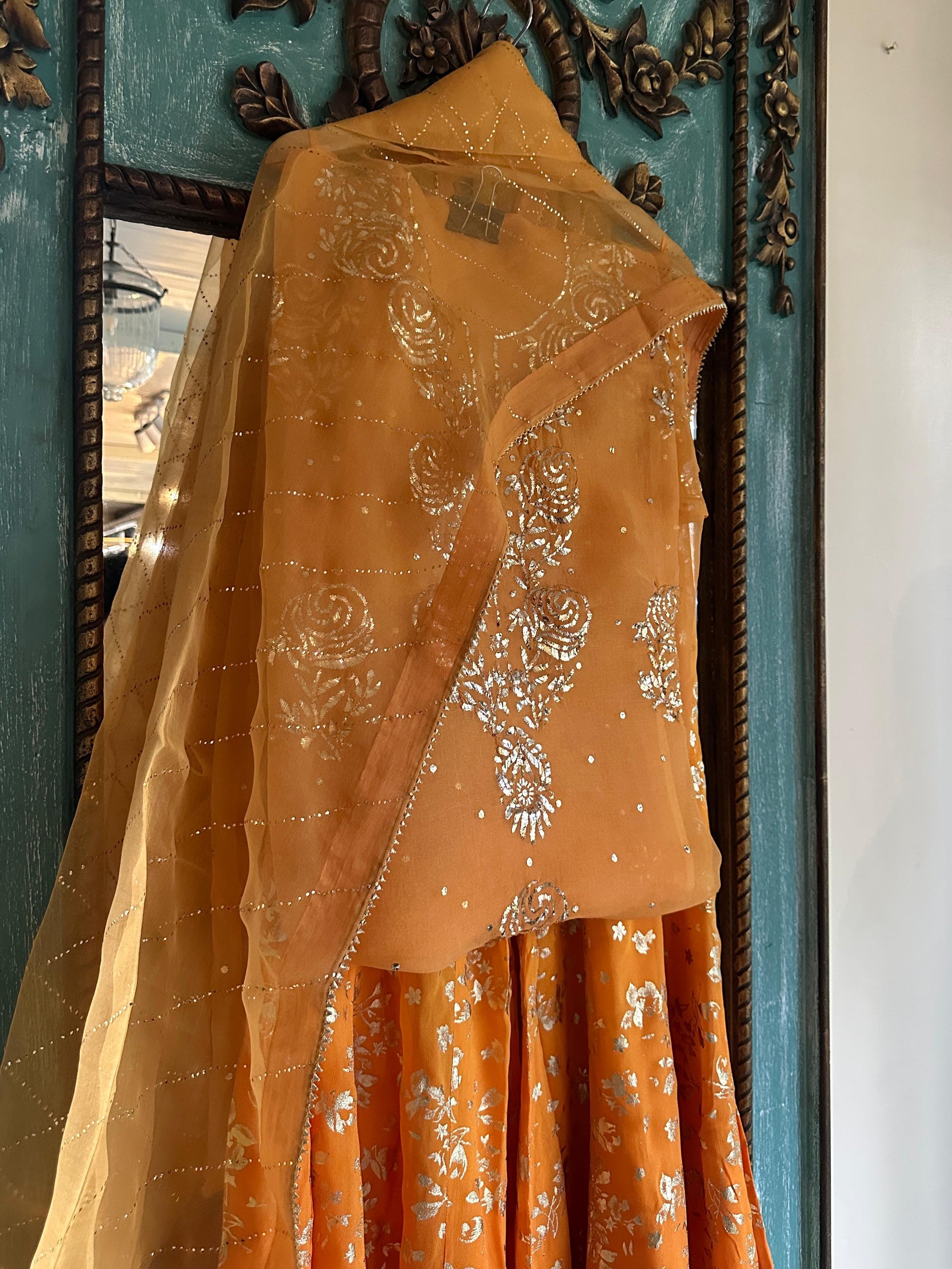 Saffron Shade Foil Print Organza Chikankari Sharara Set