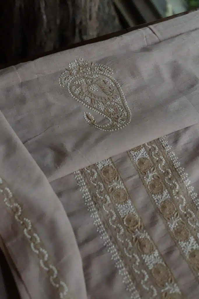 Our Men’s Chikankari Kurta, crafted from hand-spun khadi cotton. With a 3.5-meter fabric length, it features delicate pastel embroidery, perfect for all-year-round comfort and elegance.
