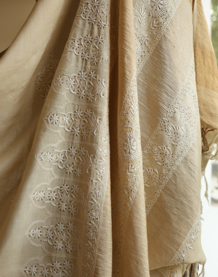 BASAK our Natural Moonga silk range ..with intricate chikankari work with the accents of all over work done with beige and white embroidery..to make a classic ensemble for semi as well as formal occasions.