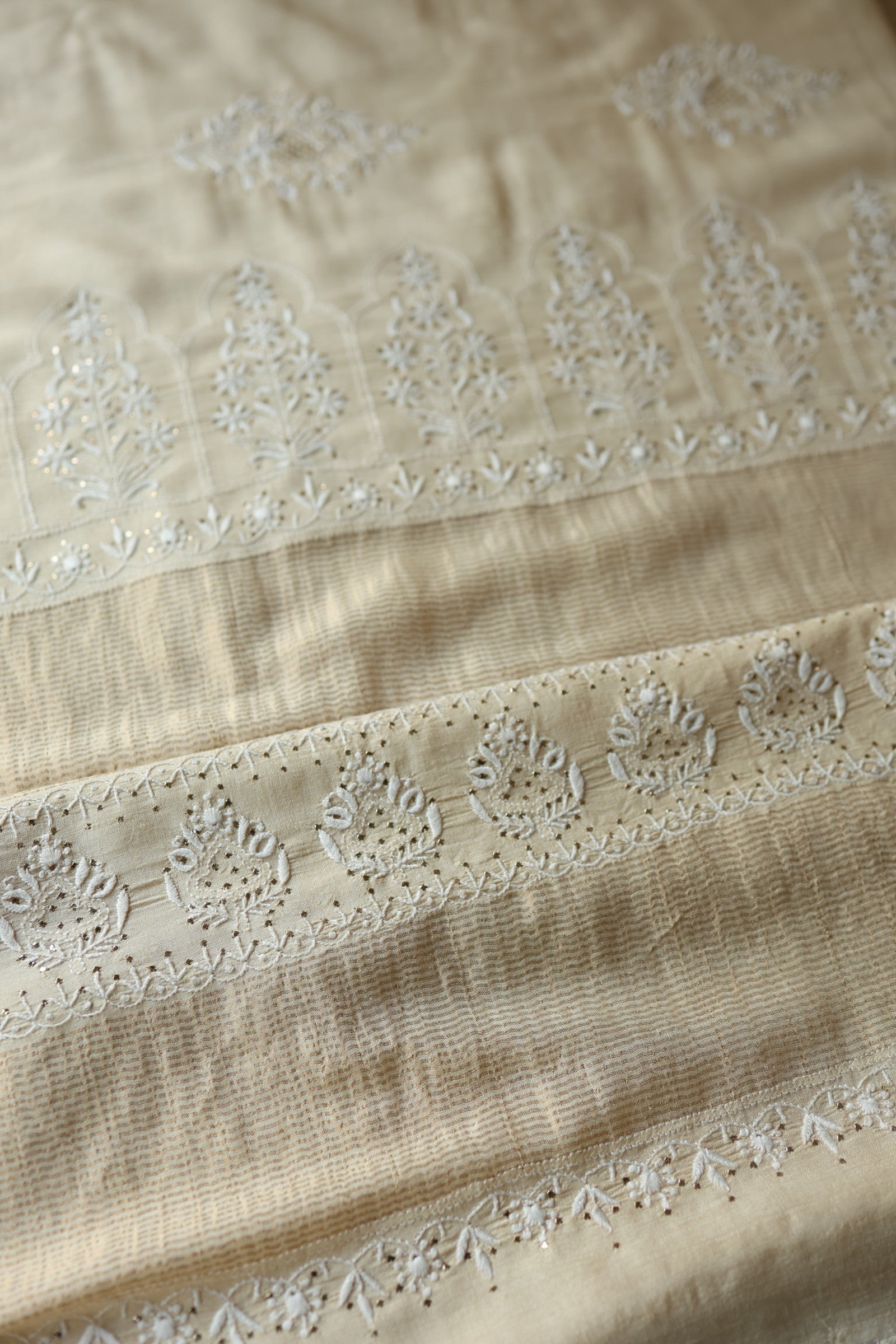 Each piece is crafted with intricate hand-embroidered Chikankari, featuring different traditional embellishments: