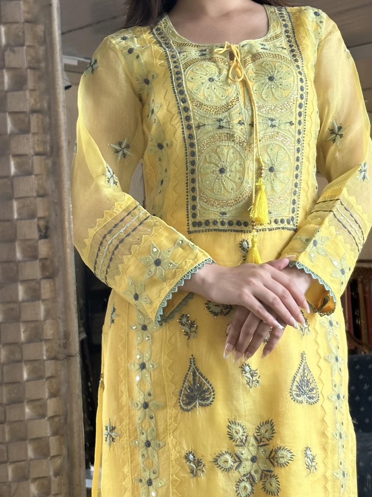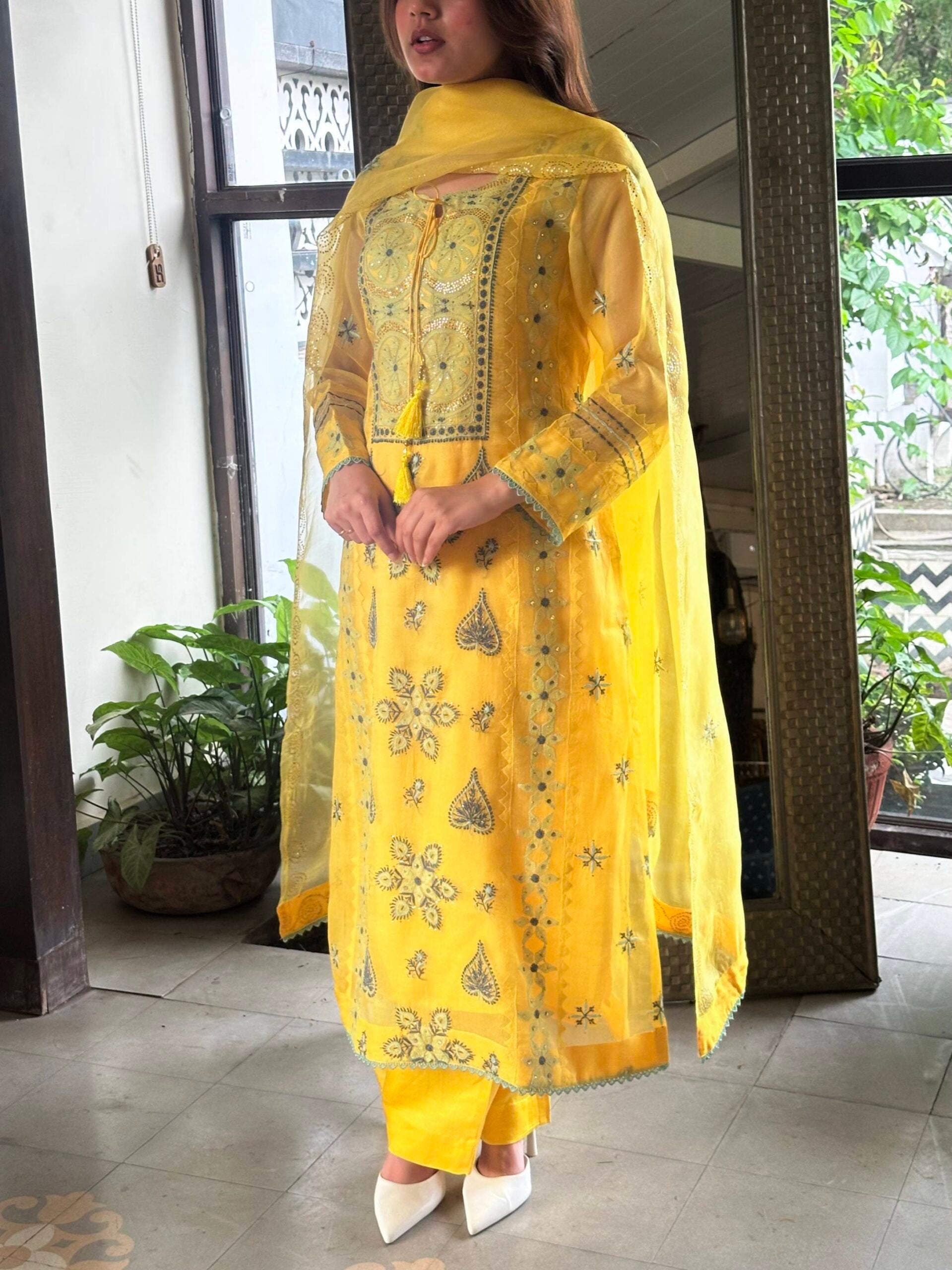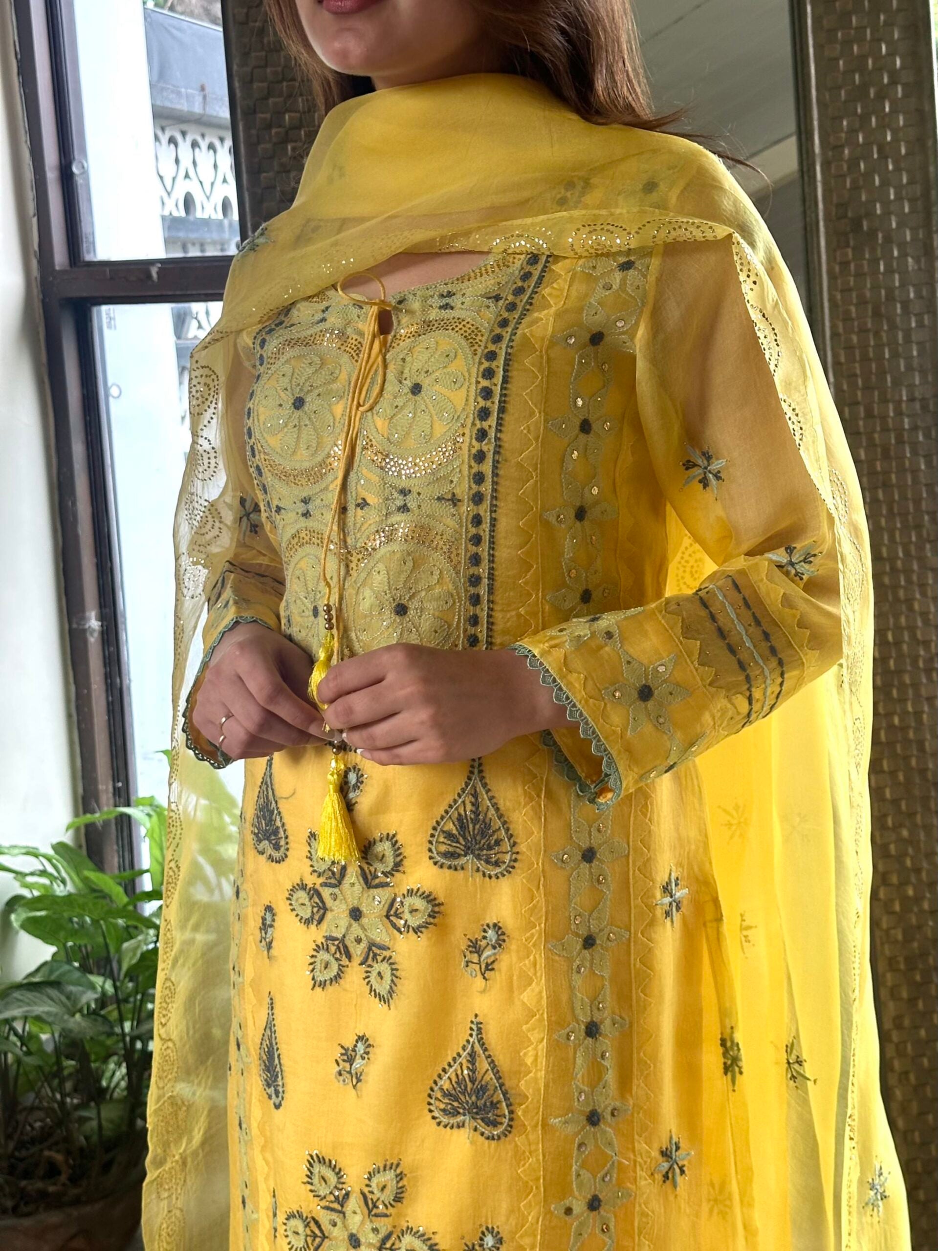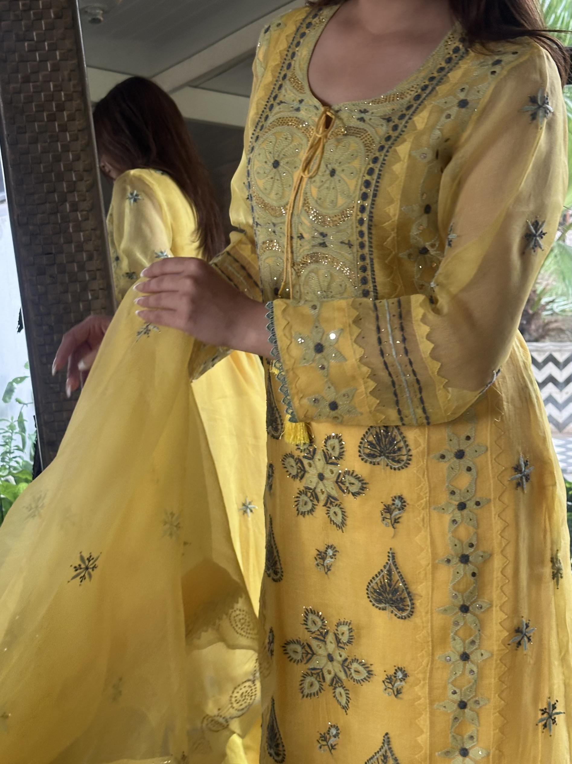 Mango Yellow Noor Organza Silk Chikankari Kurta Dupatta Set With Mukaish Kamdani