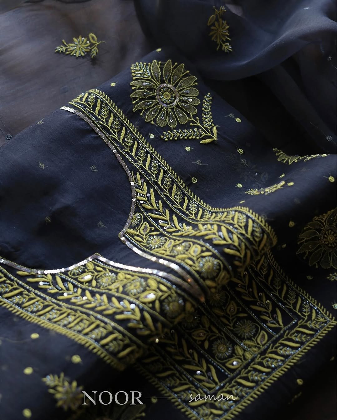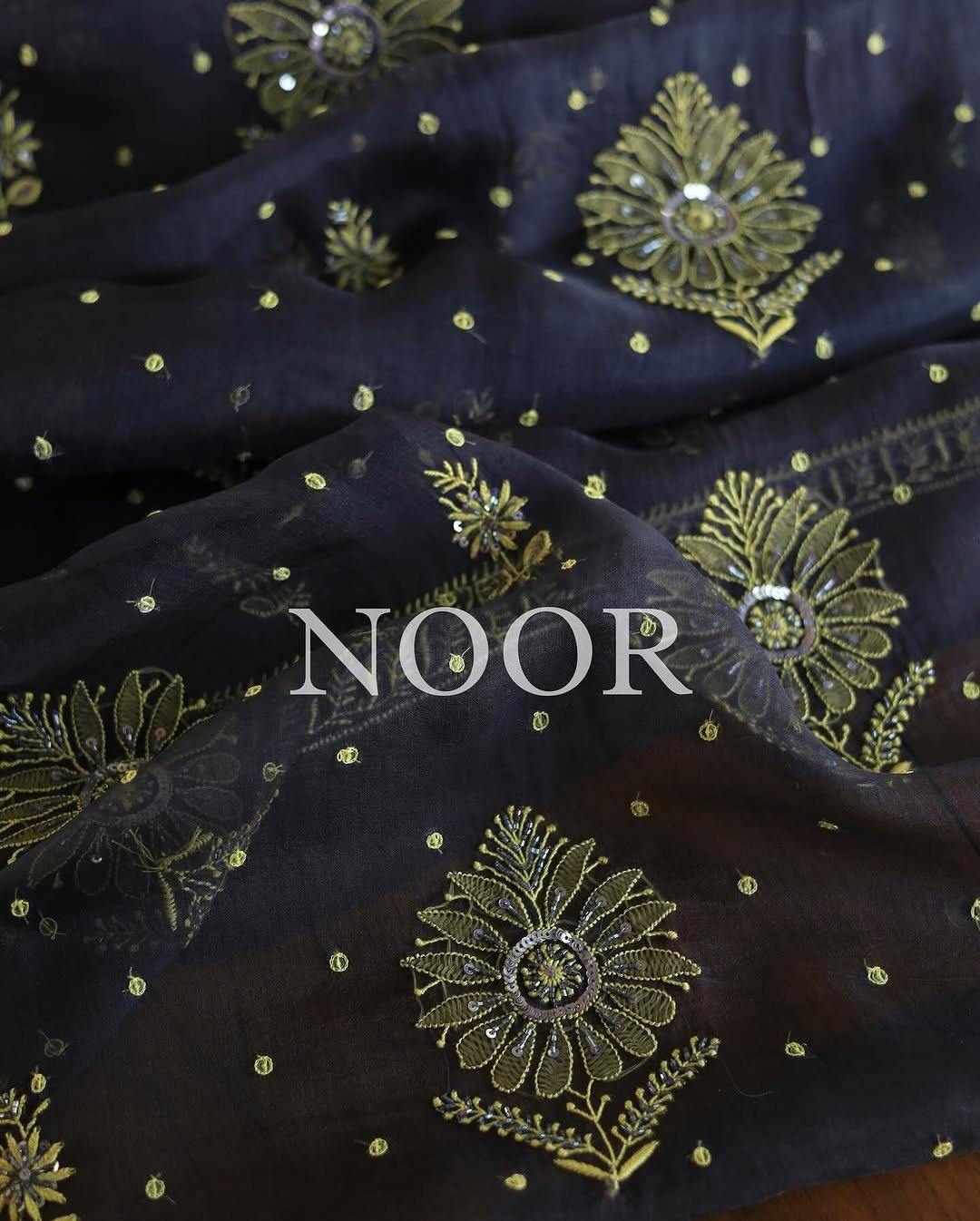 Noor Organza on beautiful shade done with contrasting white Chikankari embroidery and our signature ari & beads work.