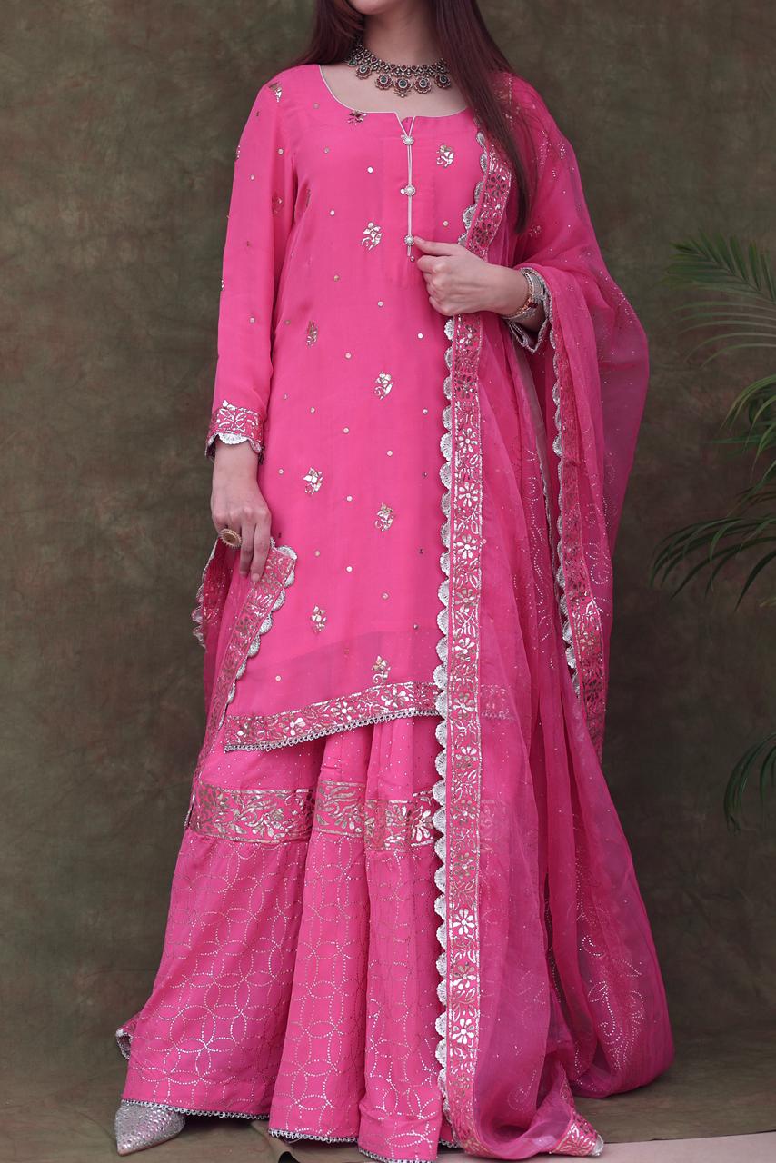 A radiant Rani Pink festive ensemble crafted in luxurious pure georgette, beautifully adorned with traditional mukaish kamdani and intricate badla work that adds a subtle shimmer. The straight-cut kurta features delicate hand-done metallic accents, paired with a gracefully flared gharara enhanced with coordinated detailing and an ornate border. The look is completed with a sheer organza dupatta finished with scalloped gota lace edging, creating an elegant and timeless outfit perfect for mehndi functions, festive gatherings, and special celebrations.