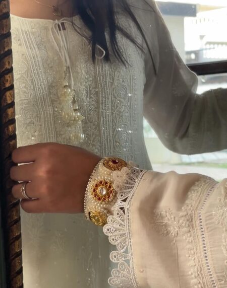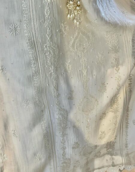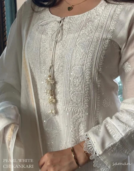 Chikankari on soft mals with our signature ari pearl and sequins comes with kurta and dupatta, perfect for upcoming festivities.