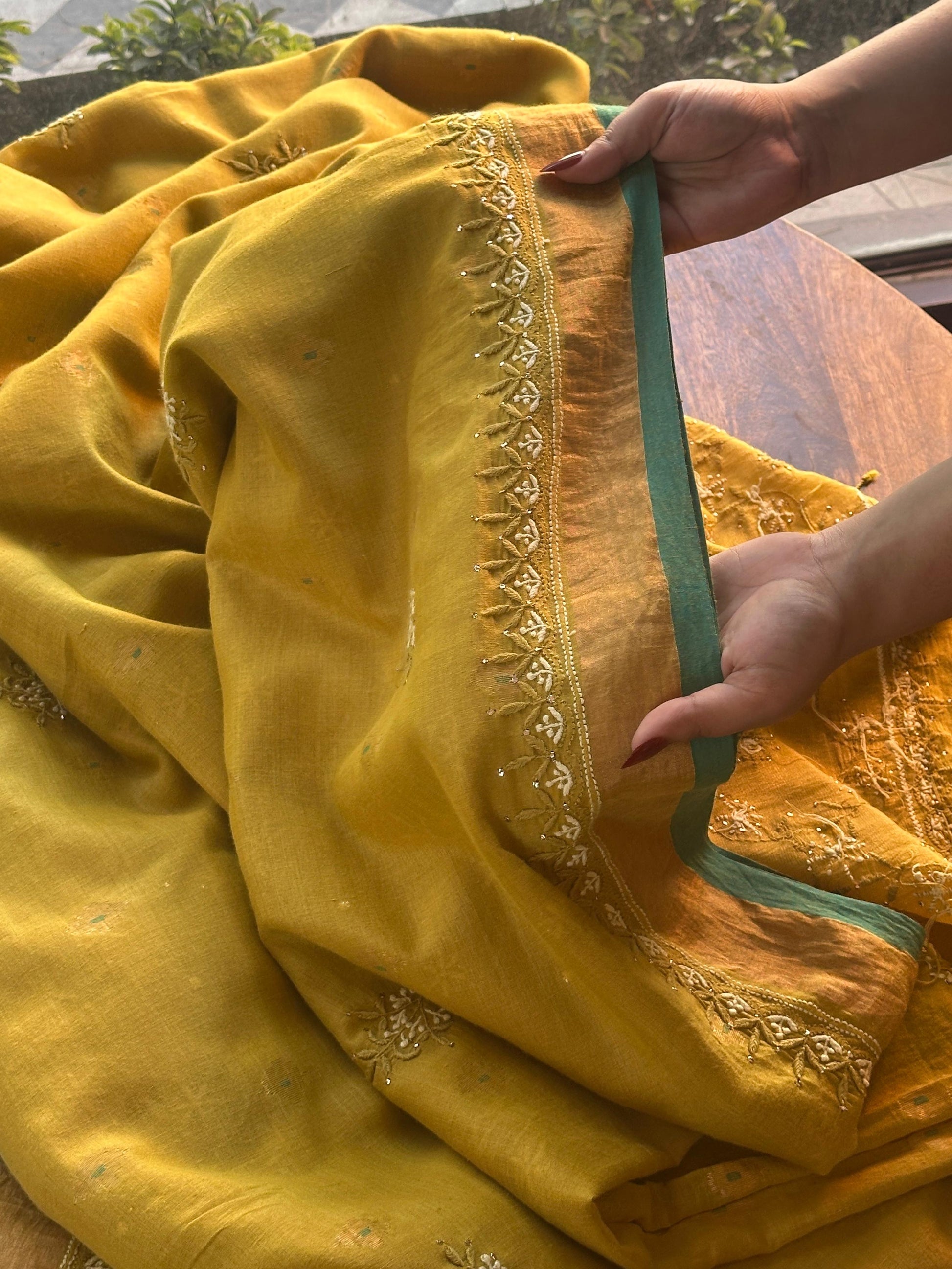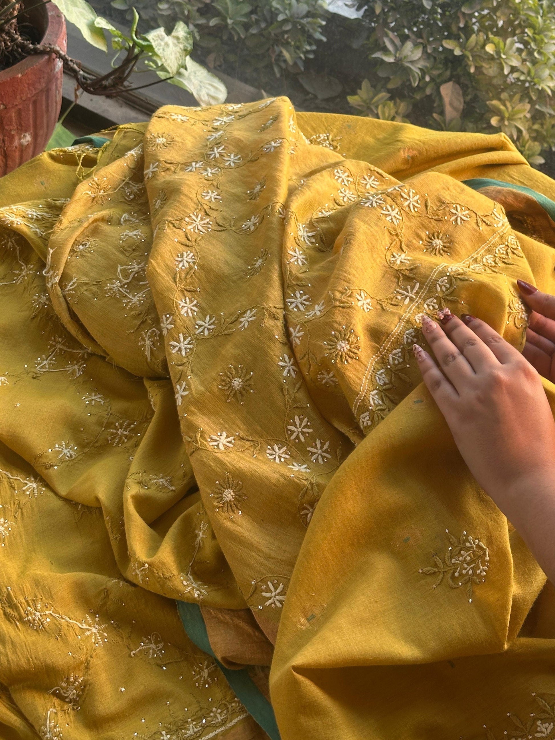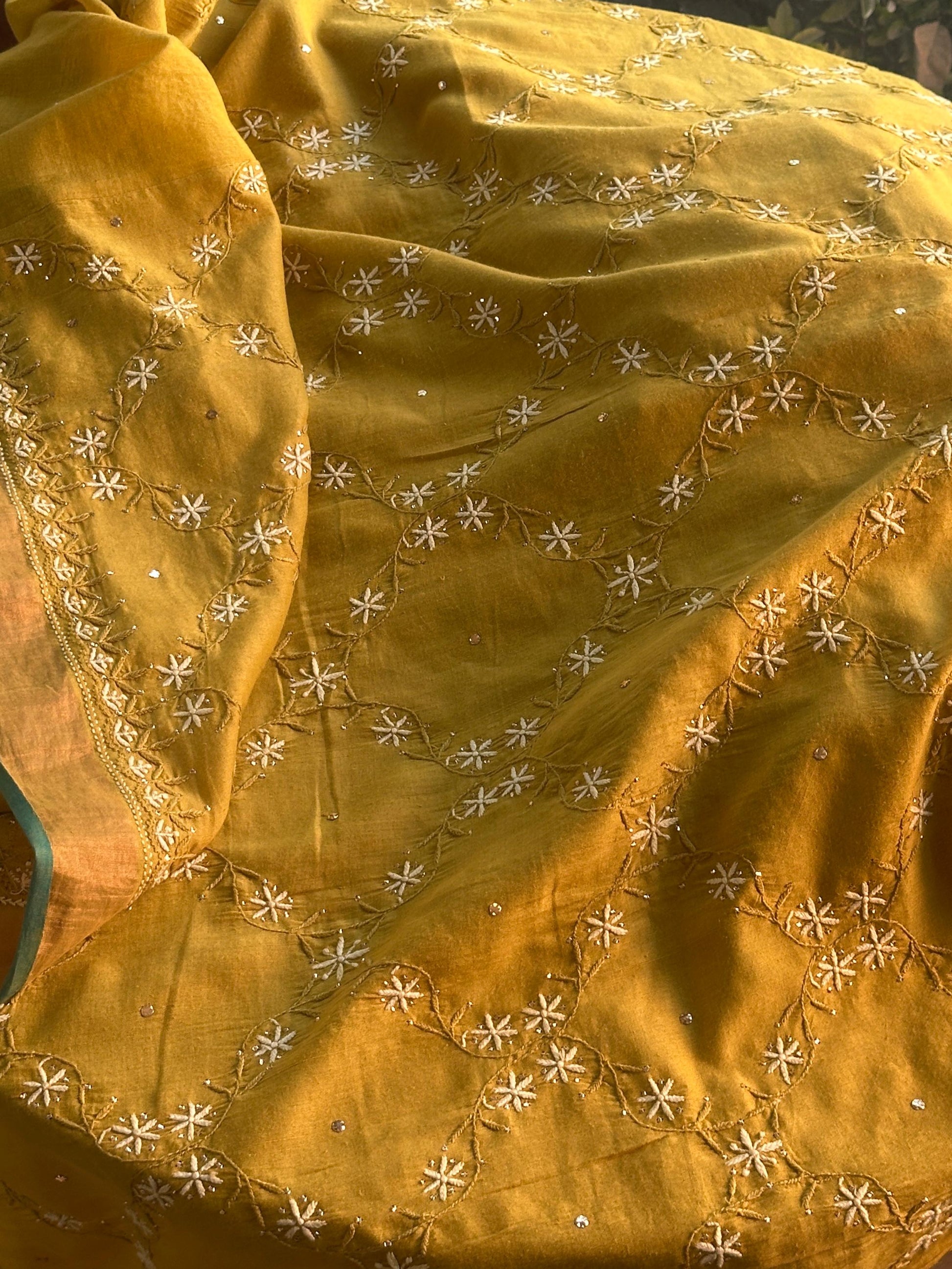 This mustard Chanderi saree is all about subtle elegance and timeless charm. The saree is beautifully adorned with hand chikankari embroidery, featuring soft floral patterns spread evenly across the fabric. The delicate white threadwork with light sequin touches adds just the right amount of grace without making it look heavy.