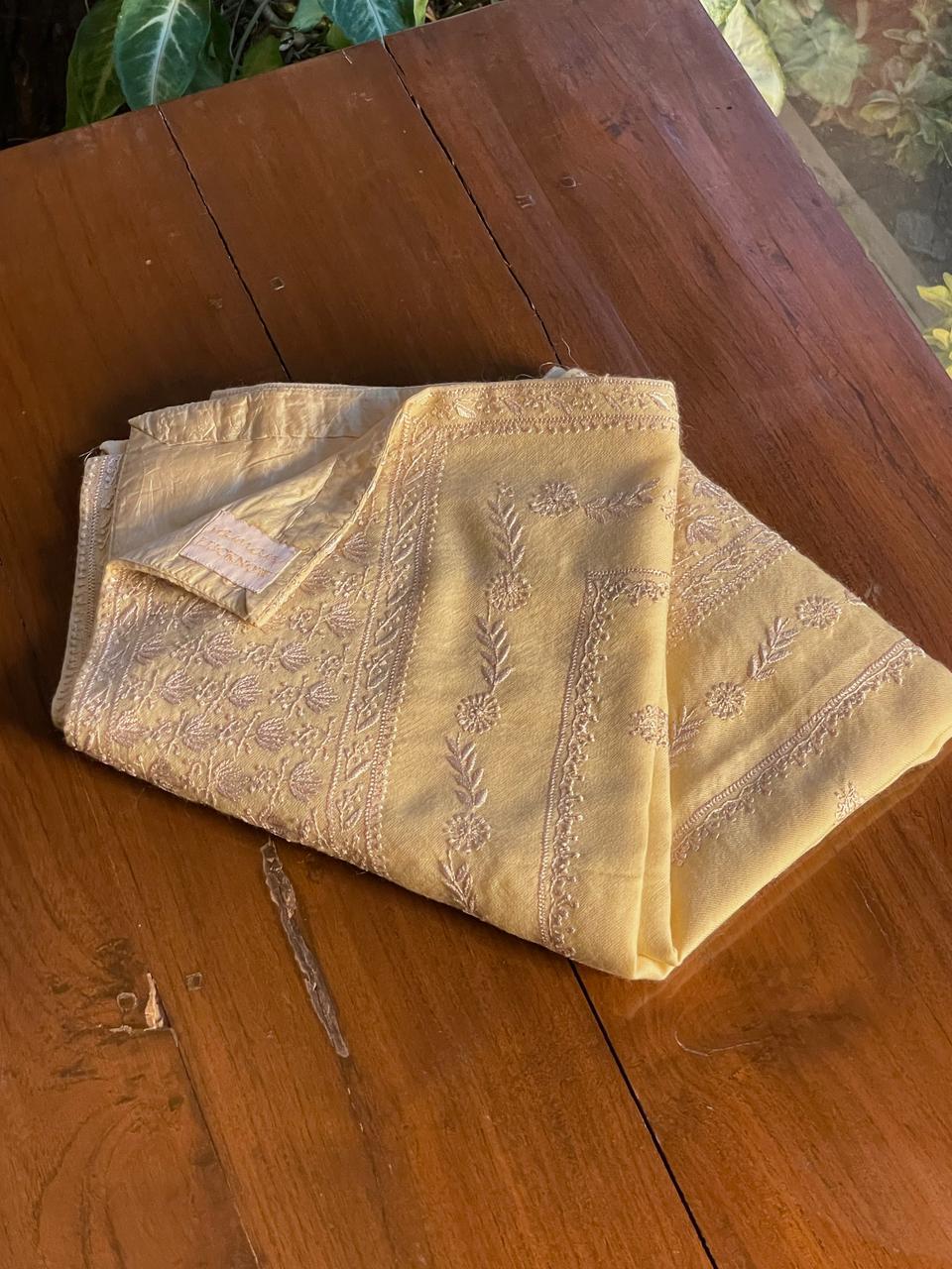Soft shades of valley on Pashmina weaved stole/shawl done with our signature resham Chikankari and finished with satin on all four sides.