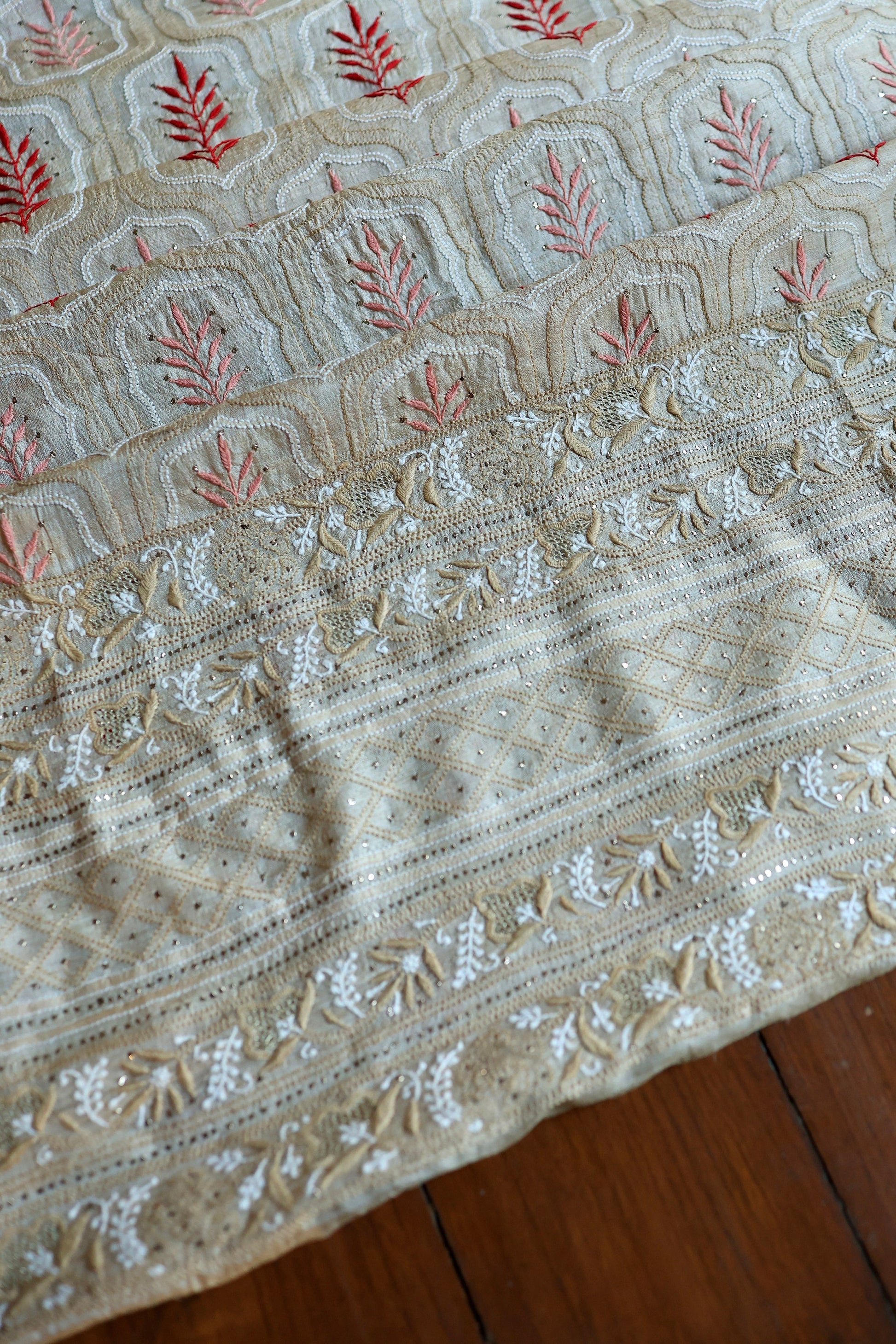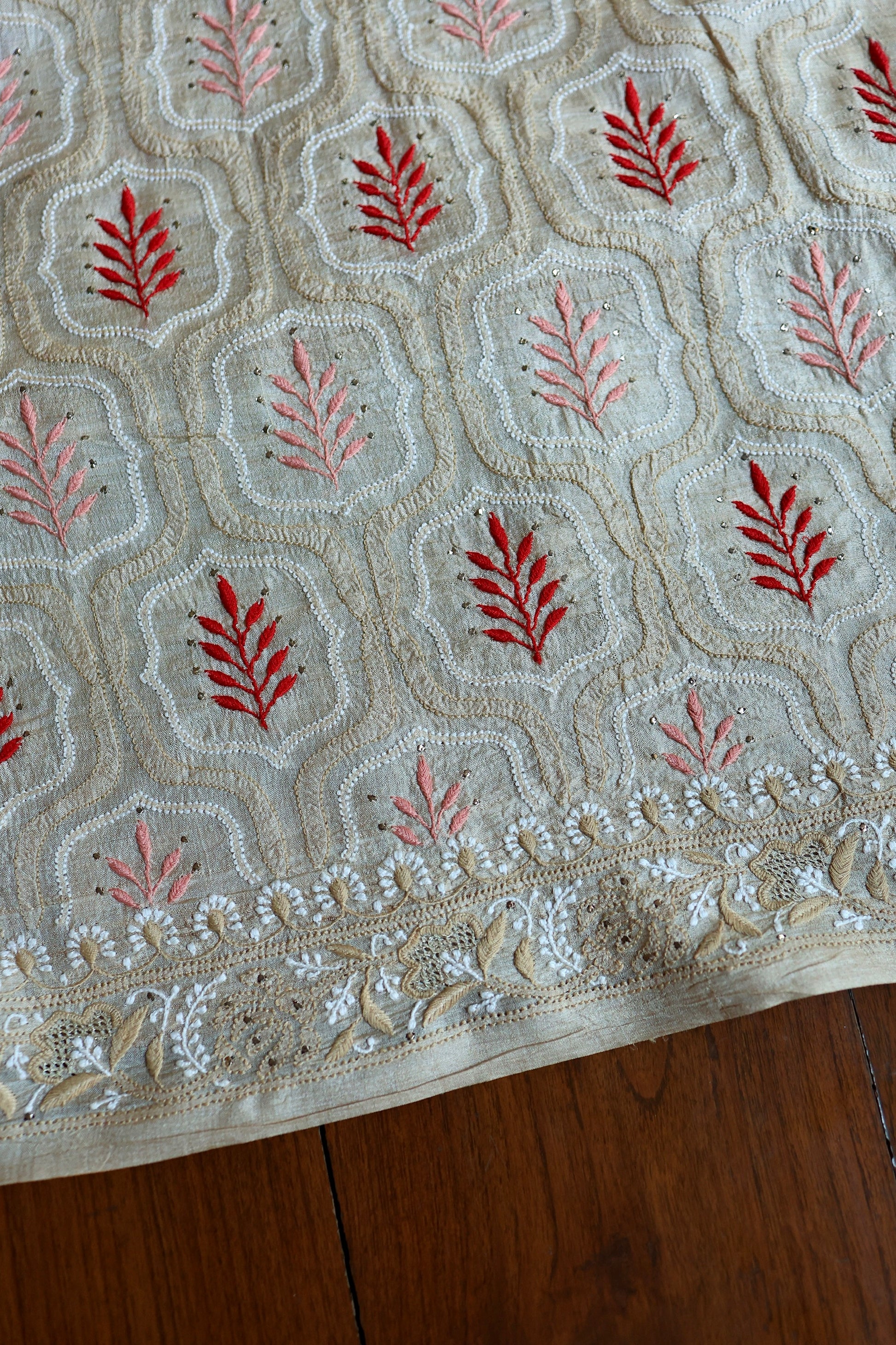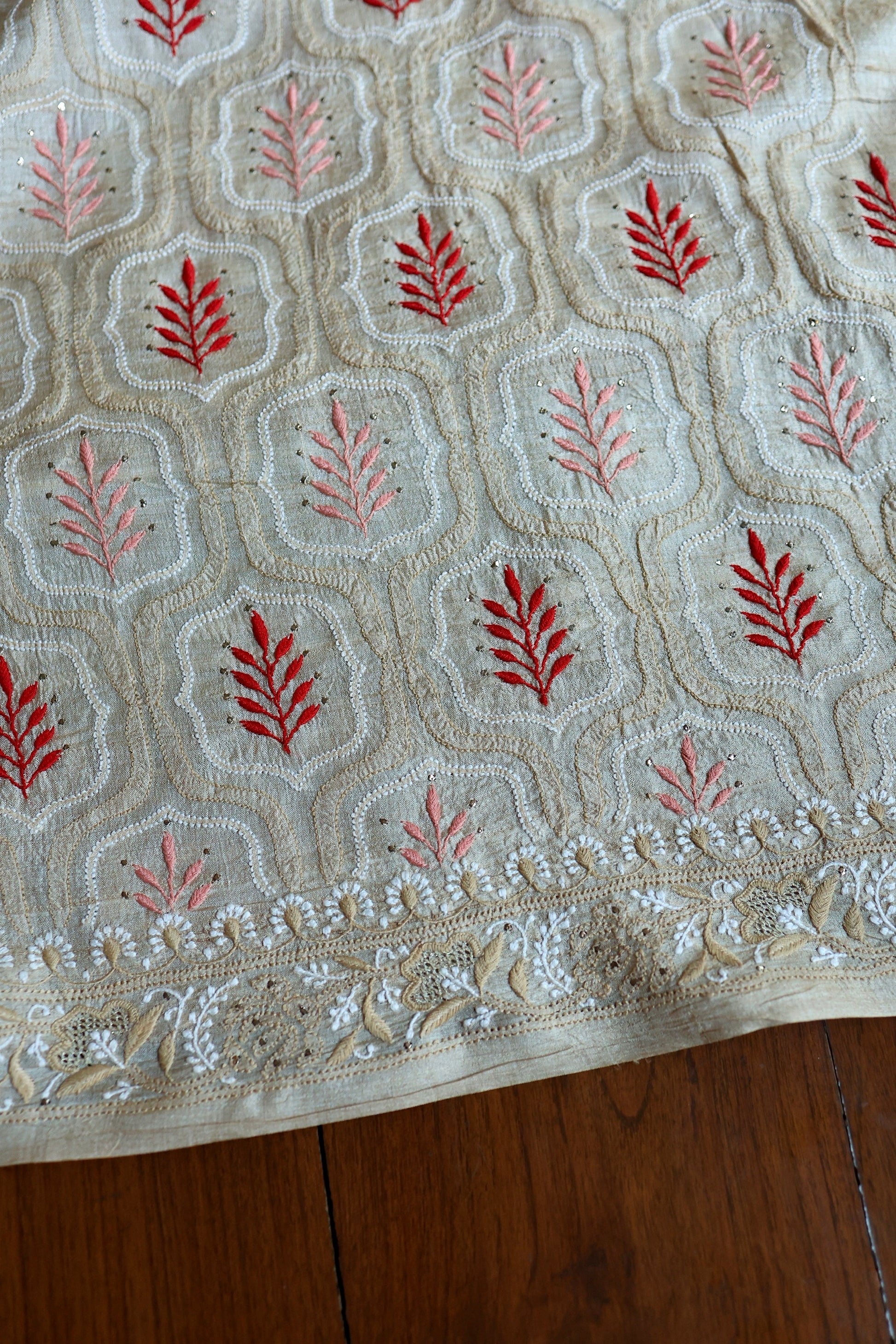 Red & Peach Natural Beige Tussar Silk Chikankari Fabric With Mukaish Kamdani