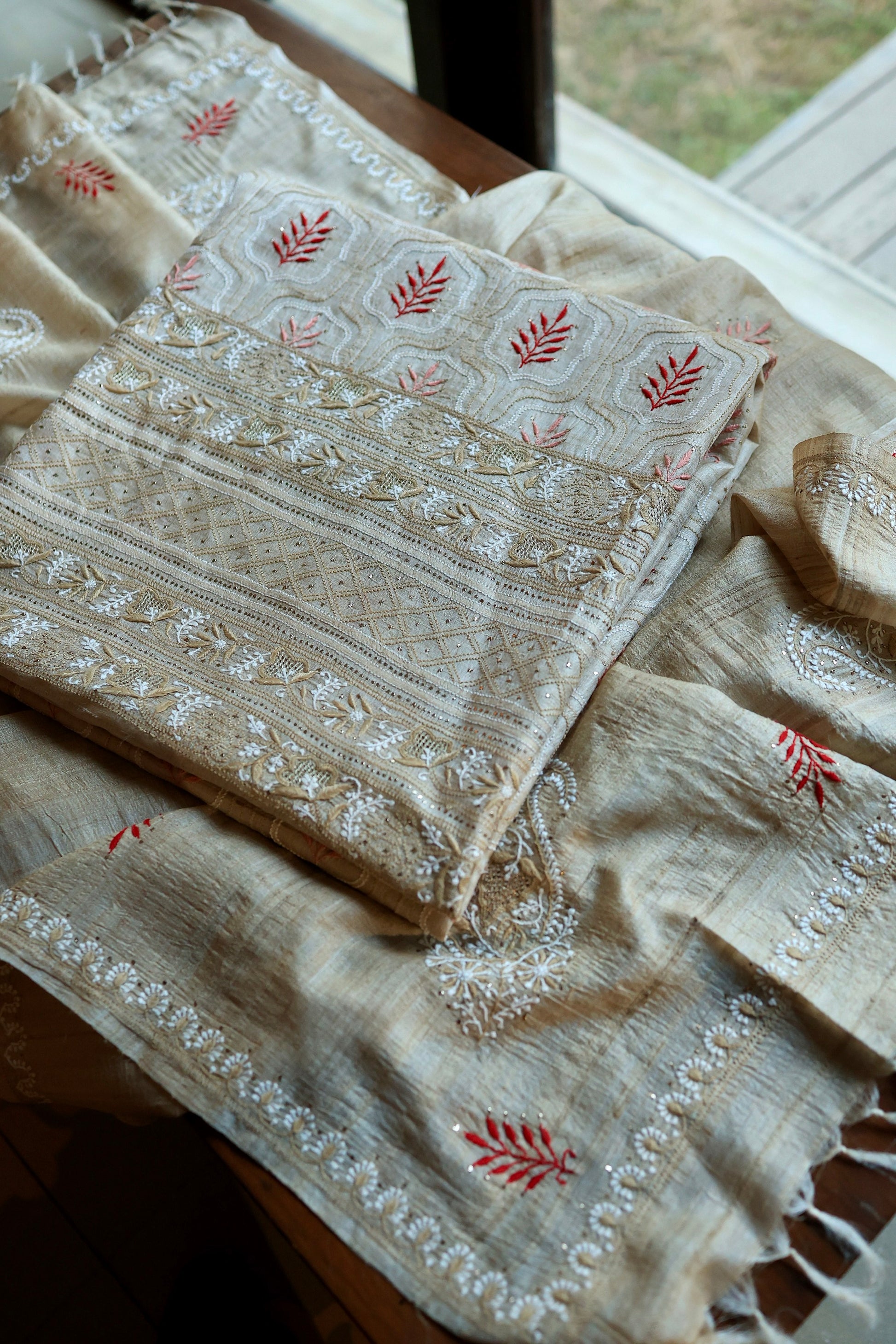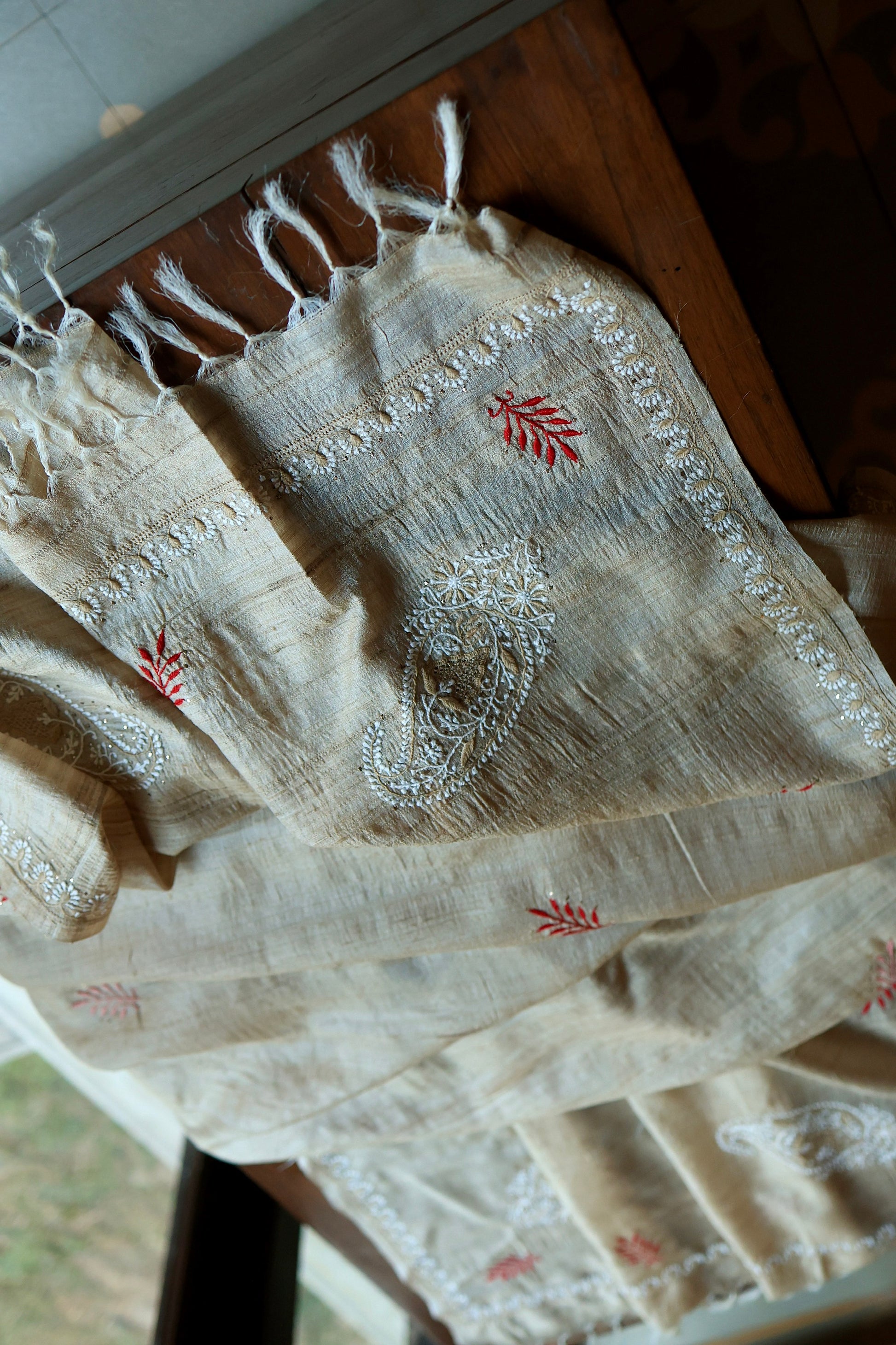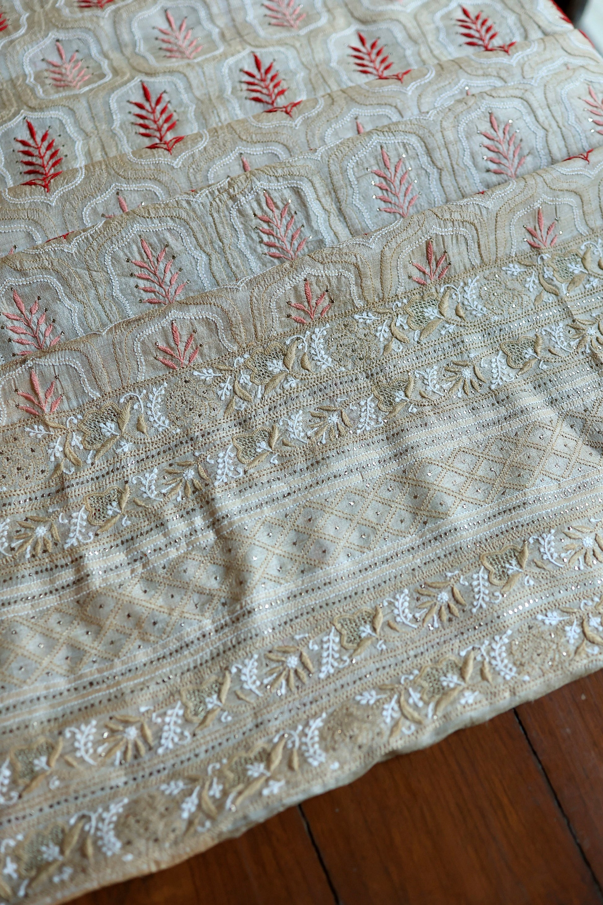 Red & Peach Natural Beige Tussar Silk Chikankari Fabric With Mukaish Kamdani