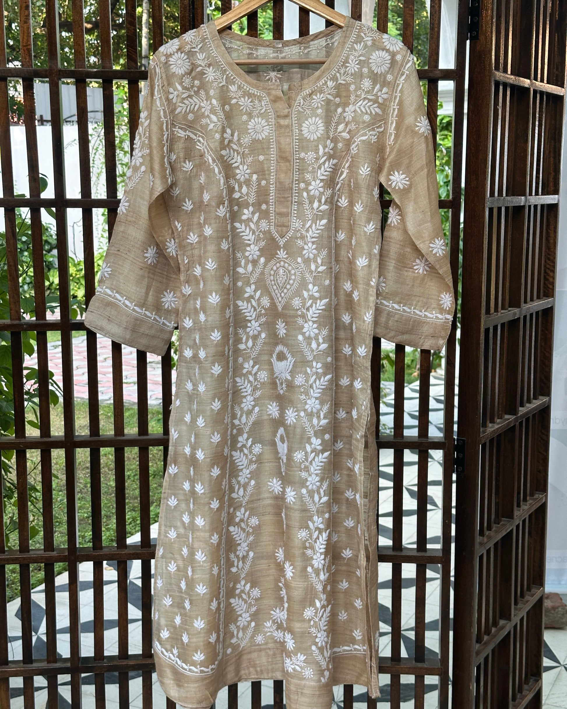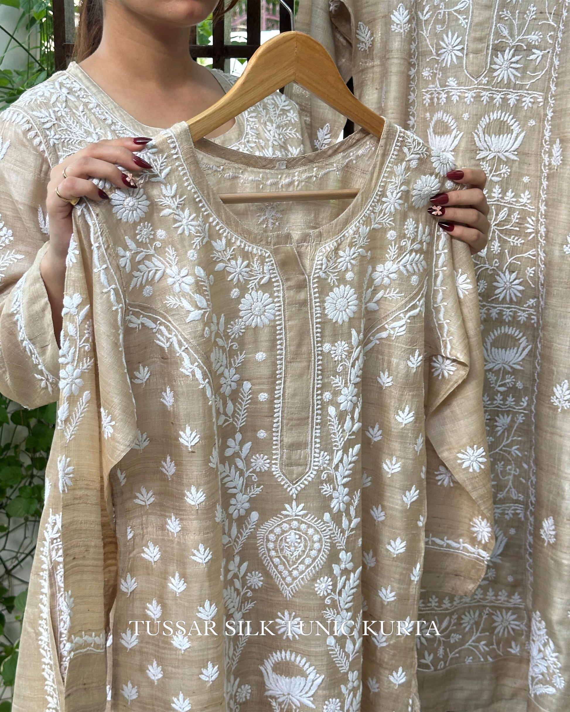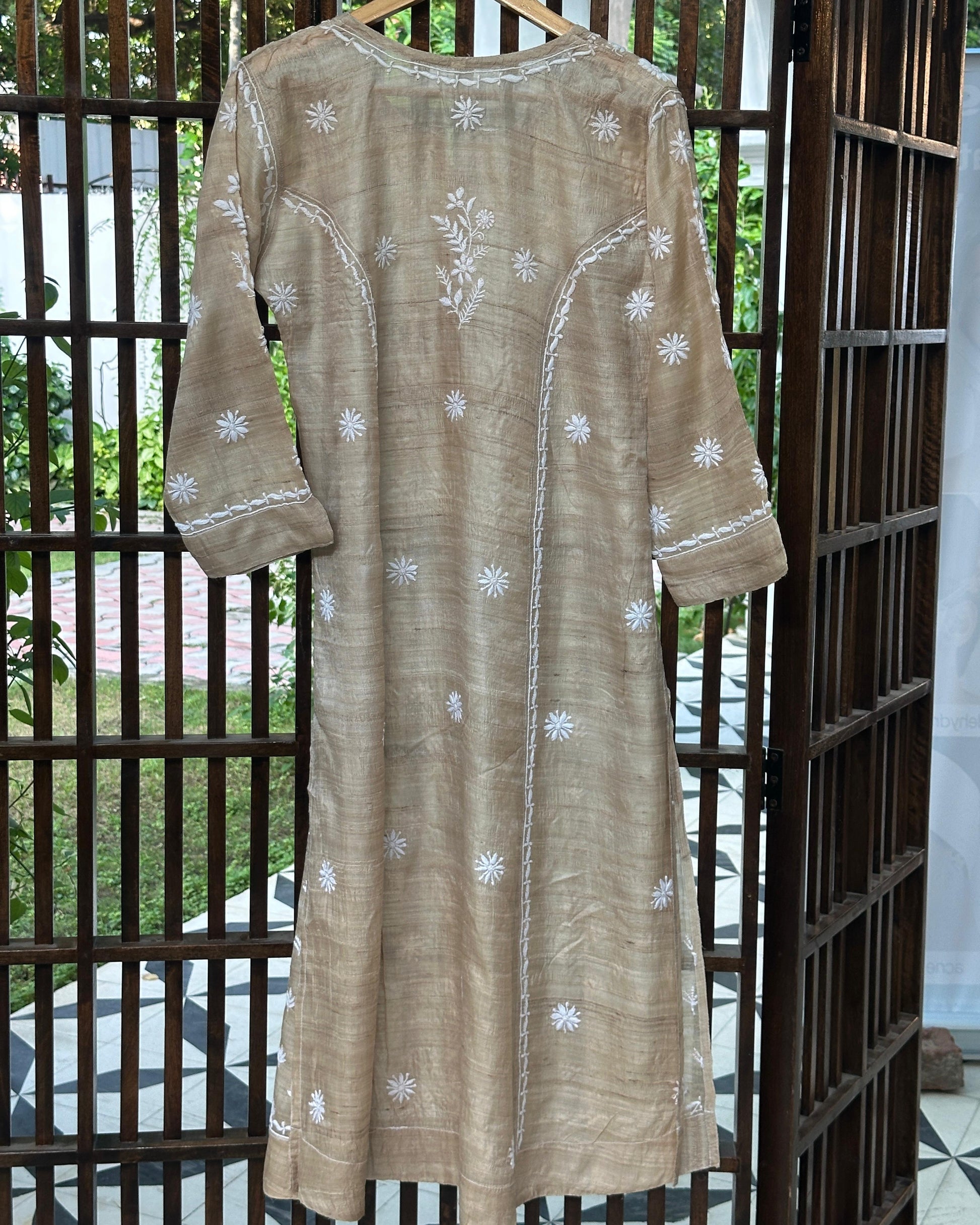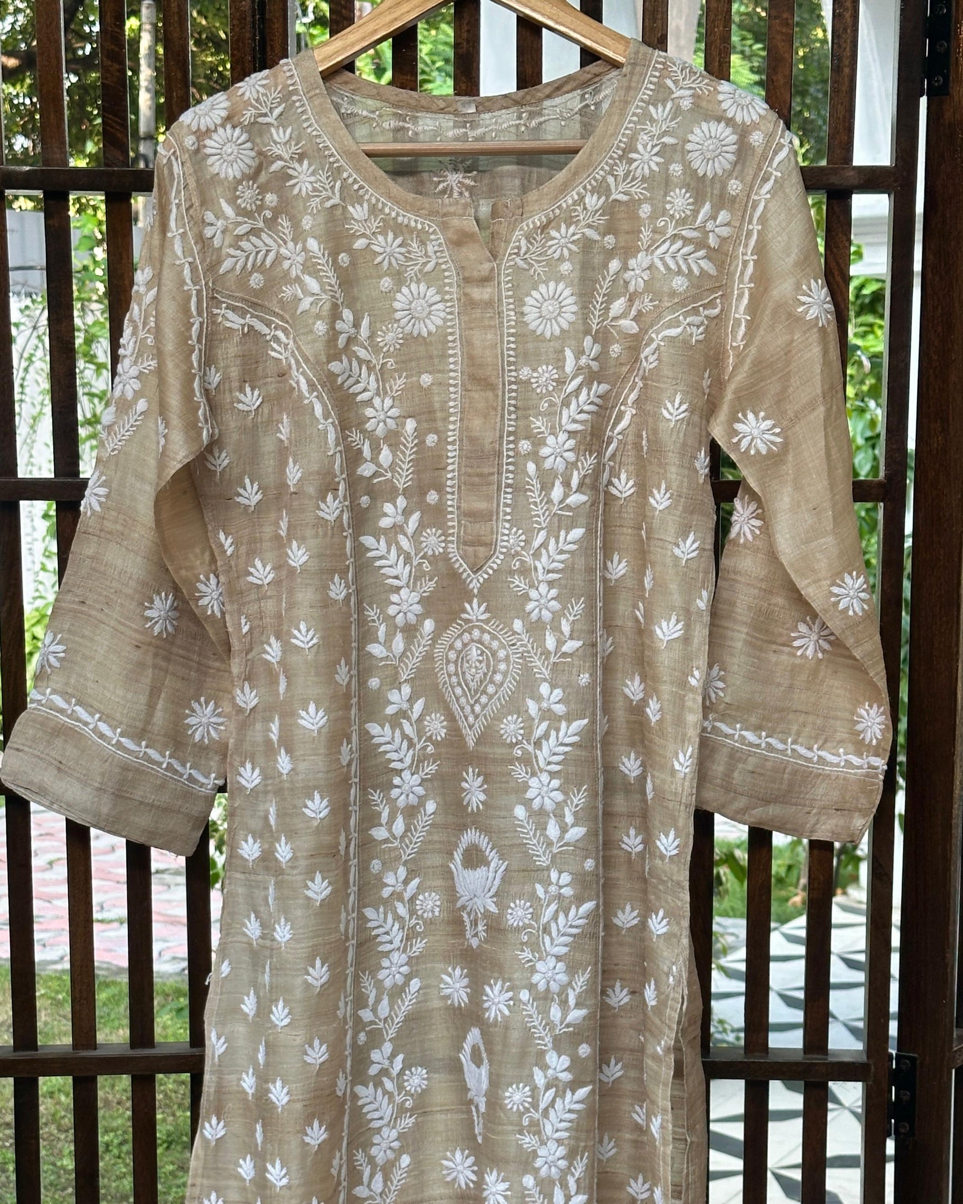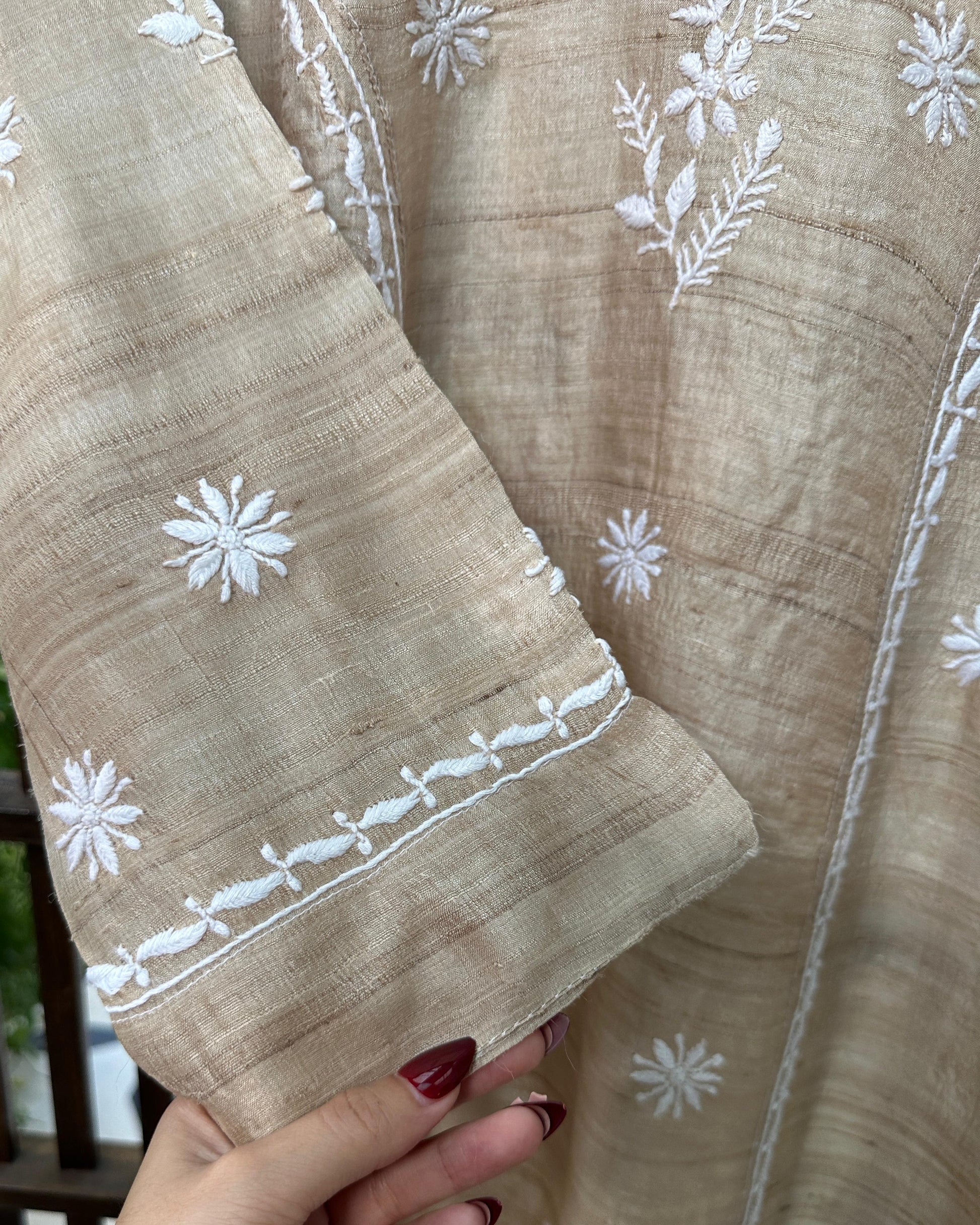 A natural tussar silk kurta adorned with delicate white thread chikankari embroidery. The rich texture of tussar silk blends beautifully with the fine, hand-stitched patterns, creating a piece that is both timeless and elegant.