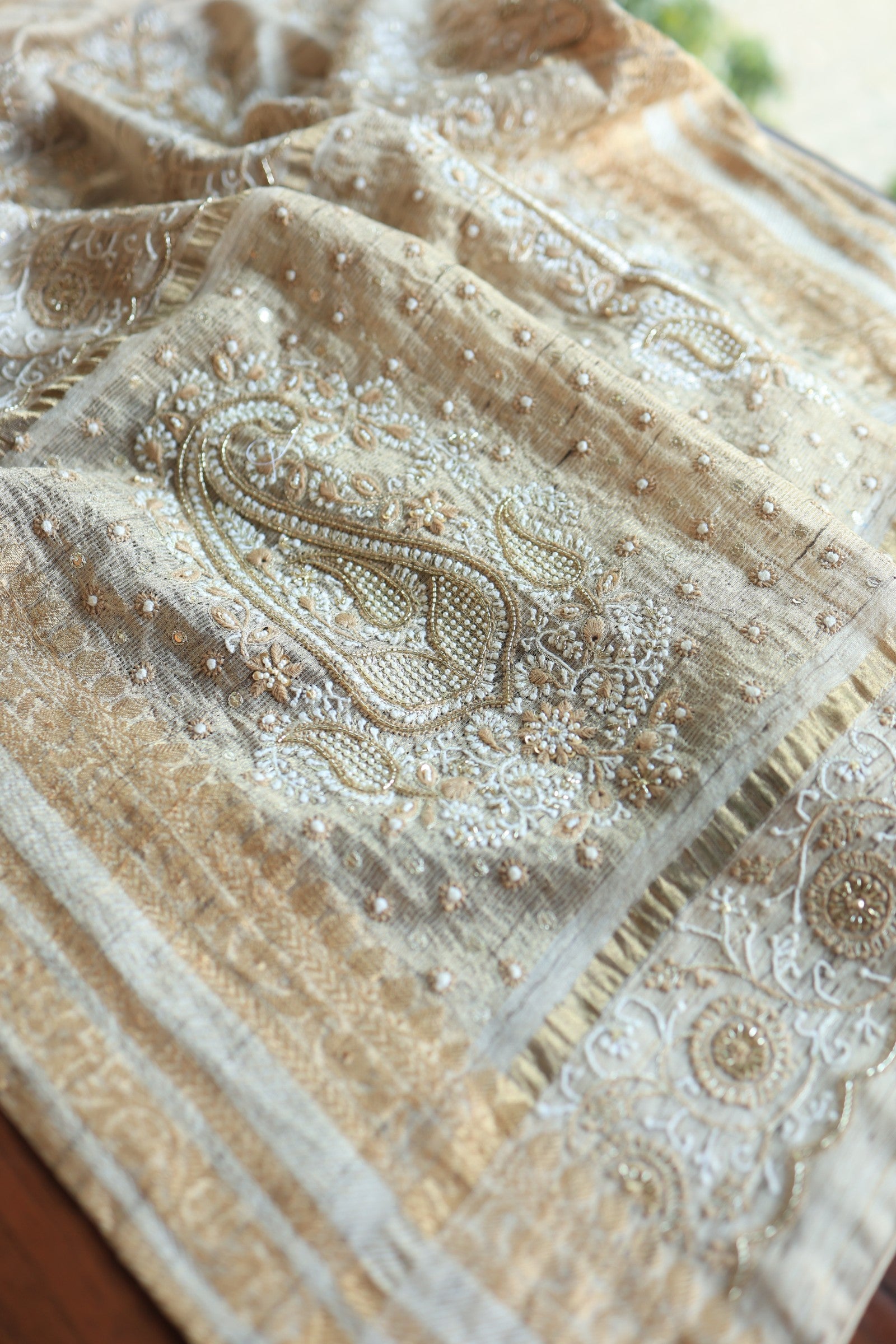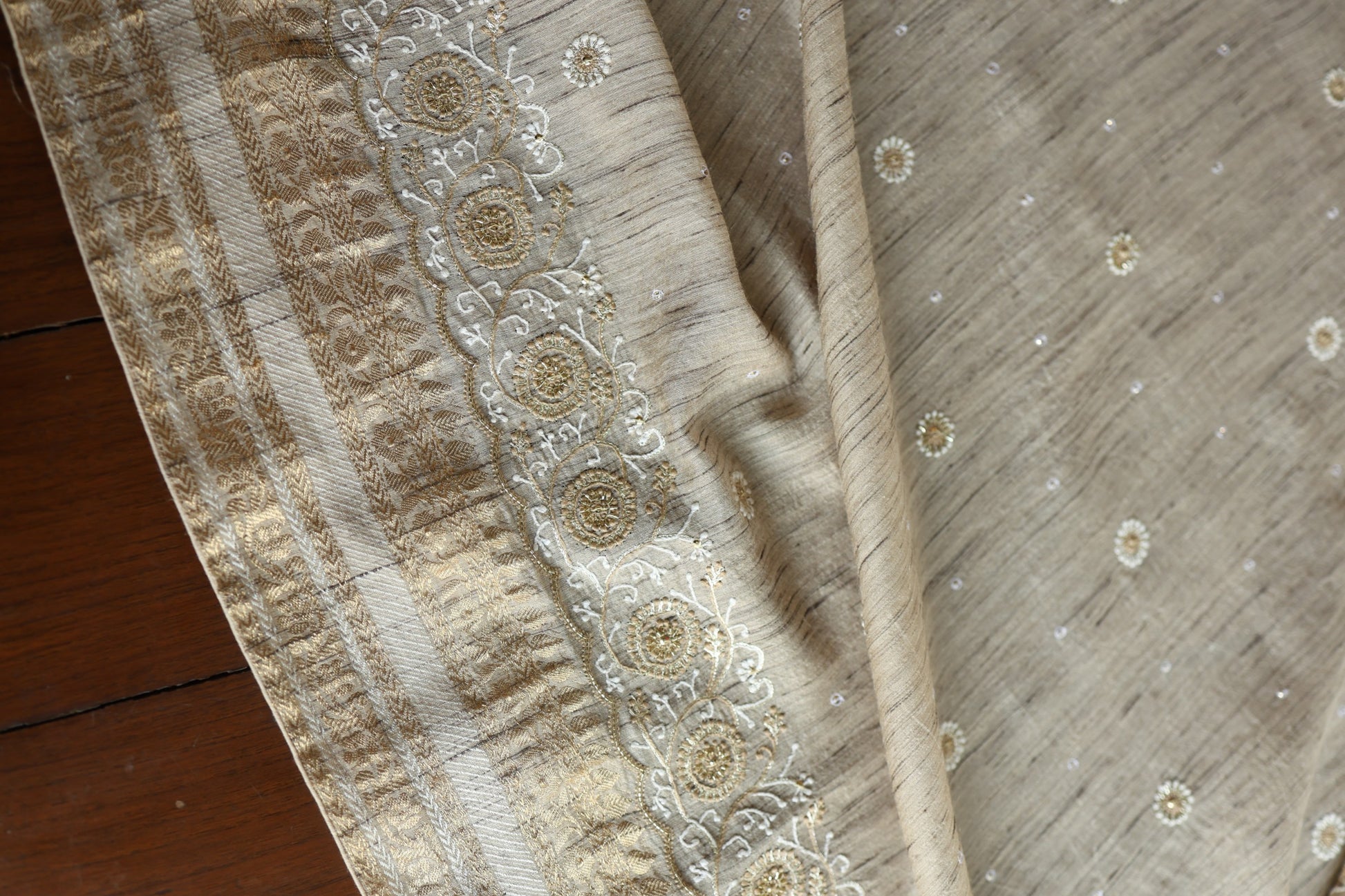 Natural tussar silk saree with intricate dual shade chikankari embroidered adorned with subtle kamdani for the classic look.