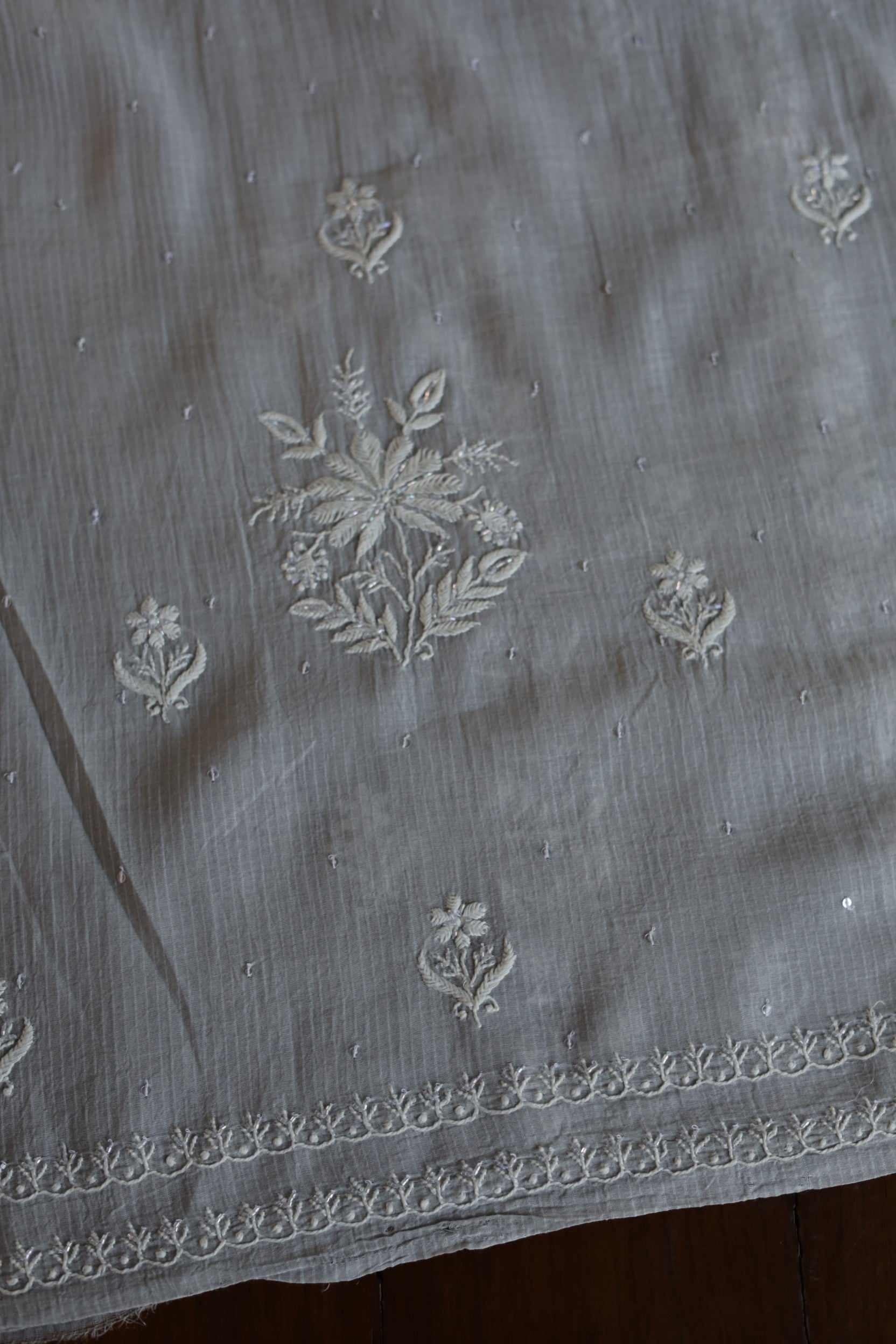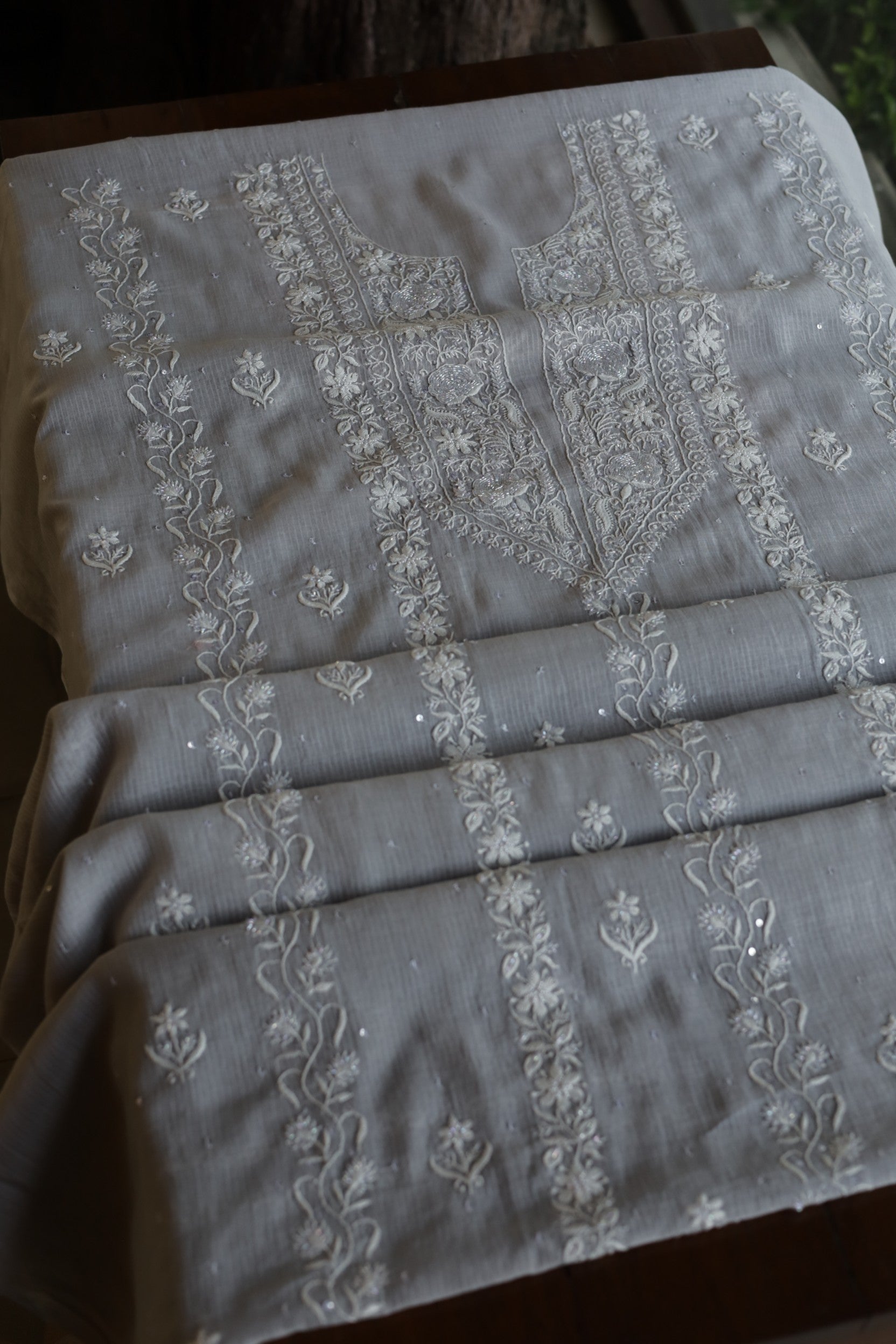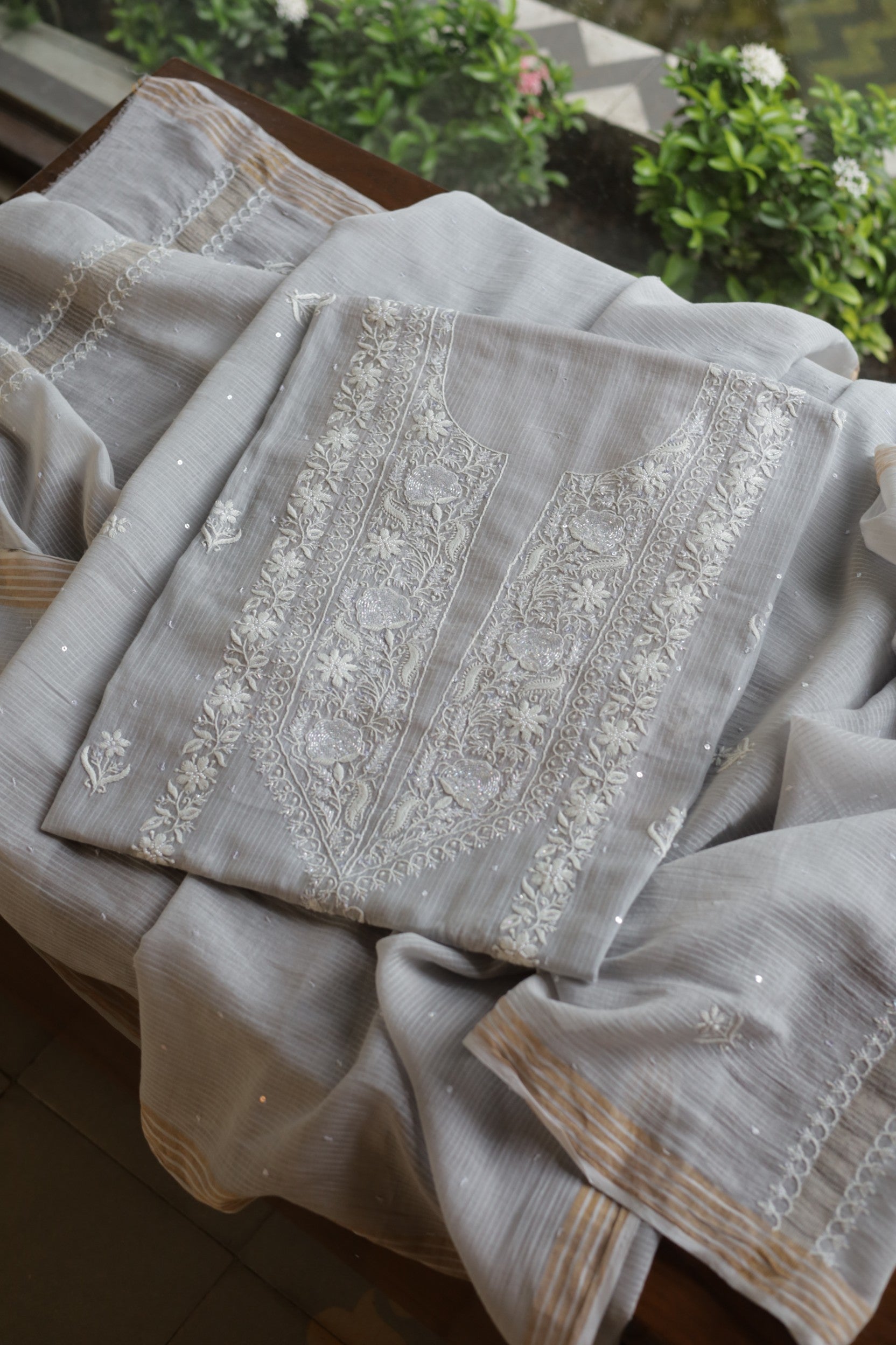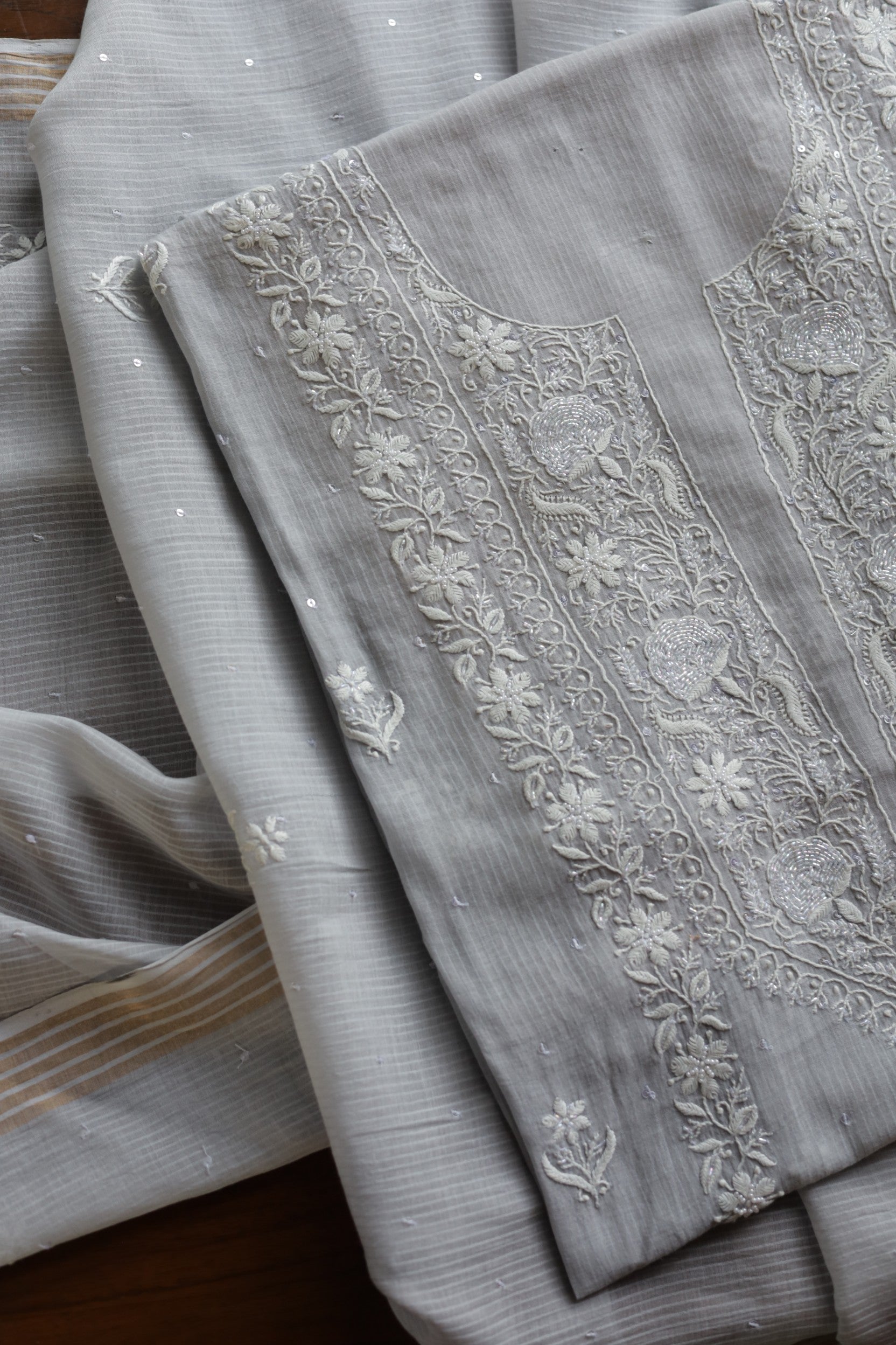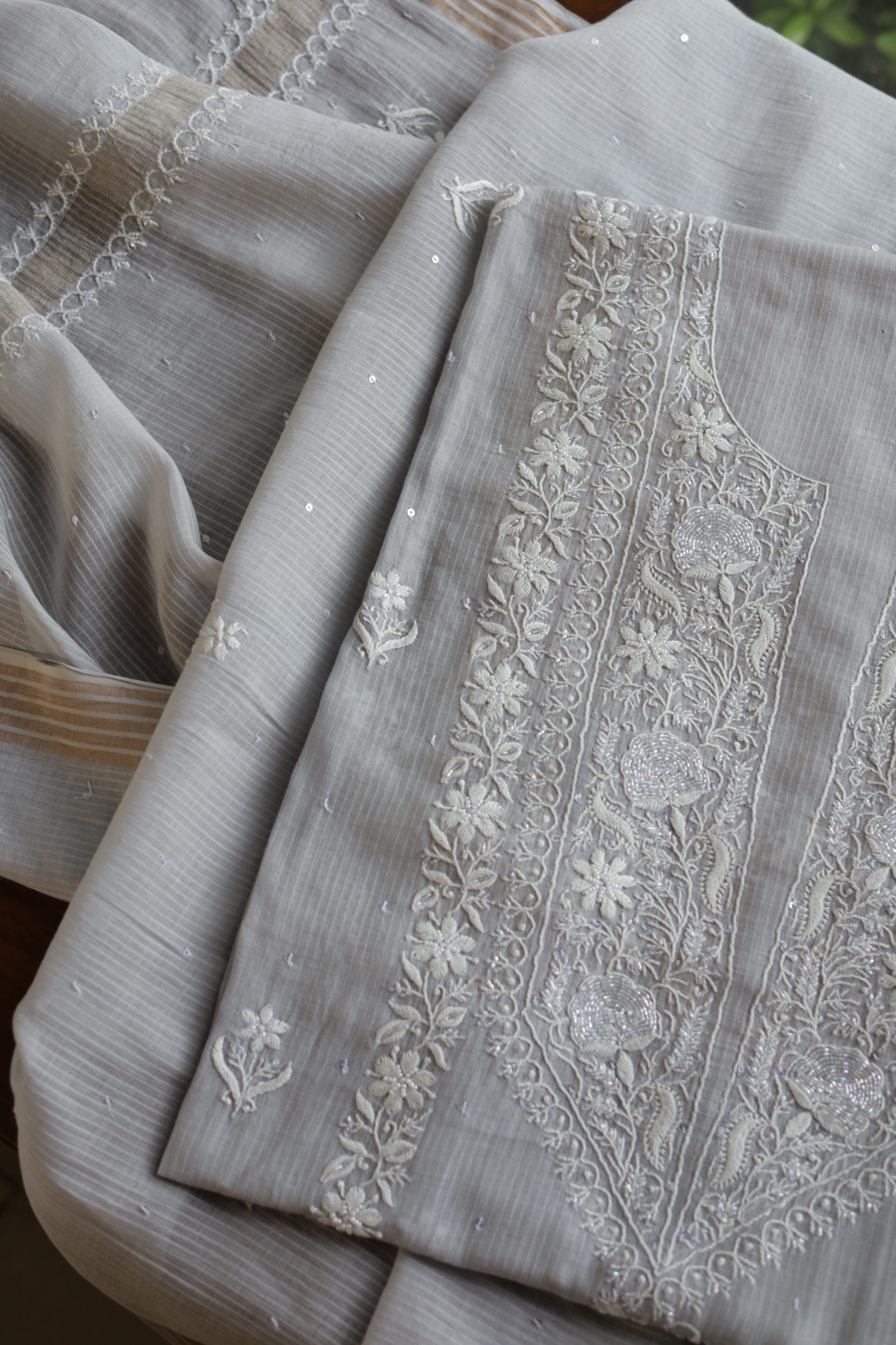 Natural Grey Shade Maheshwari Pearl Work Chikankari Fabrics
