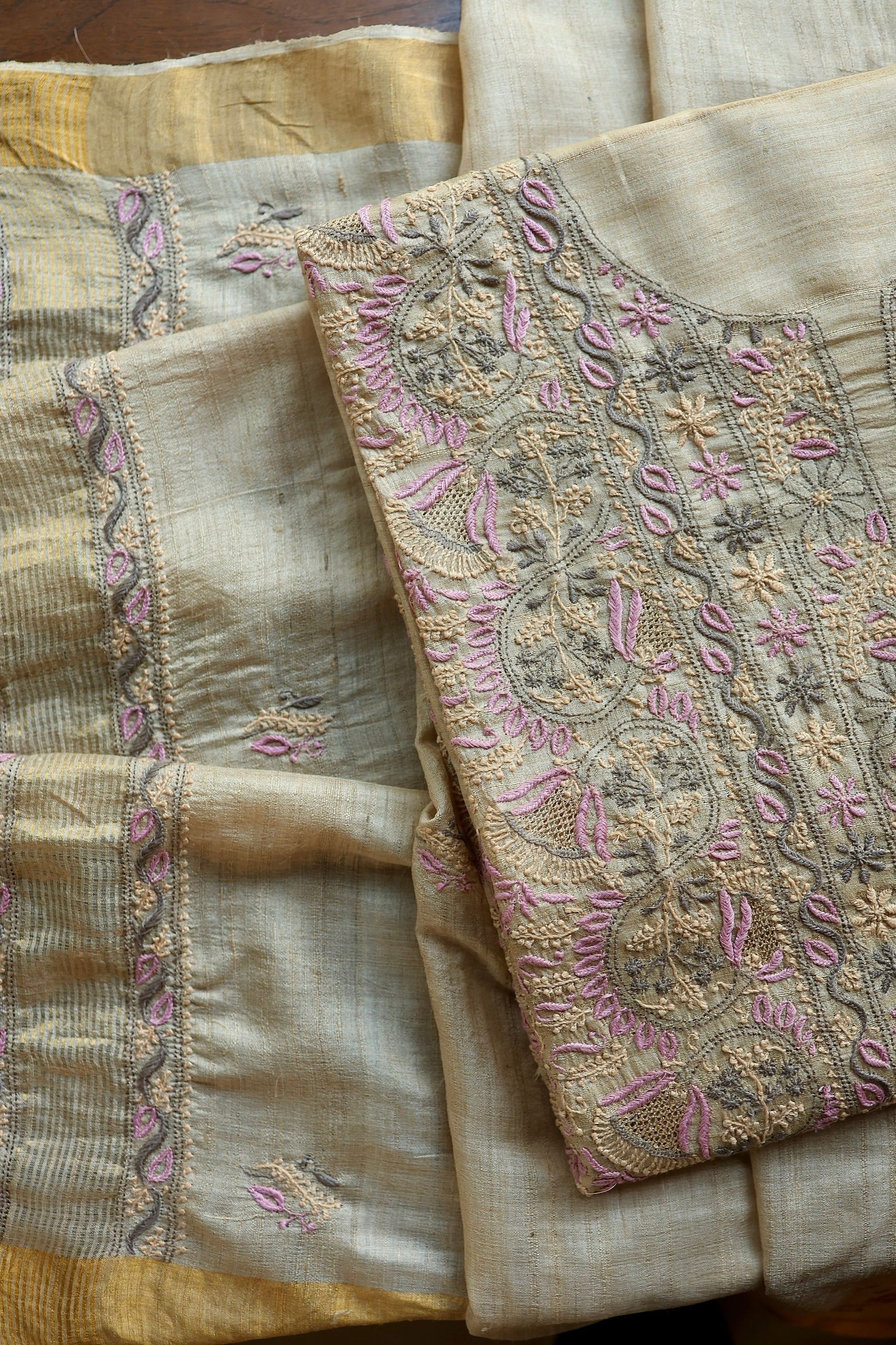 Natural & Mauve Shade Tussar Silk Natural Shade With Multi Thread Chikankari Fabric