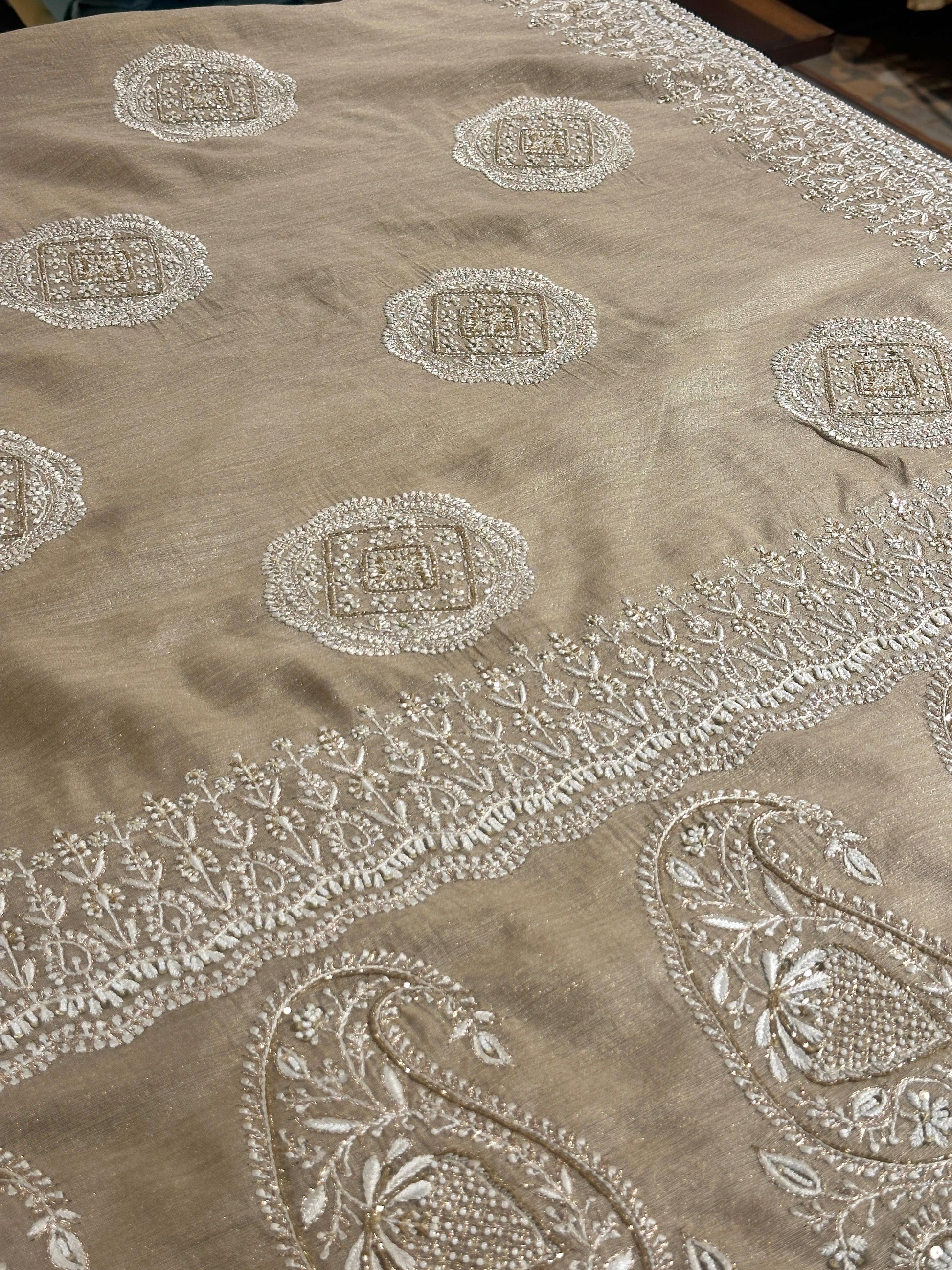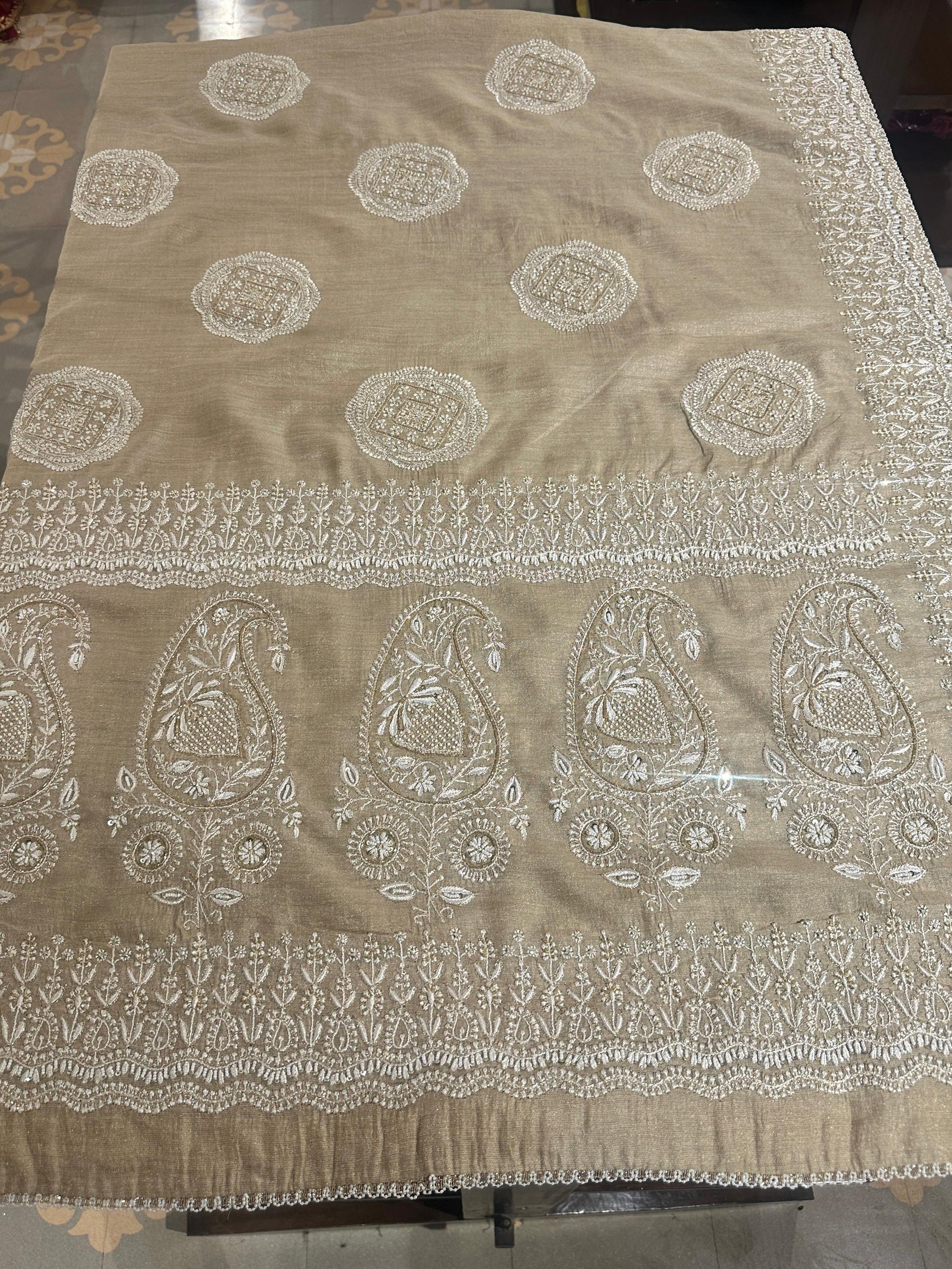 Fine Chikankari ari tissue silk dupatta done with natural intricate embroidery & sequins work on natural shade finished with tissue lace & tessels.