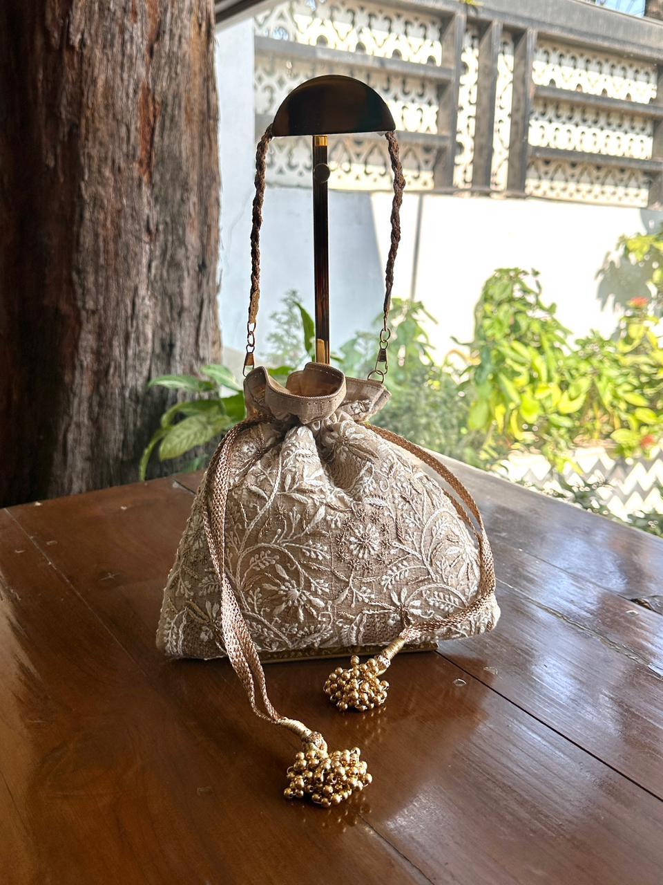 Potli bags on various silk (MOONGA/TUSSAR) fabric done with intricate Chikankari embroidery and ari/pitta, Mukaish work accessories with pearl tassels and zari sling handle to add dash to your outfit with classical Lucknowi essence.