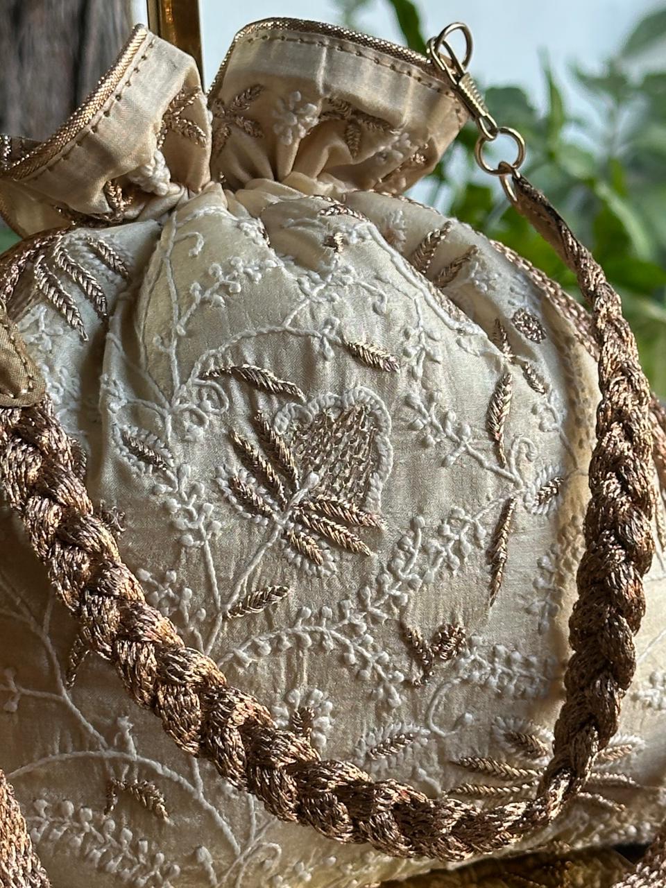 Potli bags on various silk (MOONGA/TUSSAR) fabric done with intricate Chikankari embroidery and ari/pitta, Mukaish work accessories with pearl tassels and zari sling handle to add dash to your outfit with classical Lucknowi essence.