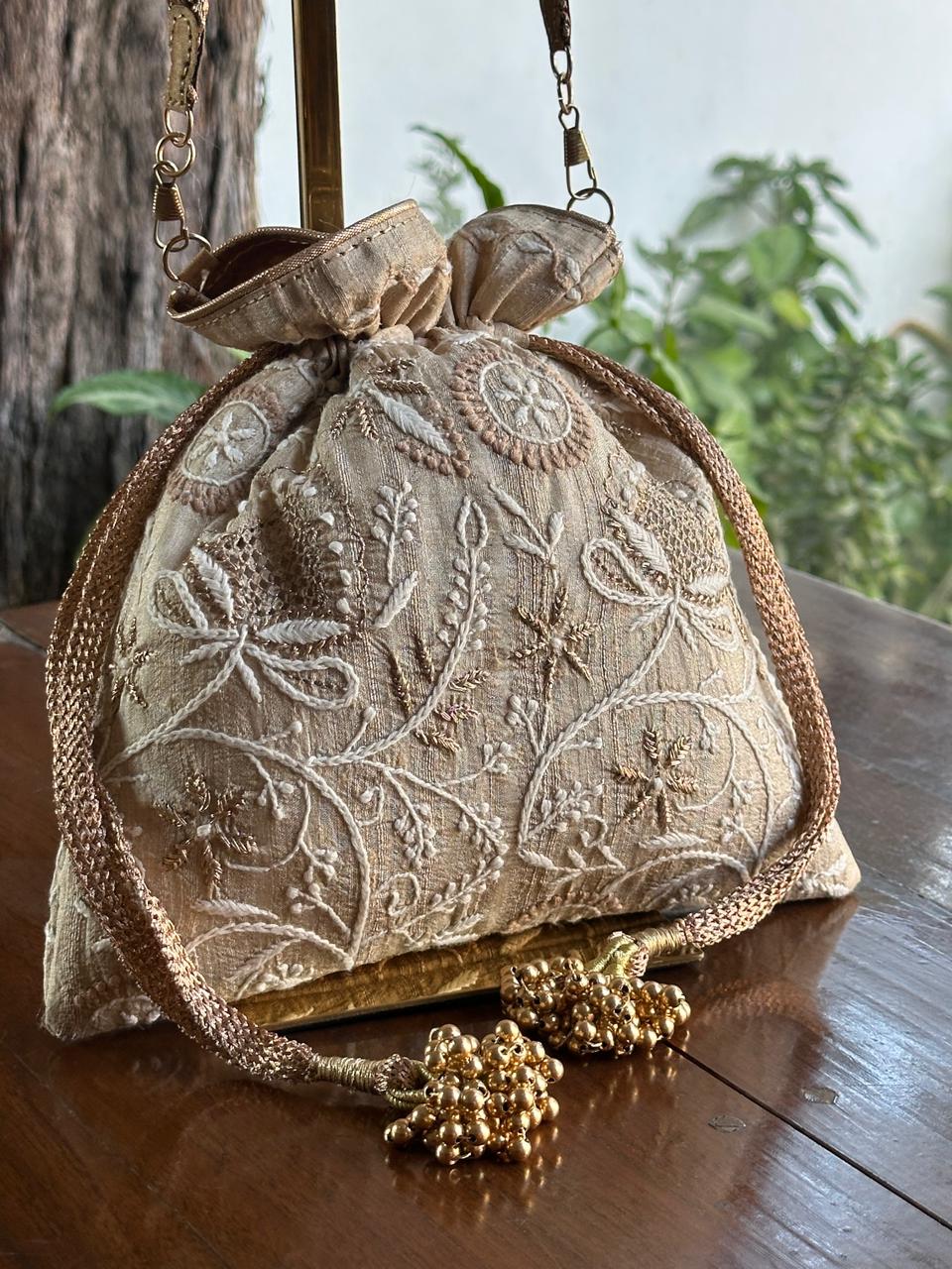 Potli bags on various silk (MOONGA/TUSSAR) fabric done with intricate Chikankari embroidery and ari/pitta, Mukaish work accessories with pearl tassels and zari sling handle to add dash to your outfit with classical Lucknowi essence.
